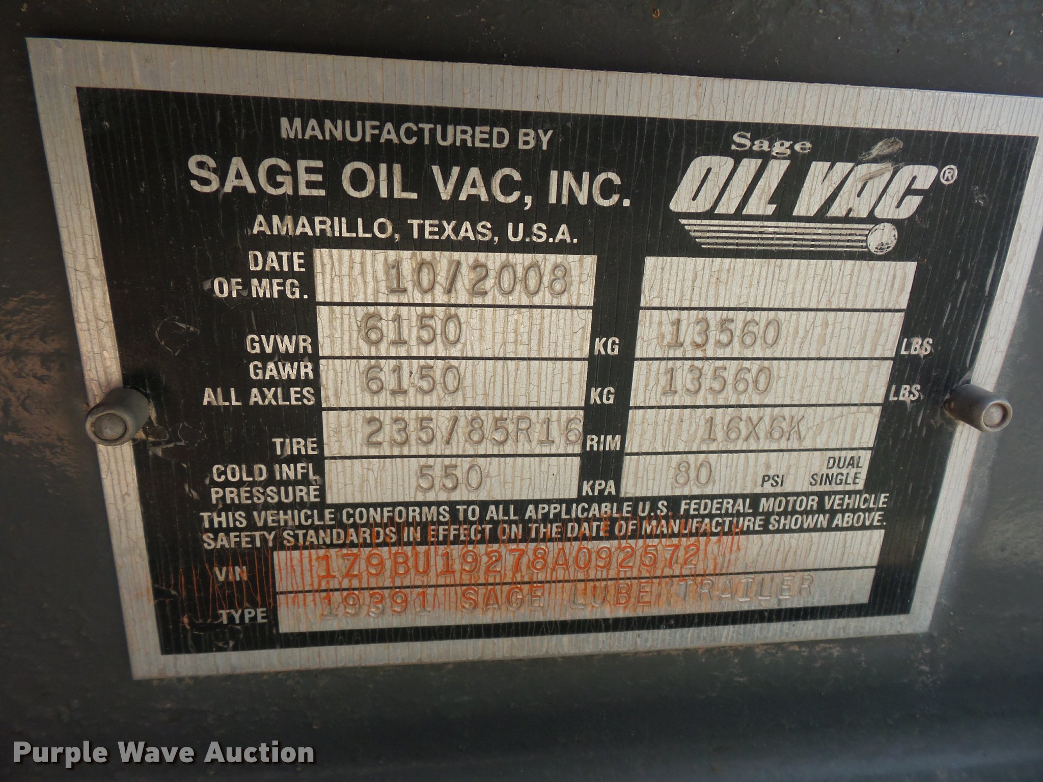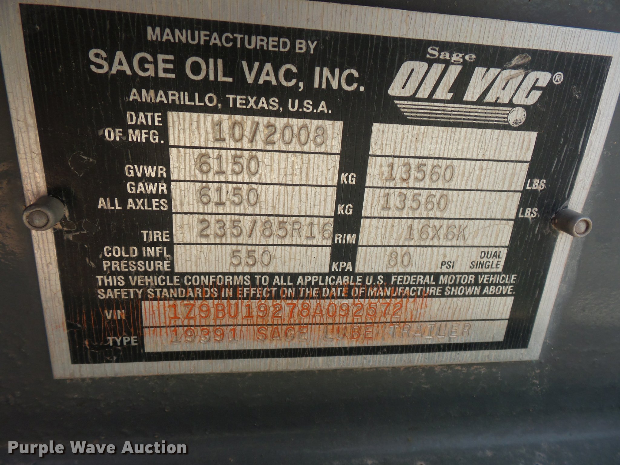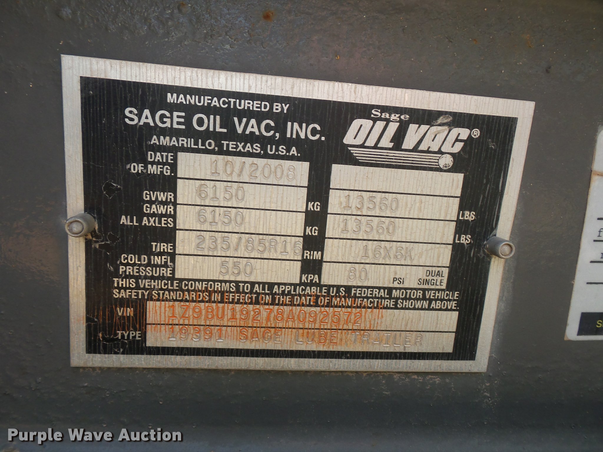 Purple Wave is selling a used Trailer Other in Missouri. This item is a 2008 Sage oil vacuum lube trailer with the following: 14'L x 77"W deck, Honda GX160 gas engine, (2) tanks, 120 gallon capacities, (3) hose reels, Tool box, Manual jack stand, 2 5/16" ball hitch, 235/85R16 tires, GVWR 13,560 lbs, GAWR 6,150 lbs, Spring suspension, Non-operational unit, Parts missing