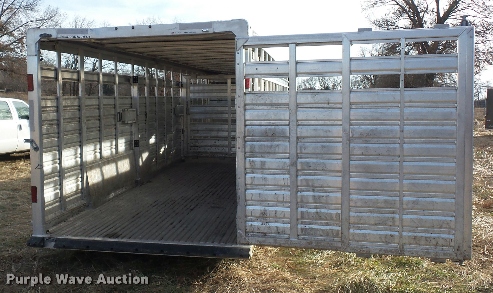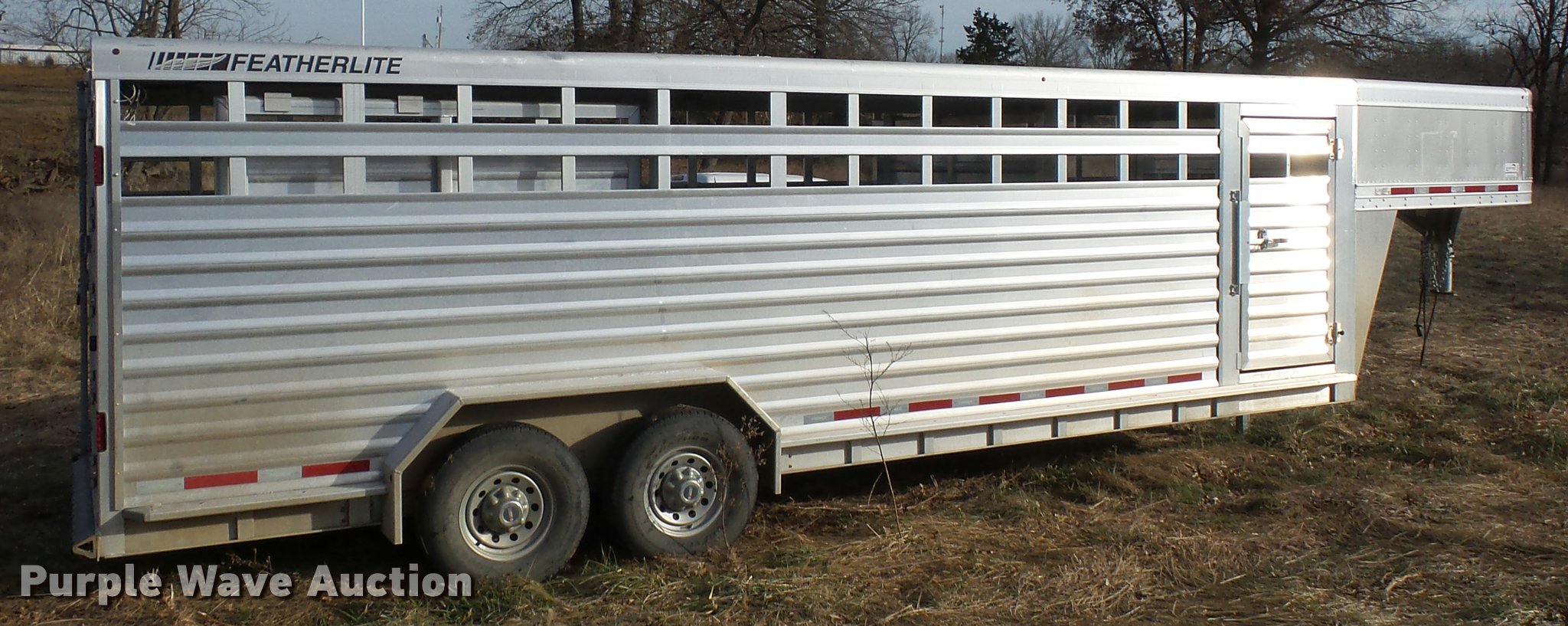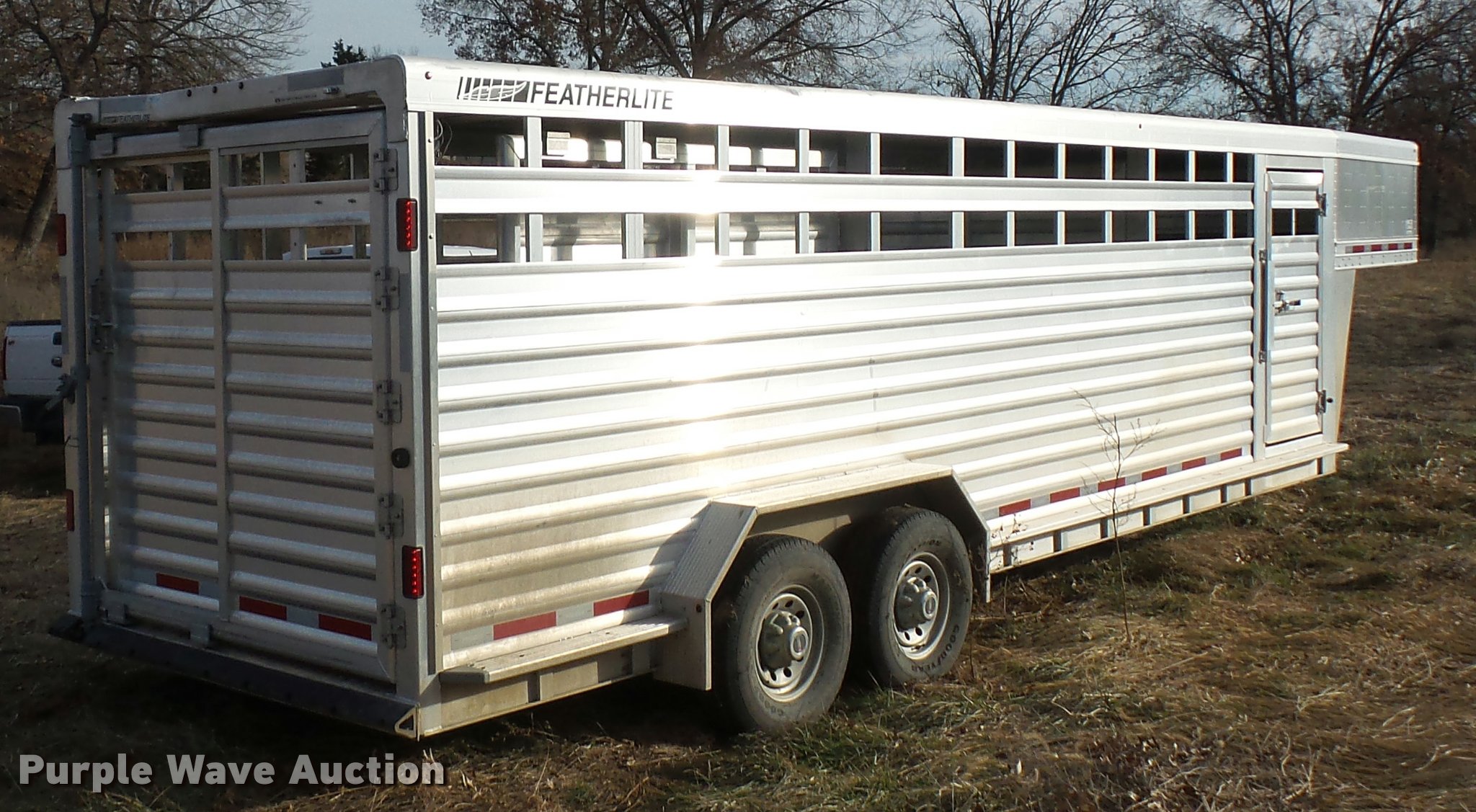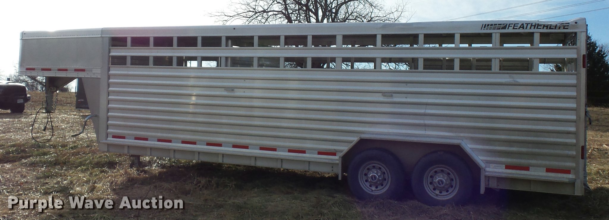 Purple Wave is selling a used Livestock Trailer in Missouri. This item is a 2014 Featherlite livestock trailer with the following: 24'L, 7'L lower deck, Manual jack stand, Gooseneck hitch, 235/80R16 tires, GVWR 14,000 lbs, Spring suspension, Electric brakes