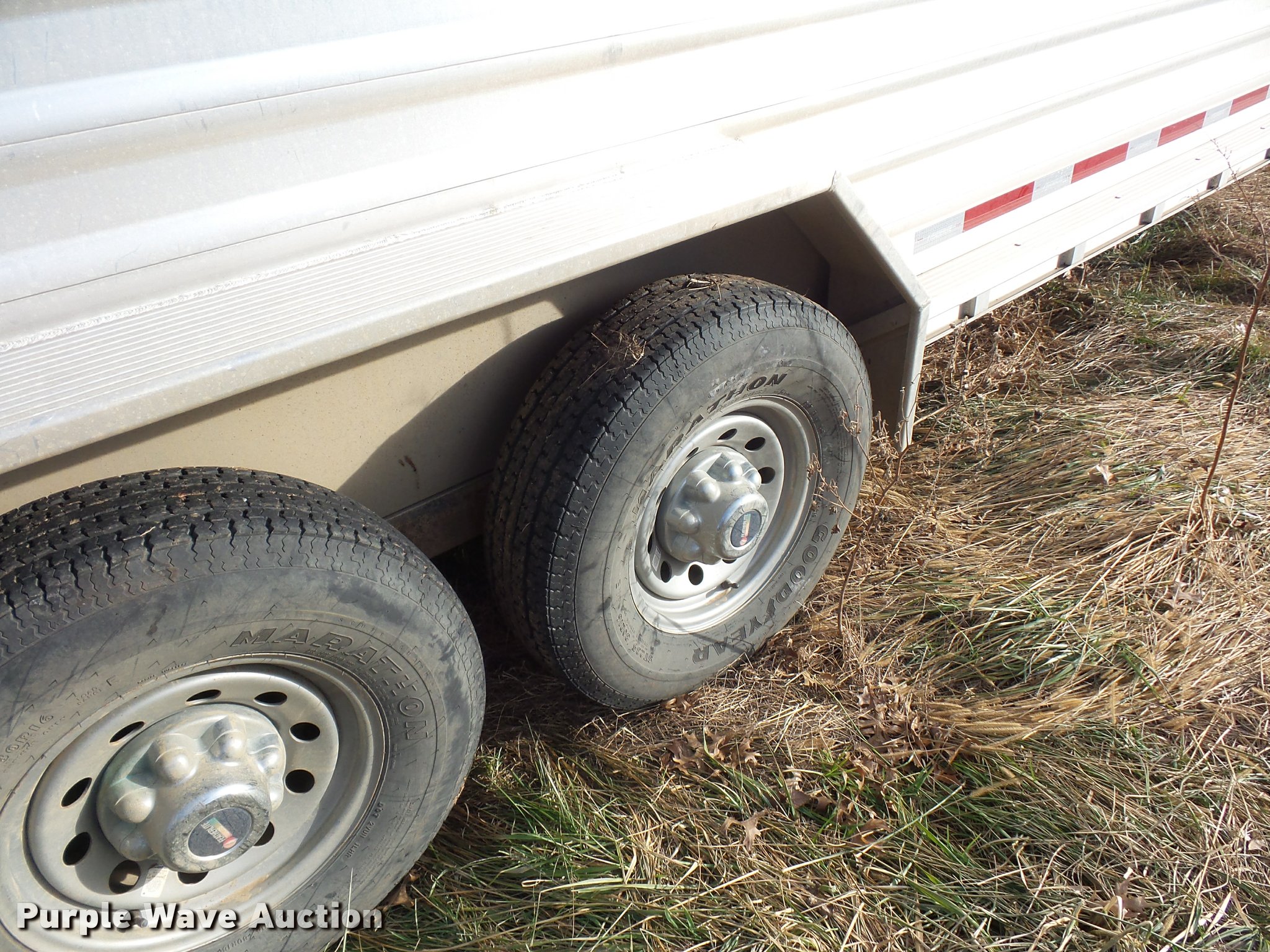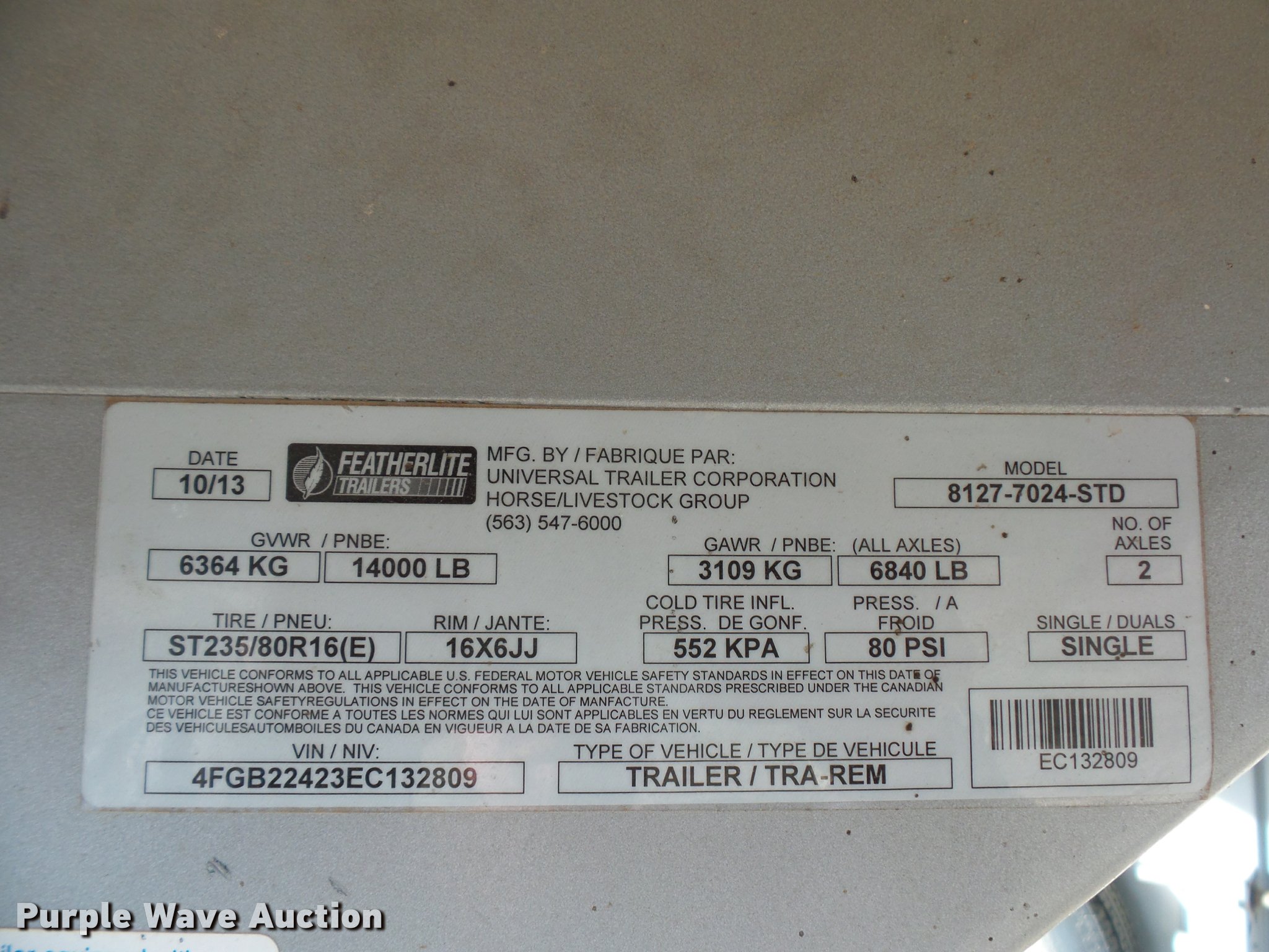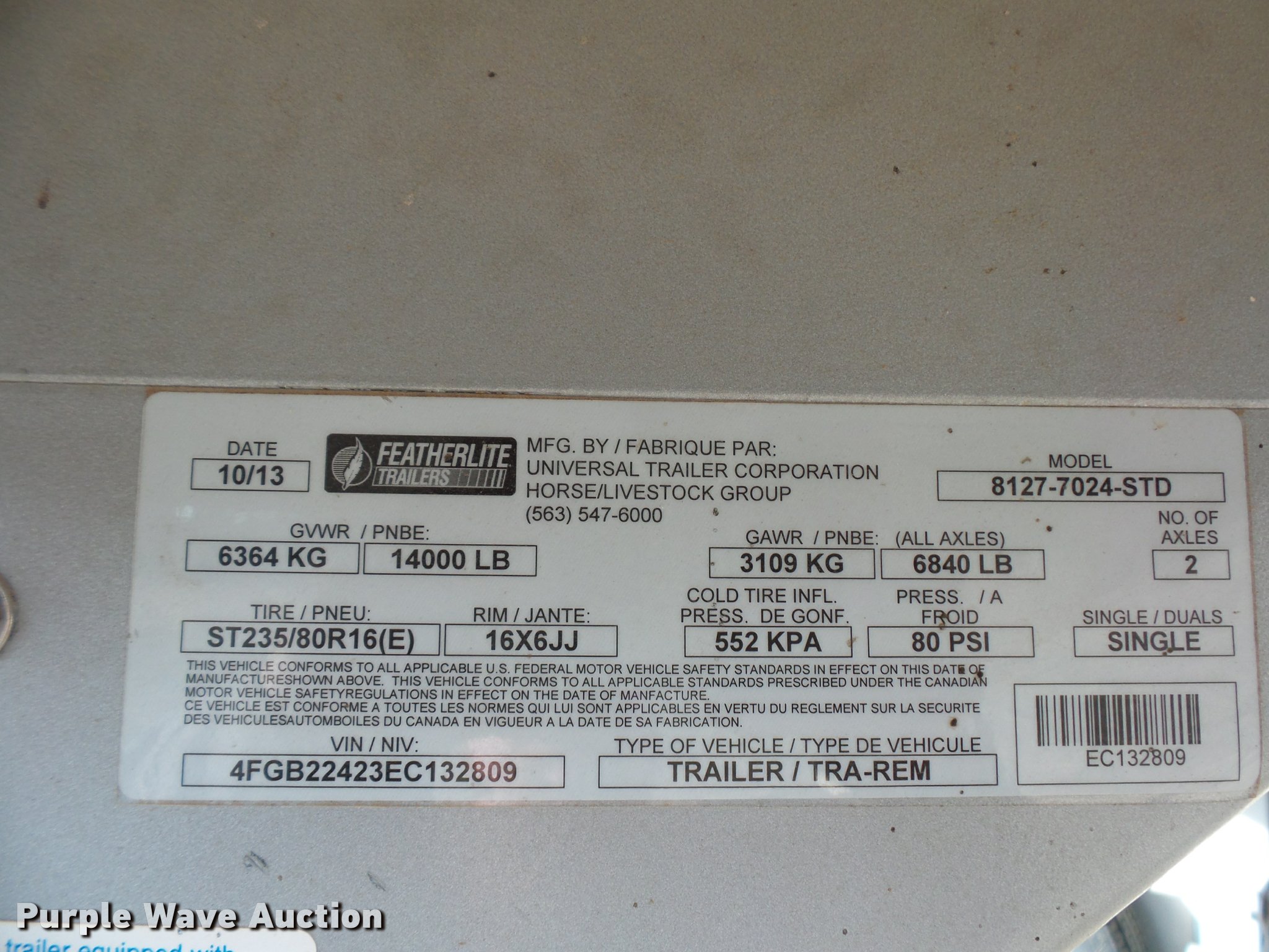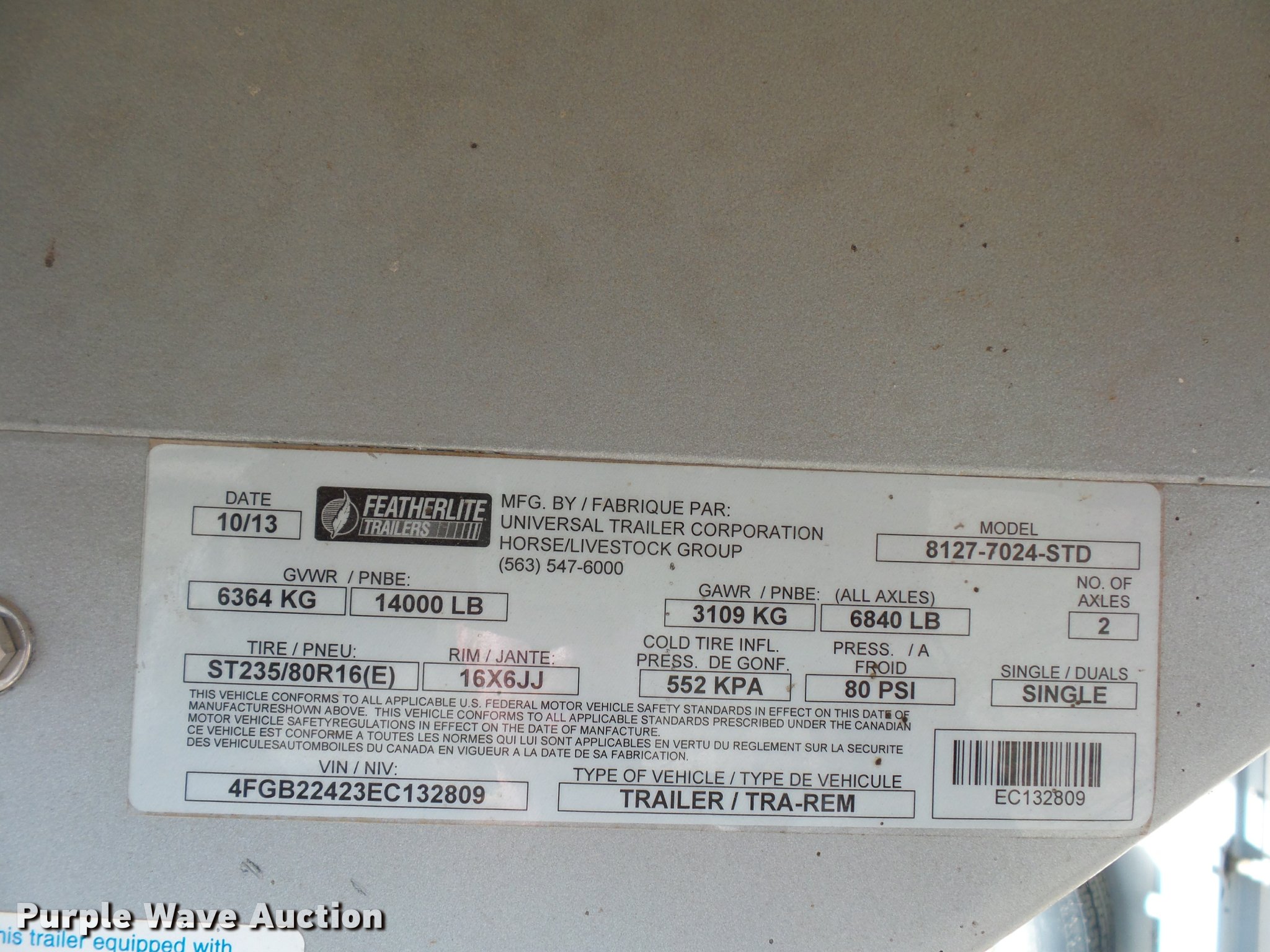 Purple Wave is selling a used Livestock Trailer in Missouri. This item is a 2014 Featherlite livestock trailer with the following: 24'L, 7'L lower deck, Manual jack stand, Gooseneck hitch, 235/80R16 tires, GVWR 14,000 lbs, Spring suspension, Electric brakes