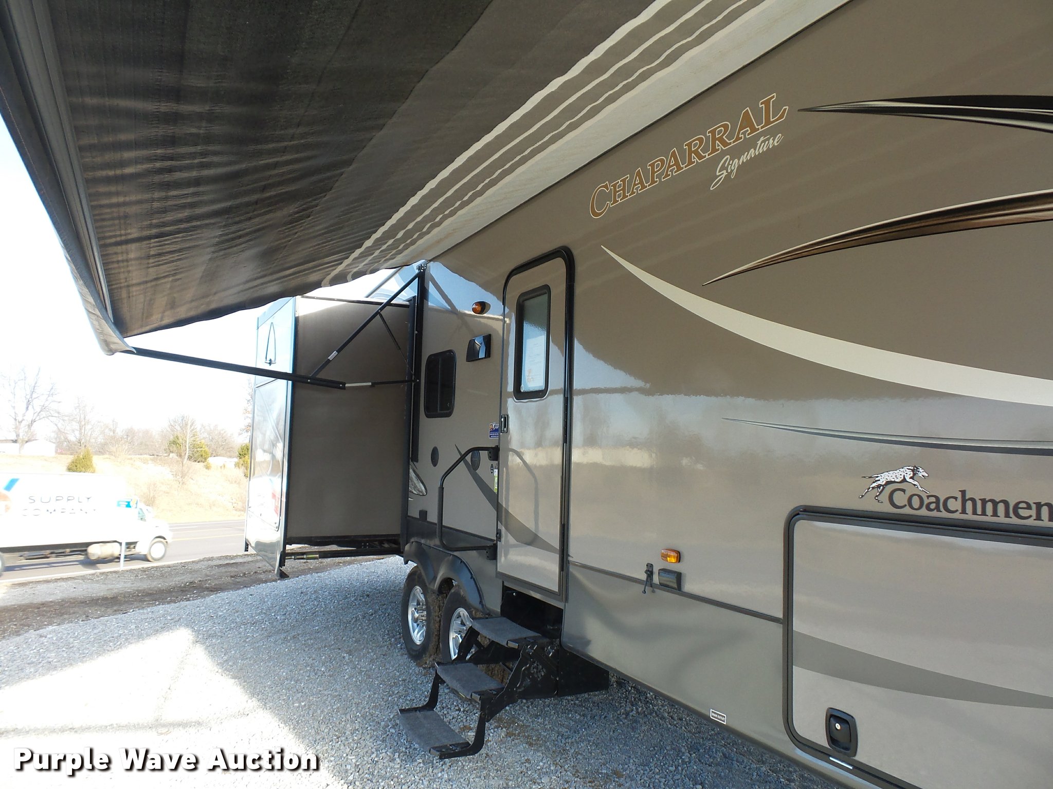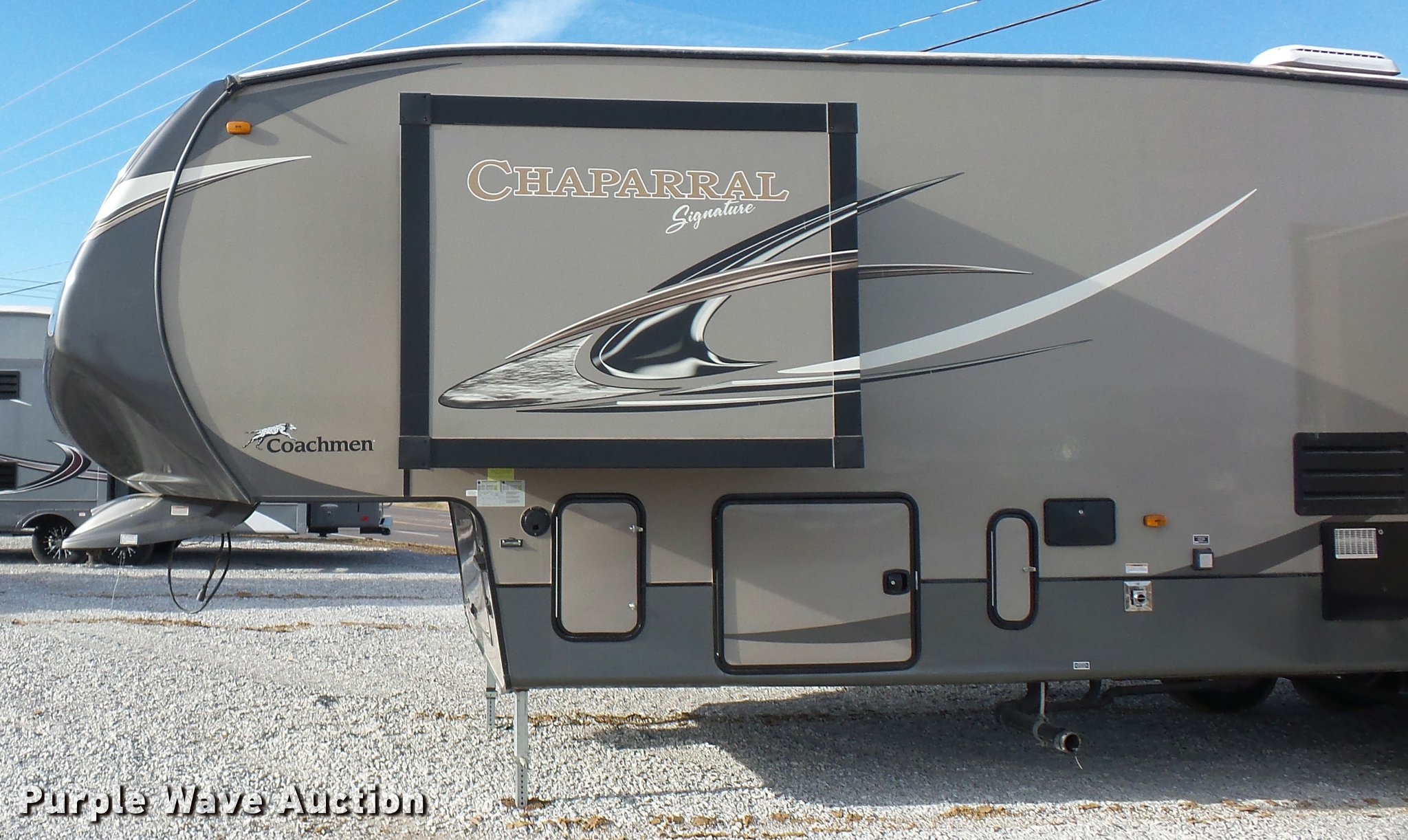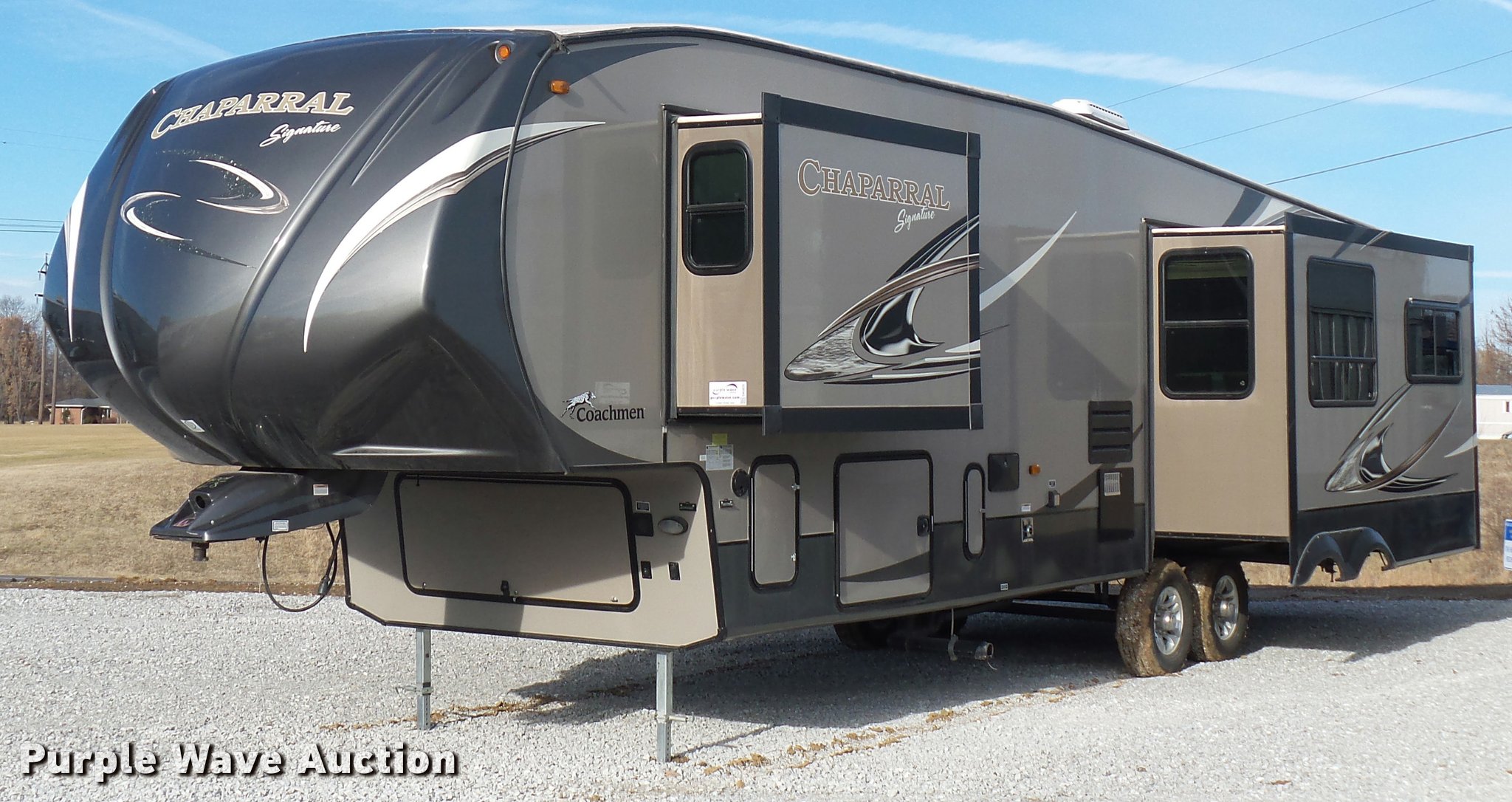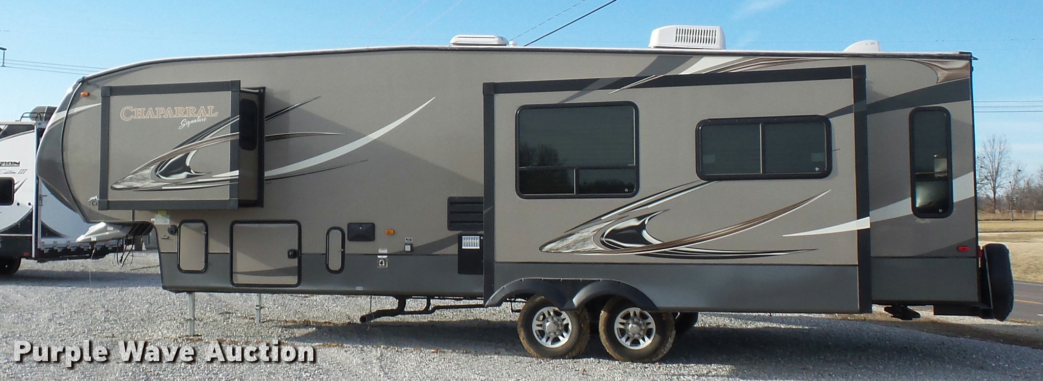Purple Wave is selling a used RV in Missouri. This item is a 2013 Chaparral Signature camper with the following: 38'L, (3) slide-outs, Awning, Stove, Refrigerator/freezer, Sink, Microwave, Fireplace, Television, Bathroom, Shower, Sink, Toilet, Exterior kitchen, Manual jack, Fifth wheel plate, 235/80R16 tires, GVWR 13,900 lbs, GAWR 6,000 lbs