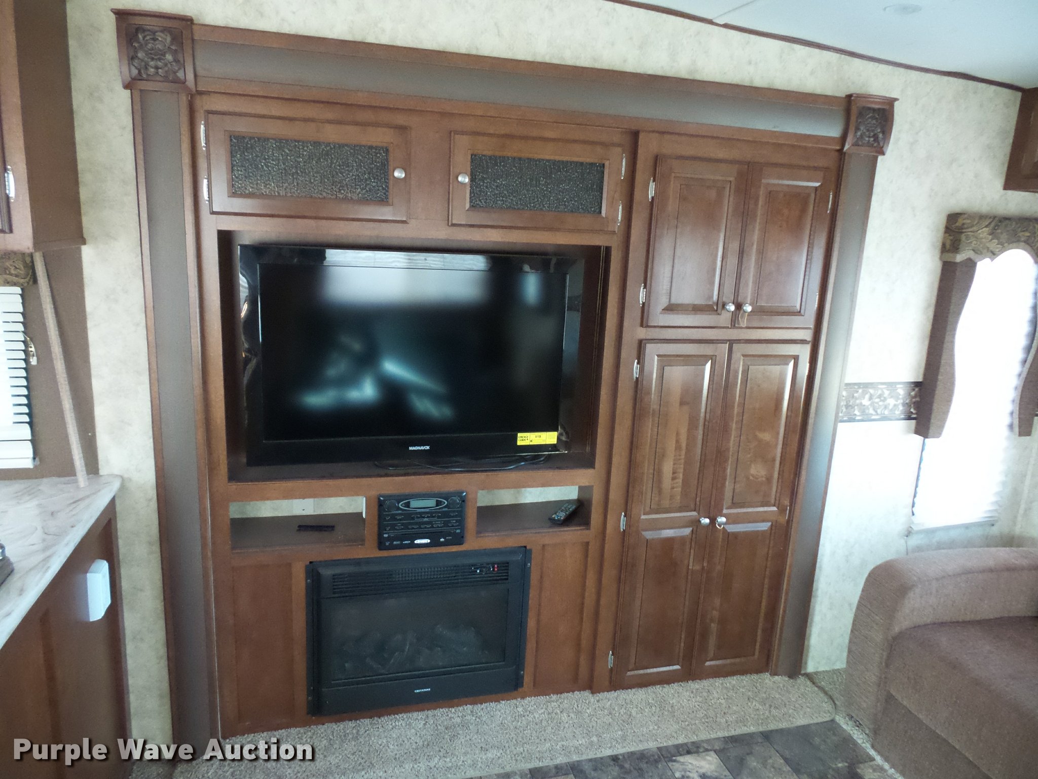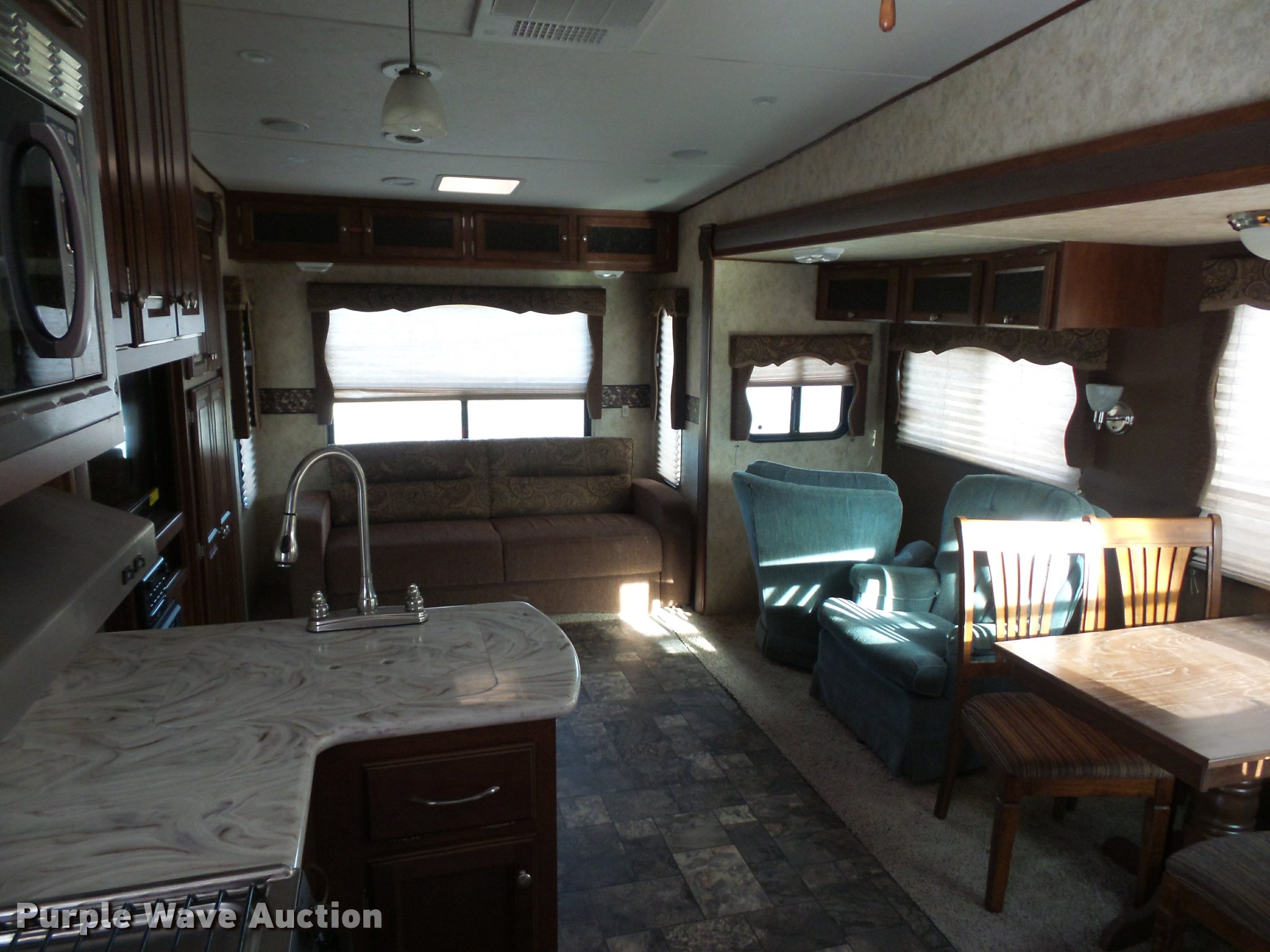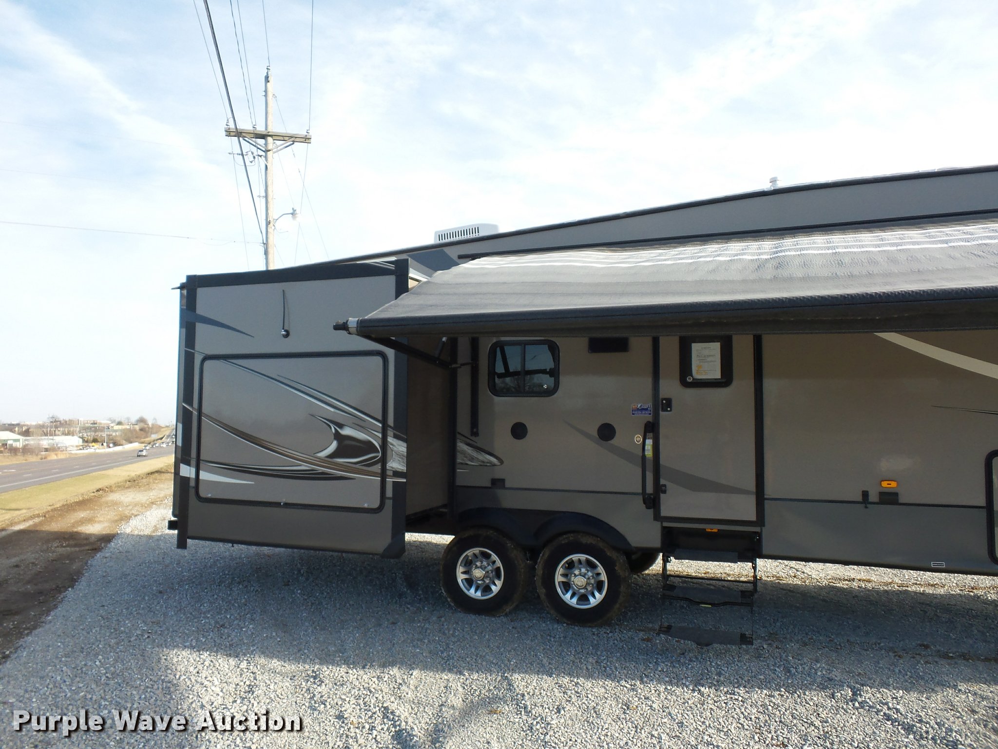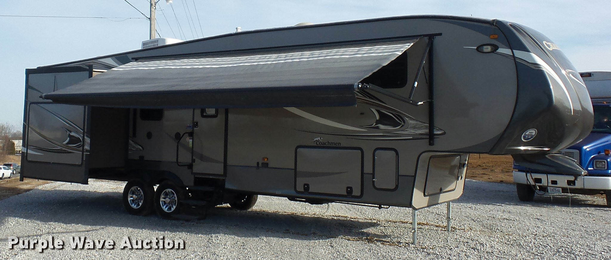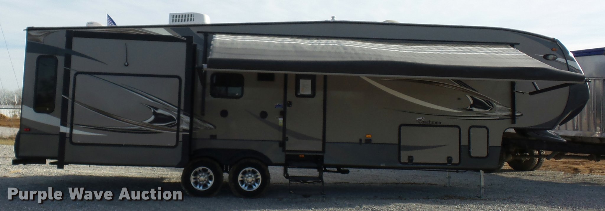 Purple Wave is selling a used RV in Missouri. This item is a 2013 Chaparral Signature camper with the following: 38'L, (3) slide-outs, Awning, Stove, Refrigerator/freezer, Sink, Microwave, Fireplace, Television, Bathroom, Shower, Sink, Toilet, Exterior kitchen, Manual jack, Fifth wheel plate, 235/80R16 tires, GVWR 13,900 lbs, GAWR 6,000 lbs