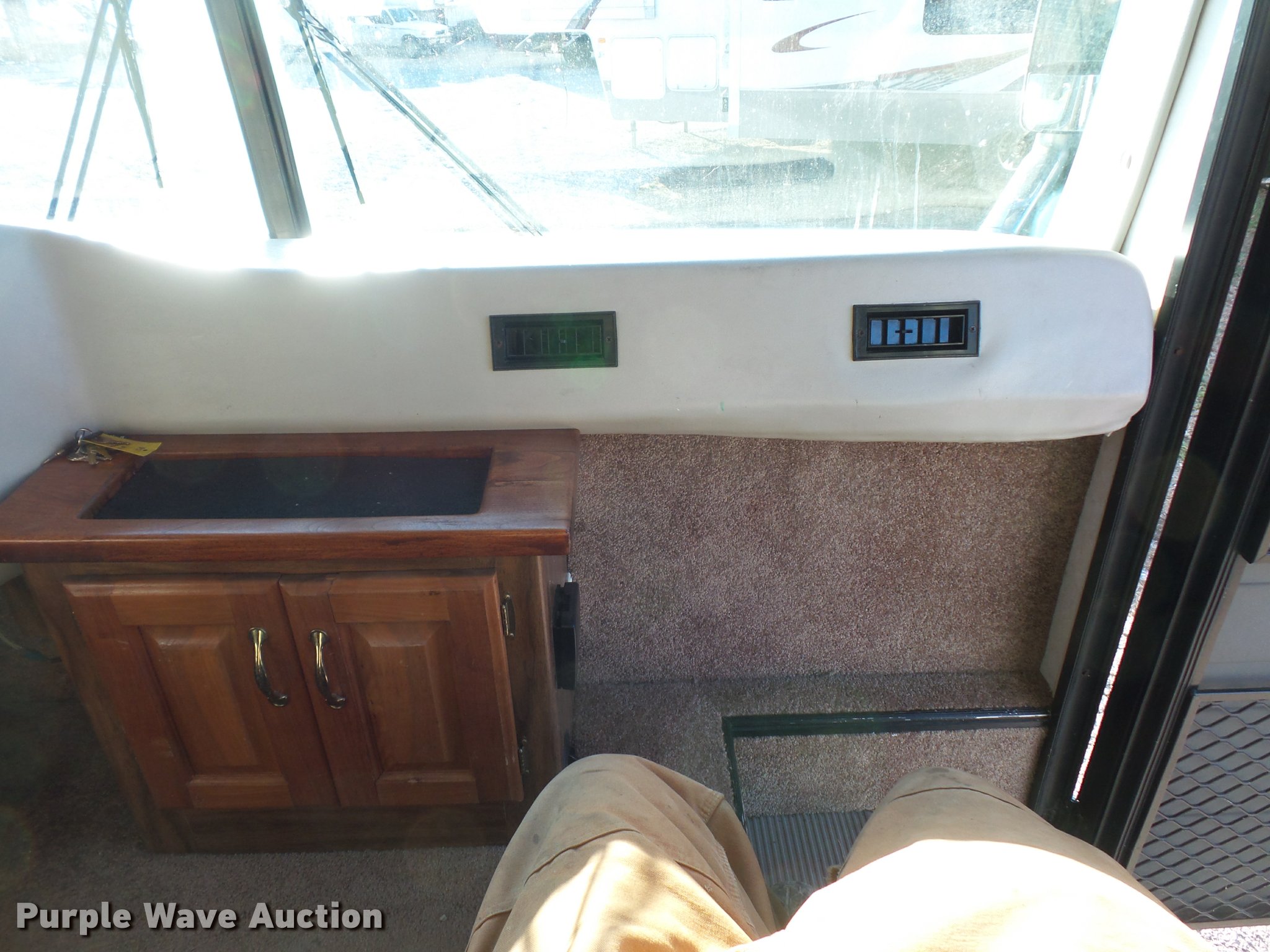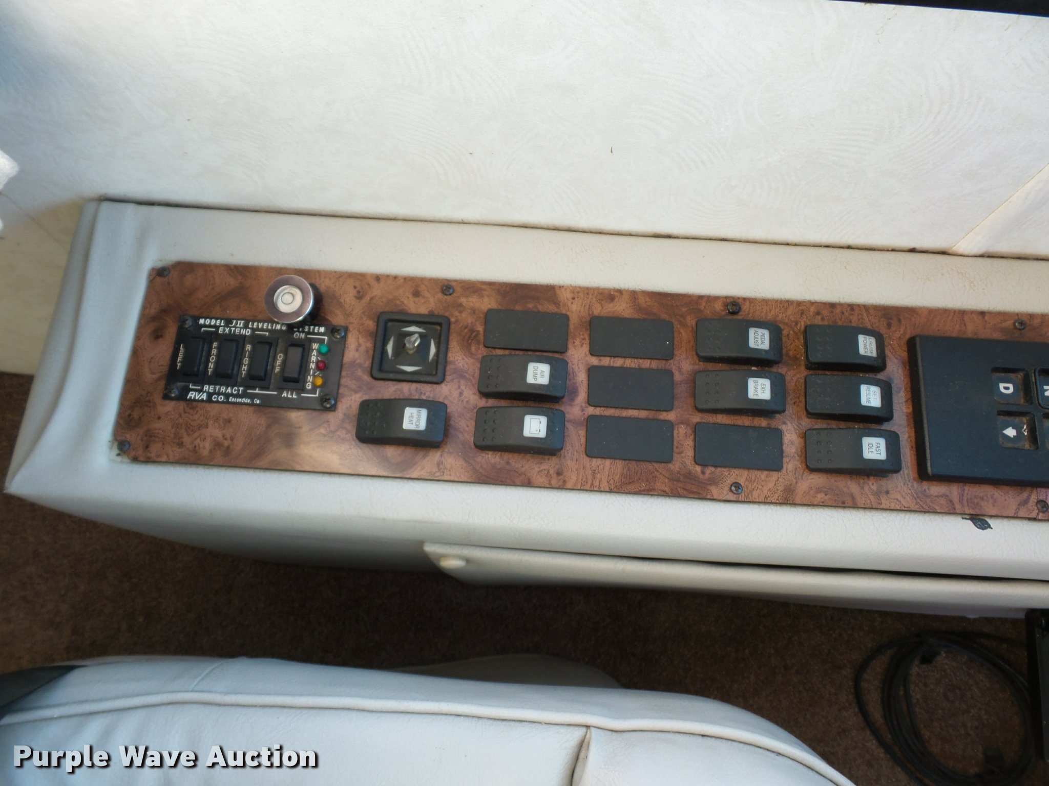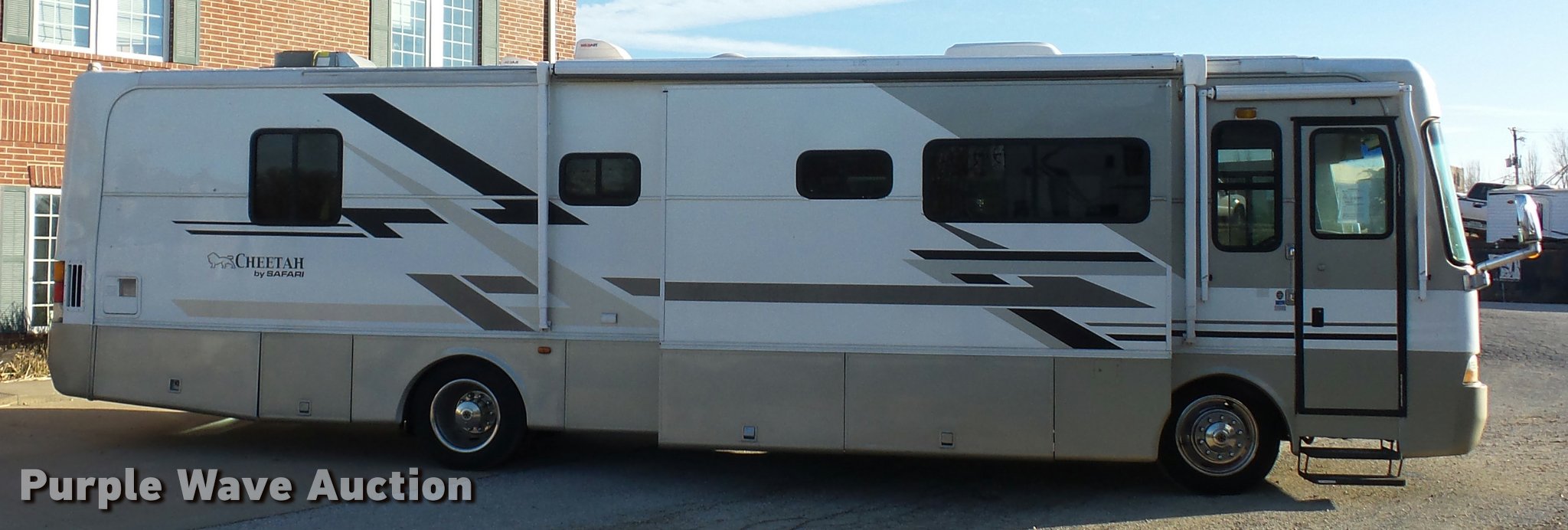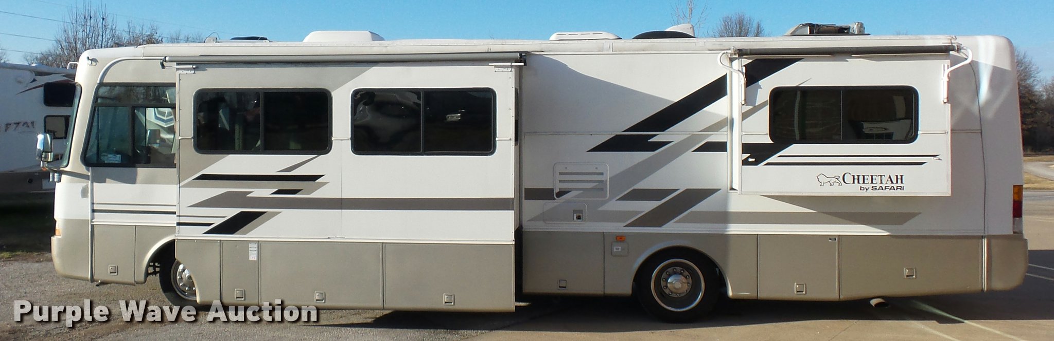 Purple Wave is selling a used RV in Missouri. This item is a 2003 Safari Cheetah RV with the following: 30,140 miles on odometer, Caterpillar 3126 7.2L L6 turbo diesel engine, Automatic transmission, AM/FM/CD, Leather interior, Kitchen, Stove, Microwave, Refrigerator/freezer, Sink, Bathroom, Shower, Toilet, Sink, Onan Quiet Diesel 7500 generator, 621 hours on meter, Awning, Auto leveling, Receiver hitch, 255/70R22.5 tires, Some interior lights inoperable