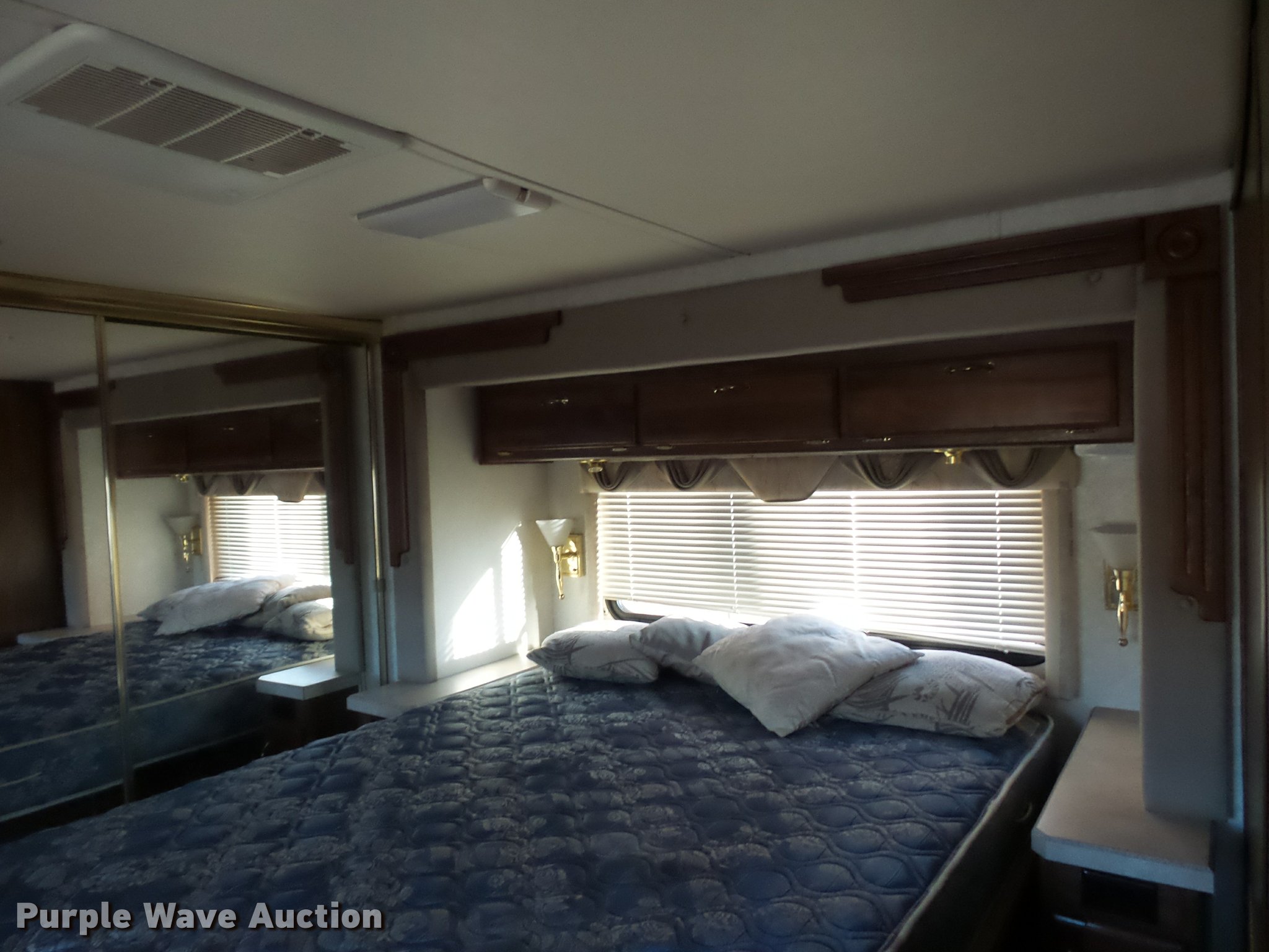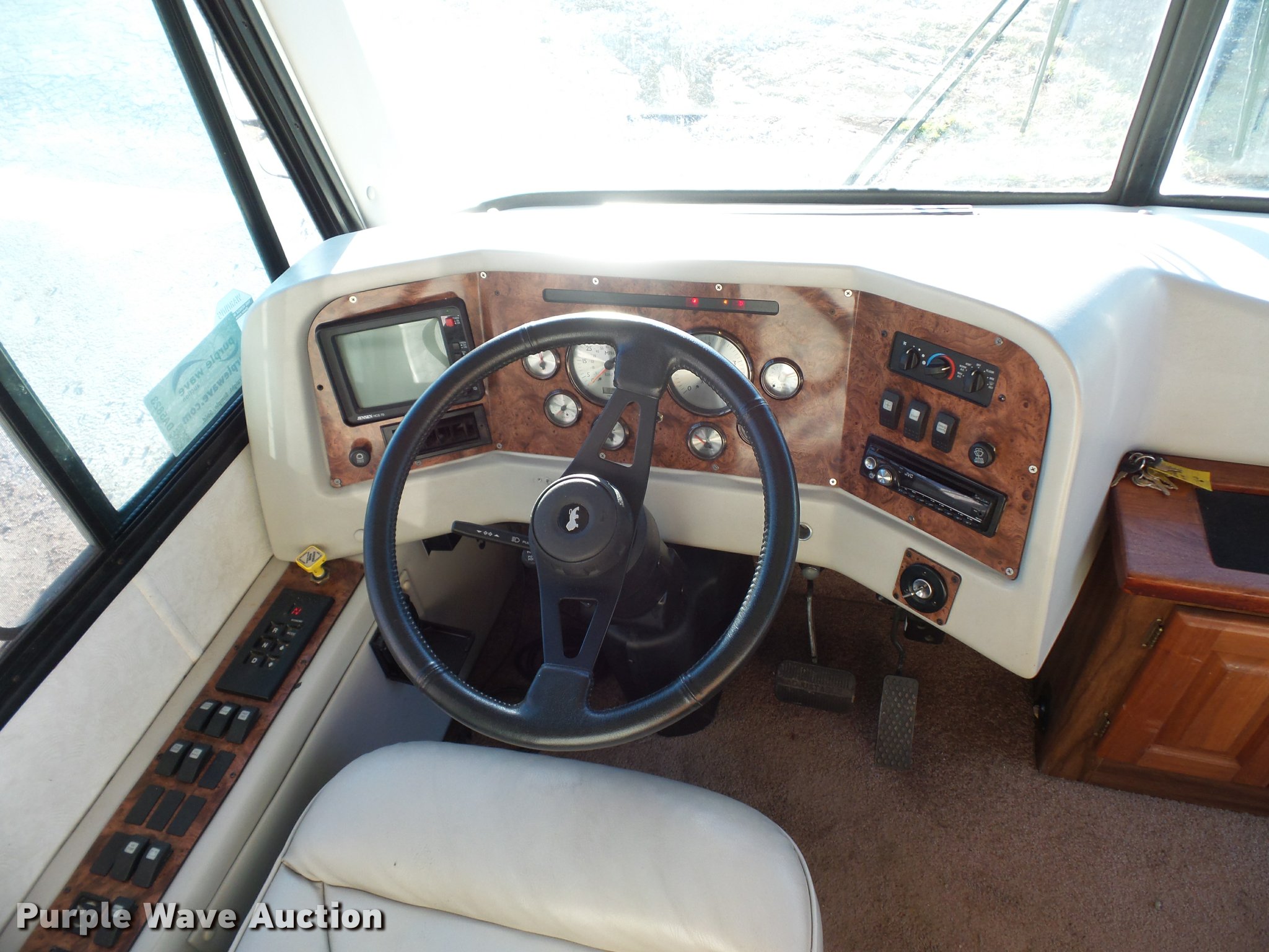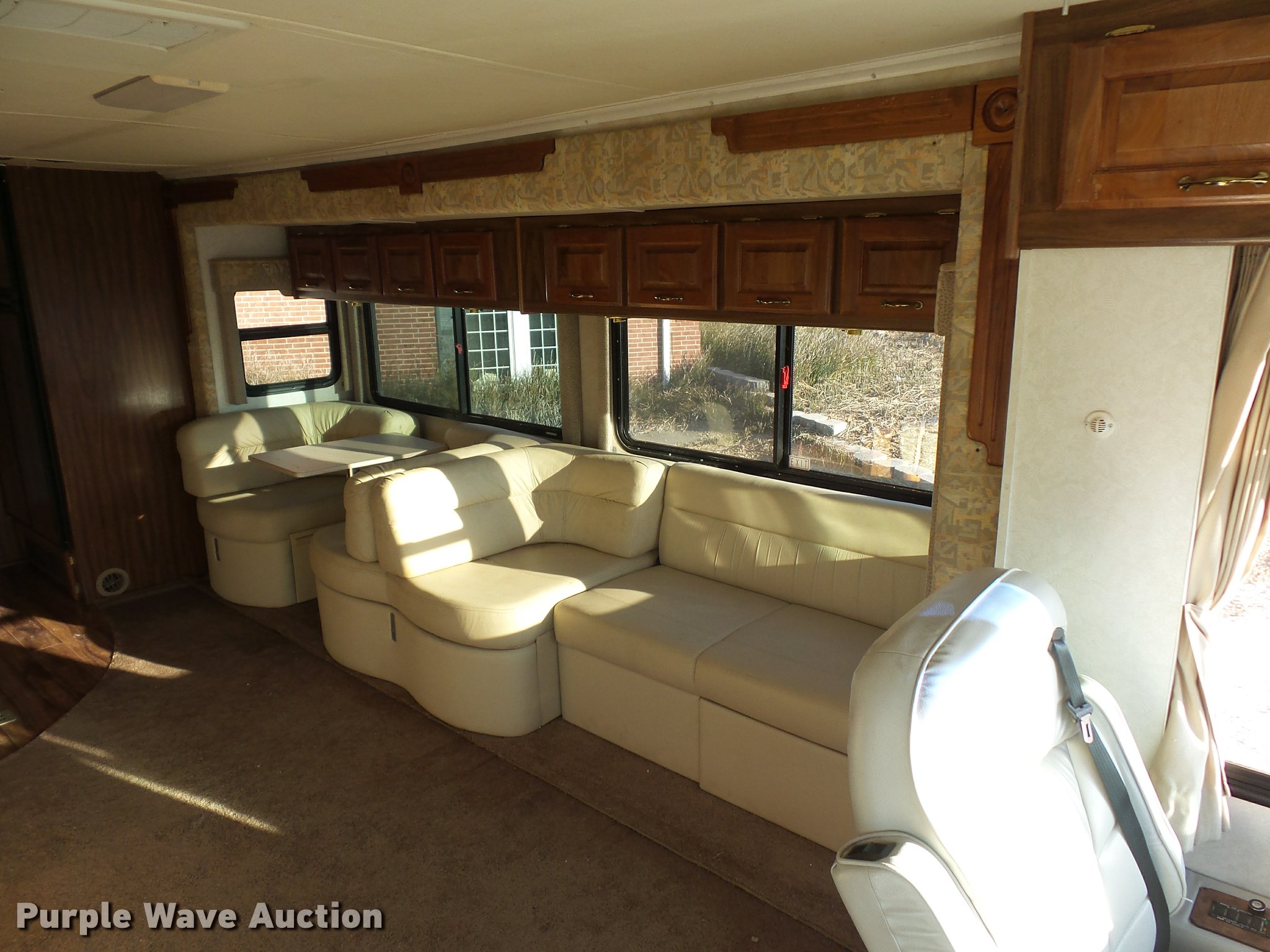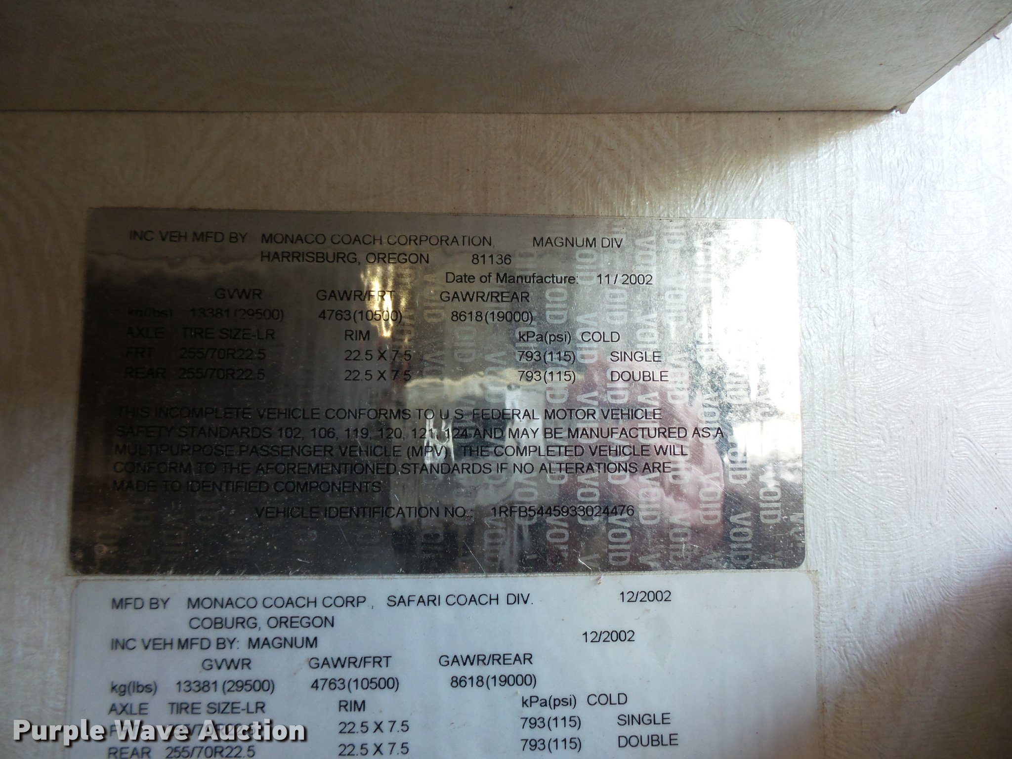 Purple Wave is selling a used RV in Missouri. This item is a 2003 Safari Cheetah RV with the following: 30,140 miles on odometer, Caterpillar 3126 7.2L L6 turbo diesel engine, Automatic transmission, AM/FM/CD, Leather interior, Kitchen, Stove, Microwave, Refrigerator/freezer, Sink, Bathroom, Shower, Toilet, Sink, Onan Quiet Diesel 7500 generator, 621 hours on meter, Awning, Auto leveling, Receiver hitch, 255/70R22.5 tires, Some interior lights inoperable