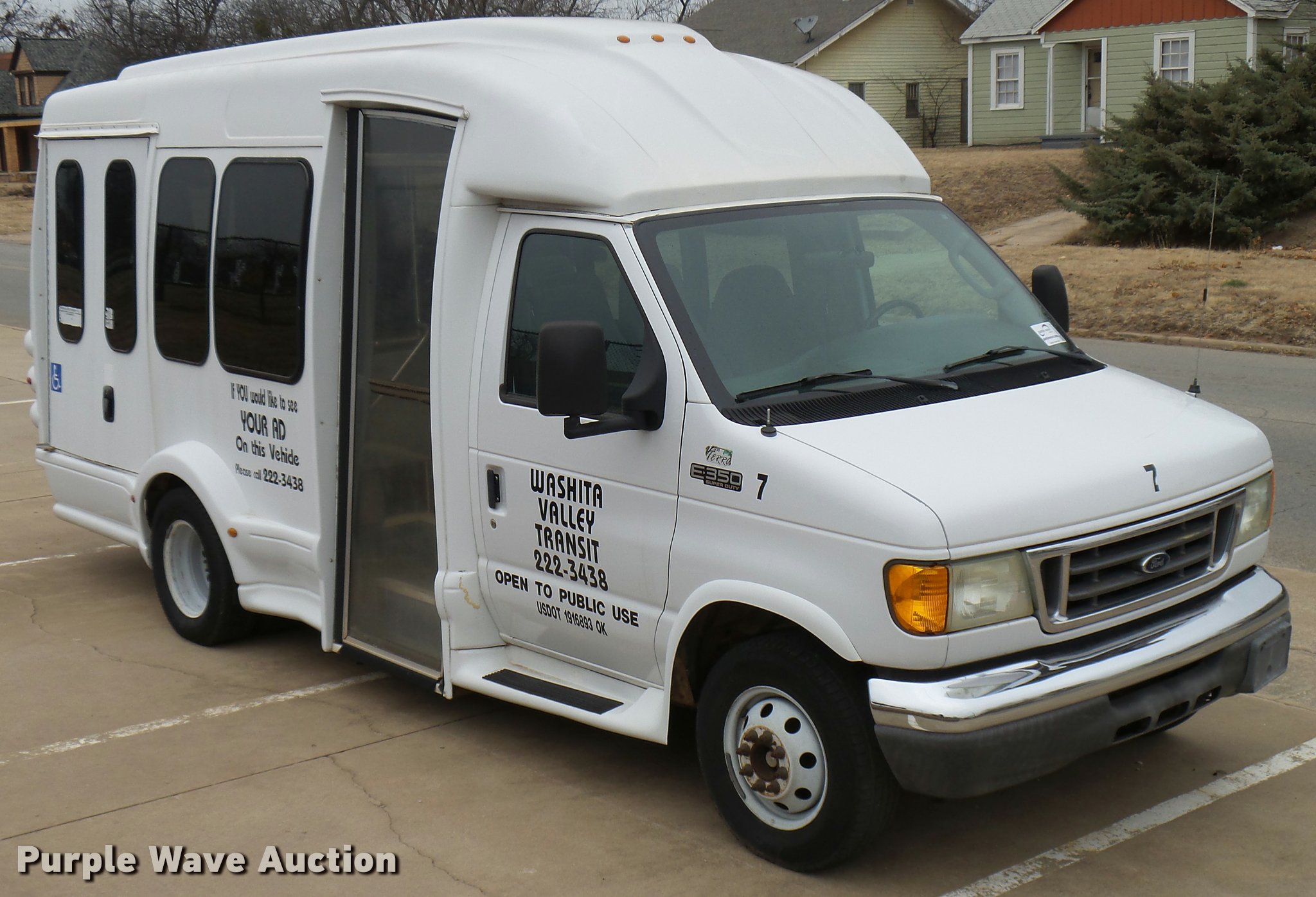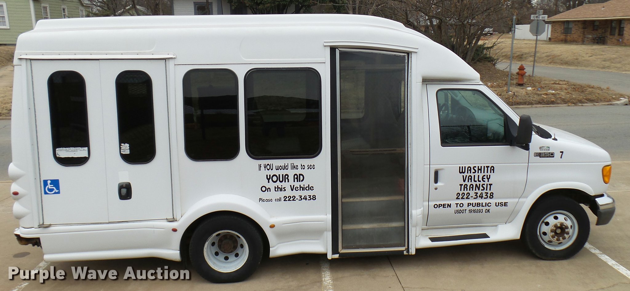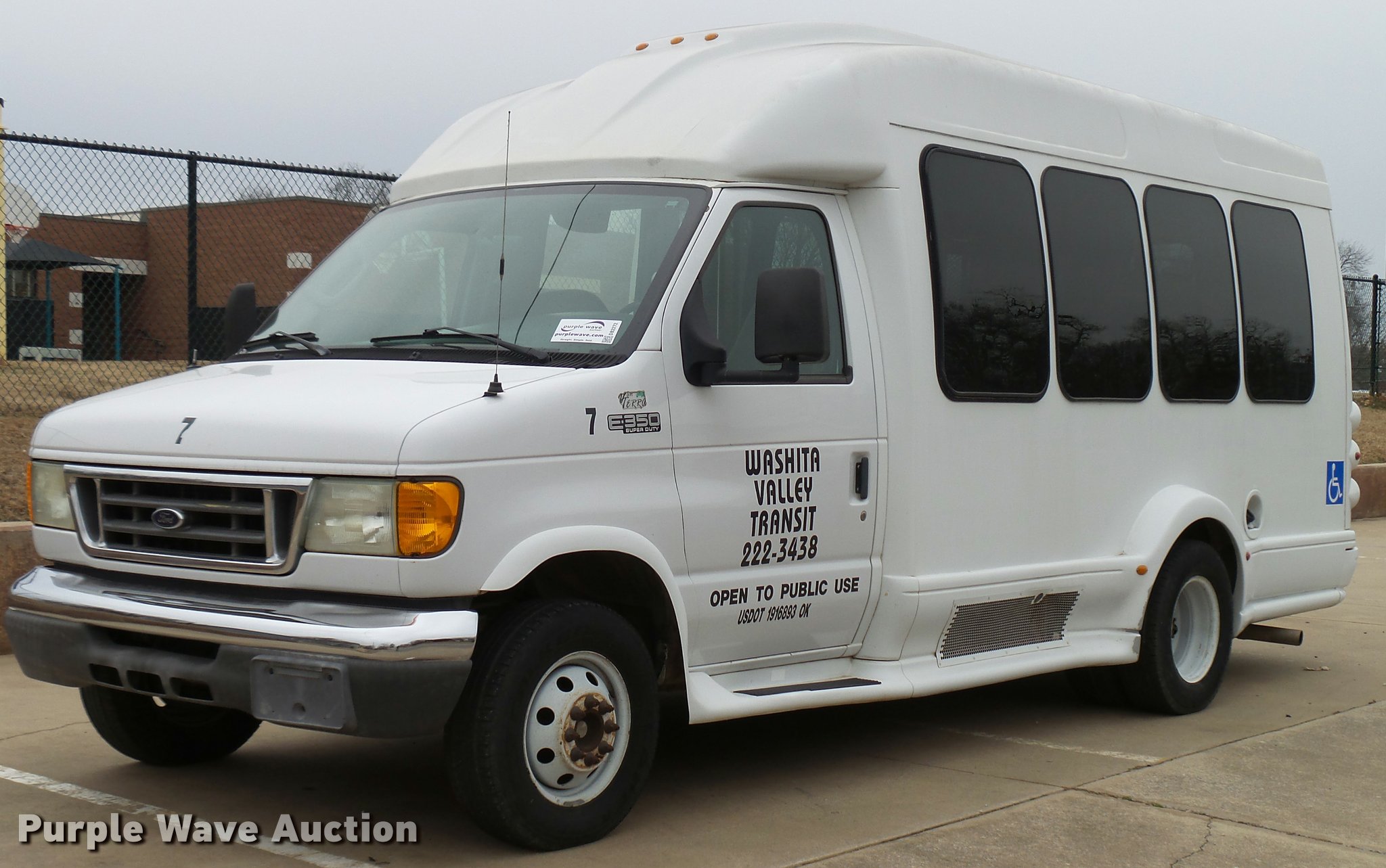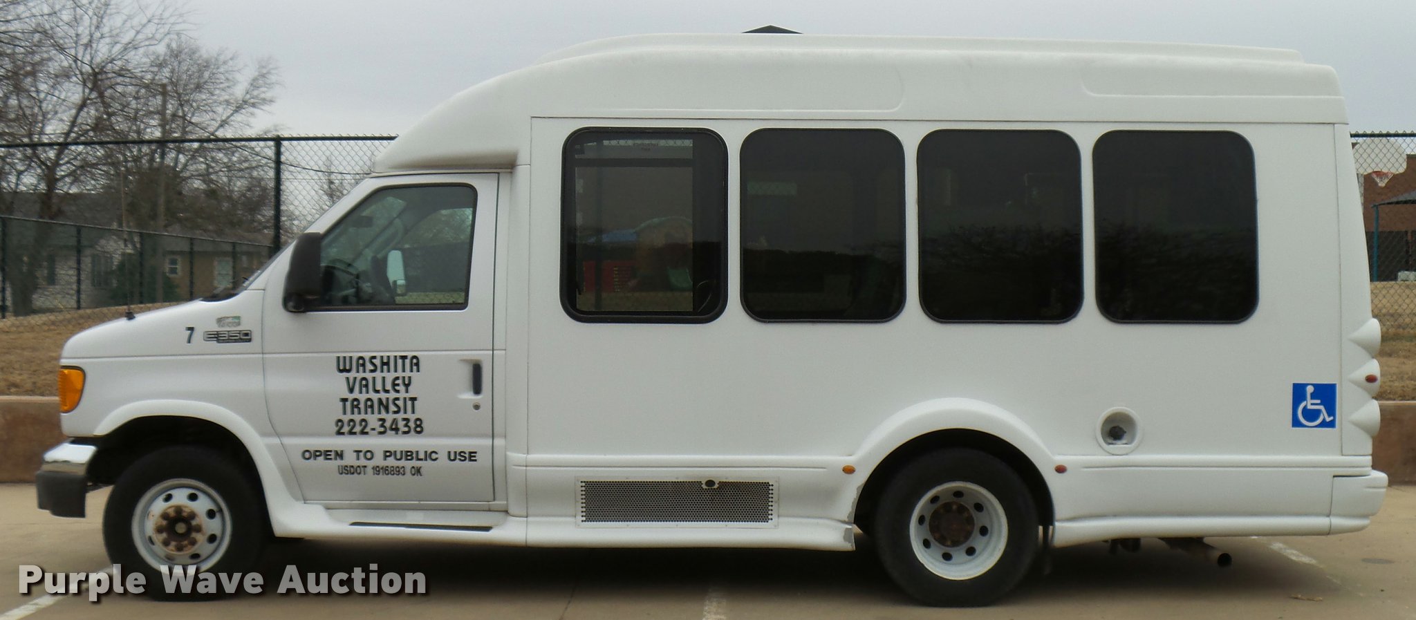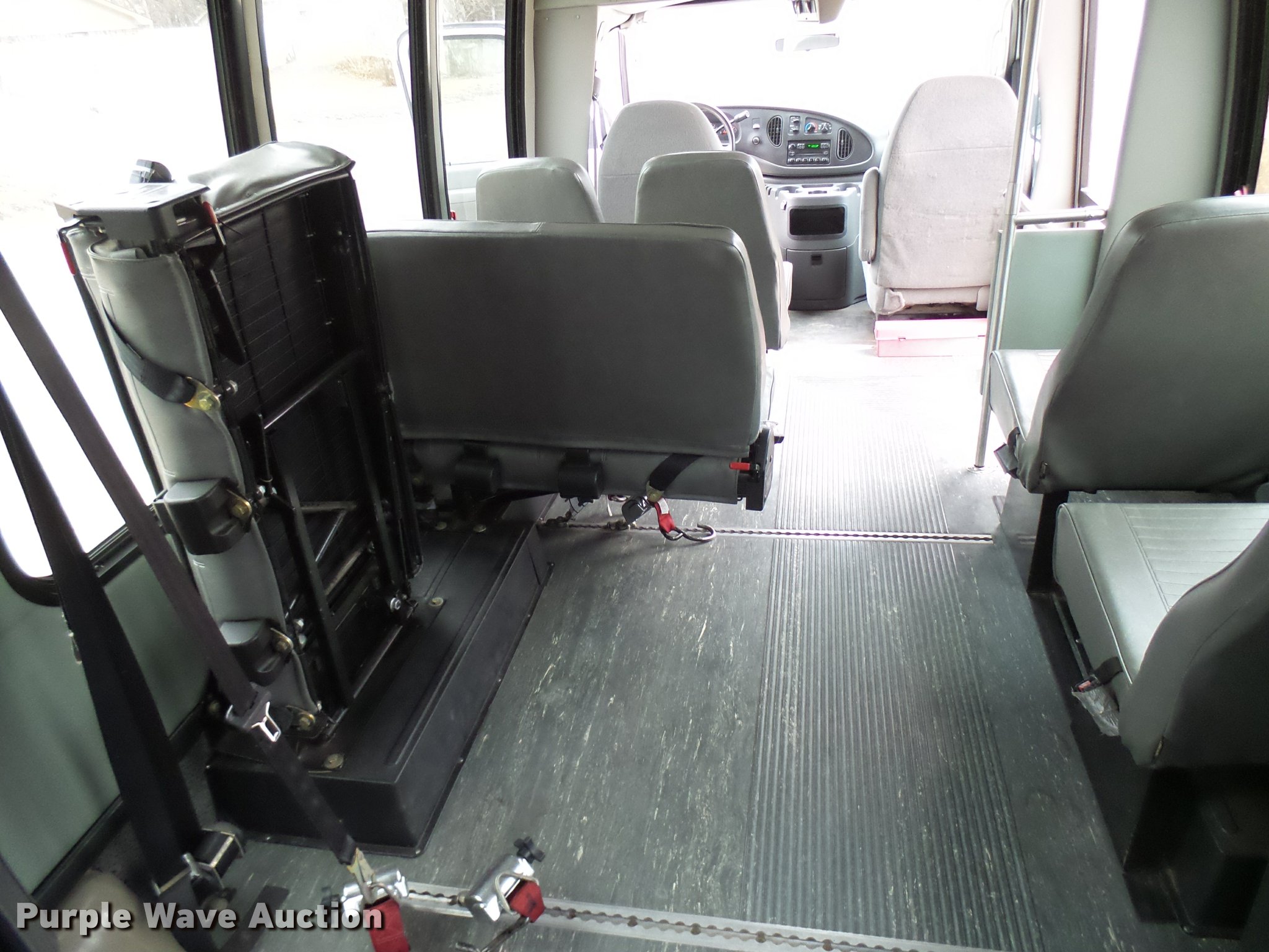 Purple Wave is selling a used Bus in Oklahoma. This item is a 2005 Ford E350 Super Duty shuttle bus with the following: 153,462 miles on odometer, 5.4L V8 SOHC 16V gas engine, Automatic transmission, Single axle, AC and heat, Cruise, AM/FM/CD, Auxiliary controls, Electric passenger sliding door, 11 passenger capacity, (7) adult seats, Seat belts, Braun L9171B wheelchair lift, Serial 09-13015, Non-operational lift, Wheelchair tie down area, Front, rear, and side emergency egress, Emergency door alarms, Turtle Top conversion package, 225/75R16 tires, GVWR 10,700 lbs, Unit# 7