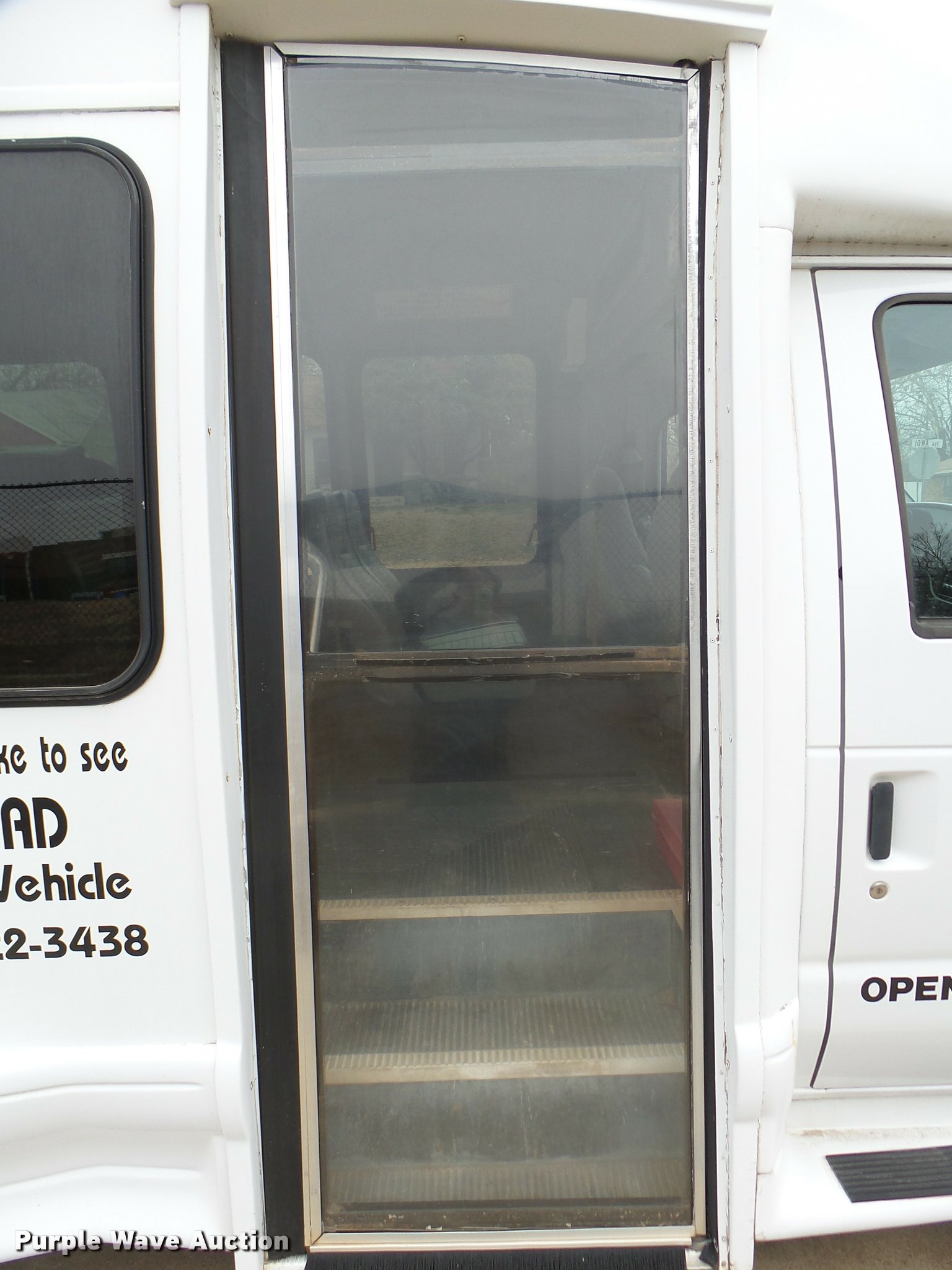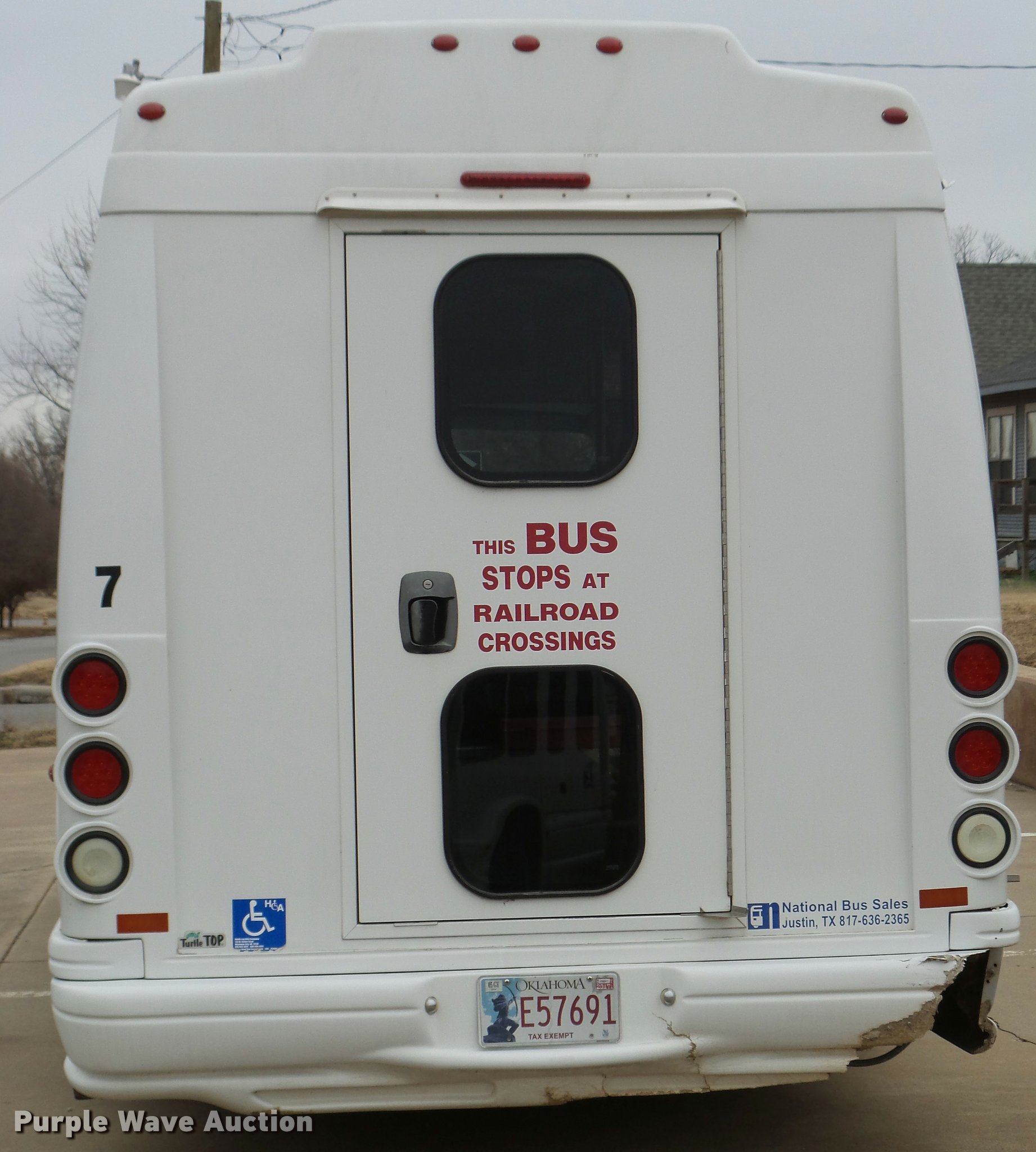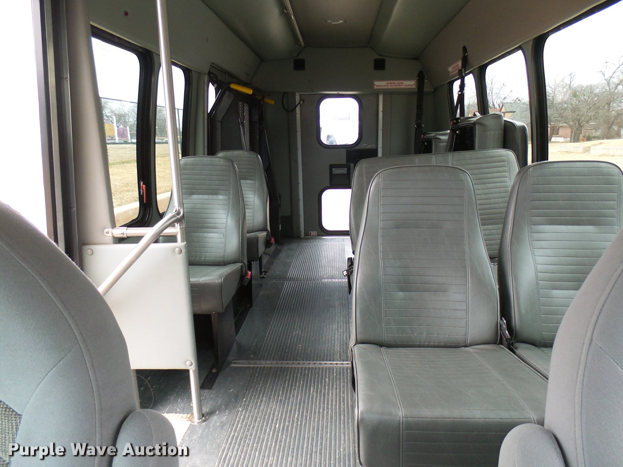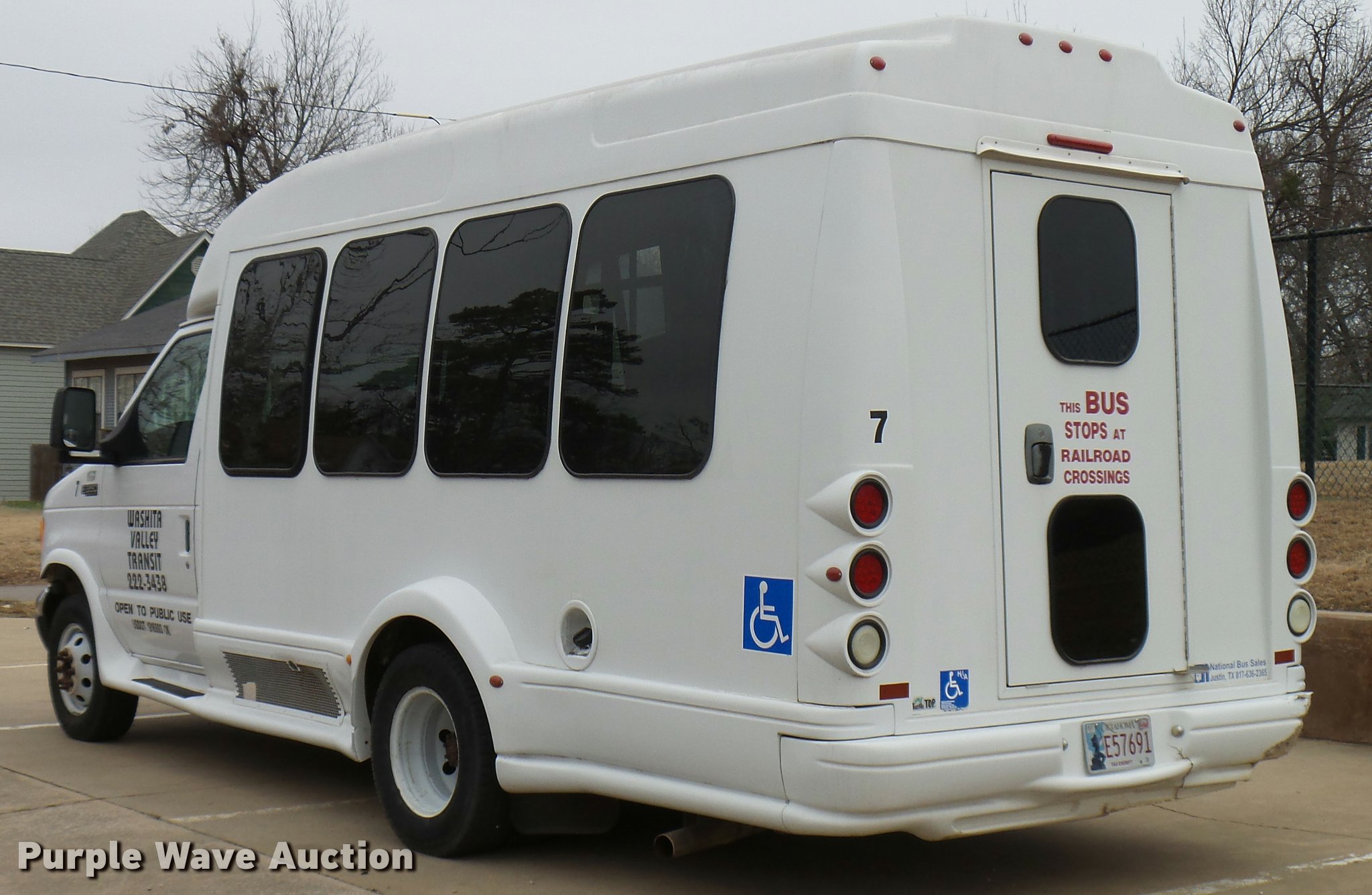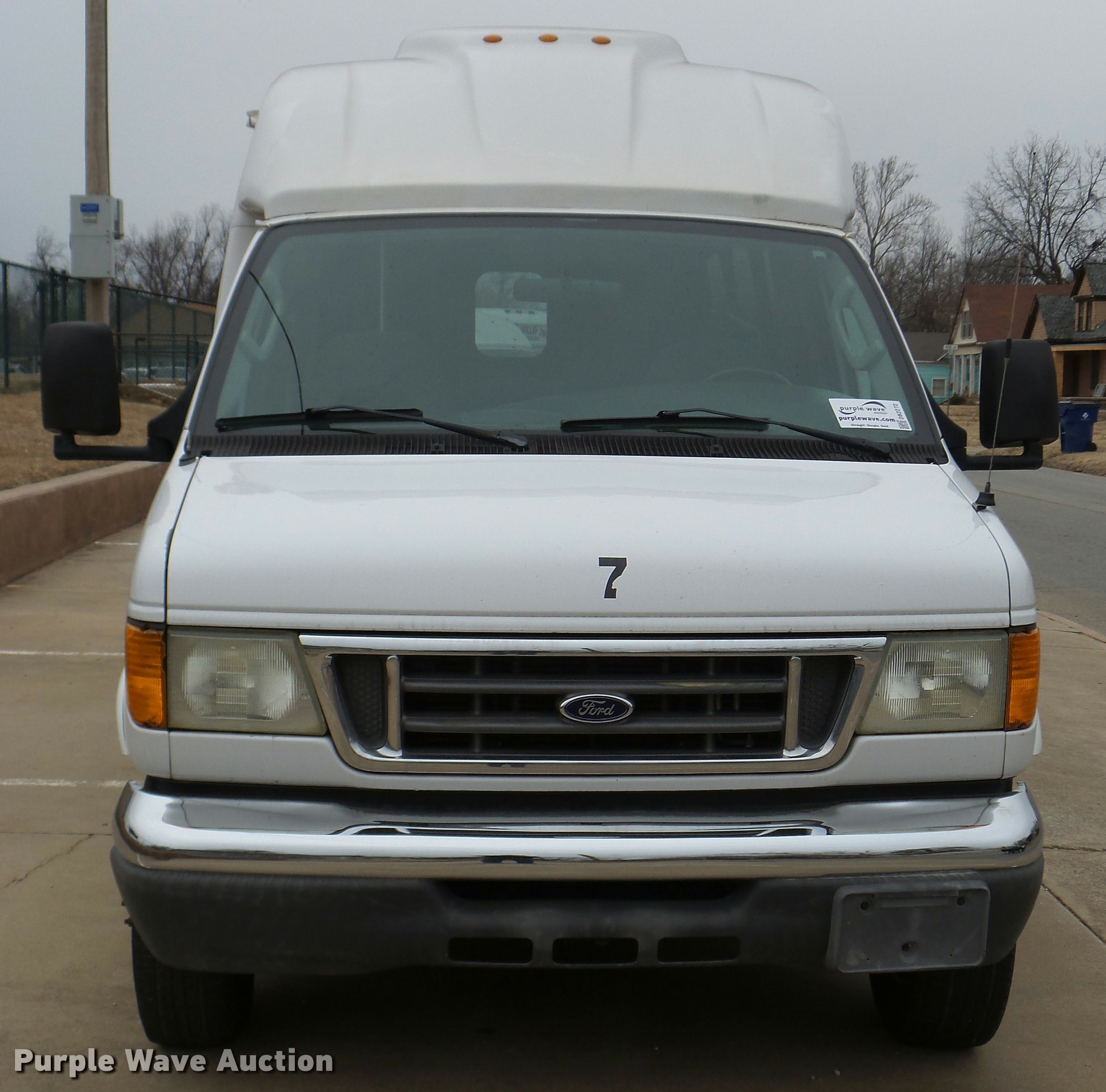 Purple Wave is selling a used Bus in Oklahoma. This item is a 2005 Ford E350 Super Duty shuttle bus with the following: 153,462 miles on odometer, 5.4L V8 SOHC 16V gas engine, Automatic transmission, Single axle, AC and heat, Cruise, AM/FM/CD, Auxiliary controls, Electric passenger sliding door, 11 passenger capacity, (7) adult seats, Seat belts, Braun L9171B wheelchair lift, Serial 09-13015, Non-operational lift, Wheelchair tie down area, Front, rear, and side emergency egress, Emergency door alarms, Turtle Top conversion package, 225/75R16 tires, GVWR 10,700 lbs, Unit# 7