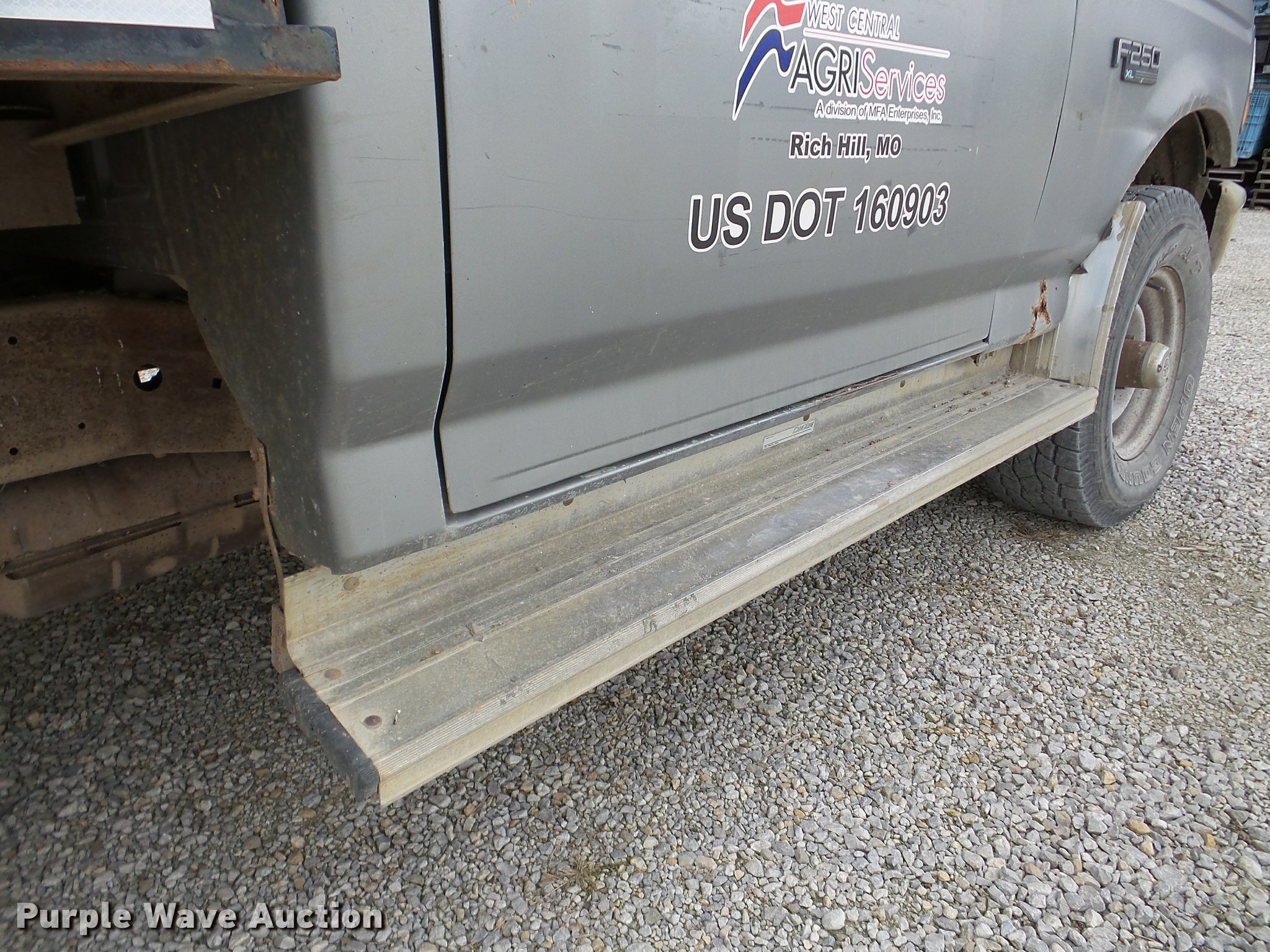 1995 Ford F250 flatbed pickup truck. 172,927 miles on odometer, 5.8L V8 OHV 16V gas engine, Automatic transmission, Four wheel drive, AC and heat, AM/FM, Manual windows and locks, Cloth interior, 102"L x 7'W flatbed, Gooseneck hitch, Receiver hitch, 265/75R16 tires, Exhaust leak. Missouri title. 2FTHF26H0SCA66053. MFA Ag Inc.. 700 Walnut. Rich Hill, MO 64779