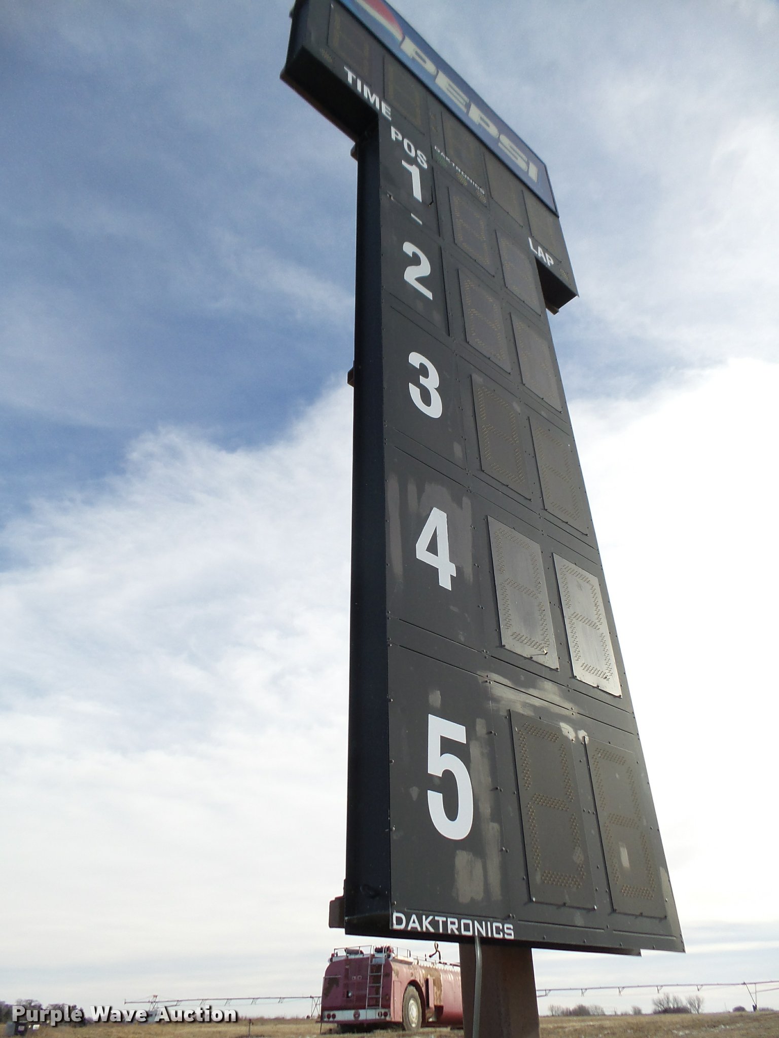 Purple Wave is selling a used Sporting Goods in Nebraska. This item is a Scoring tower with the following: Approx. 8'W x 20'H, Daktronics control console, Operators manual, MyLaps software, Second control console, Case, Non-operational, parts only