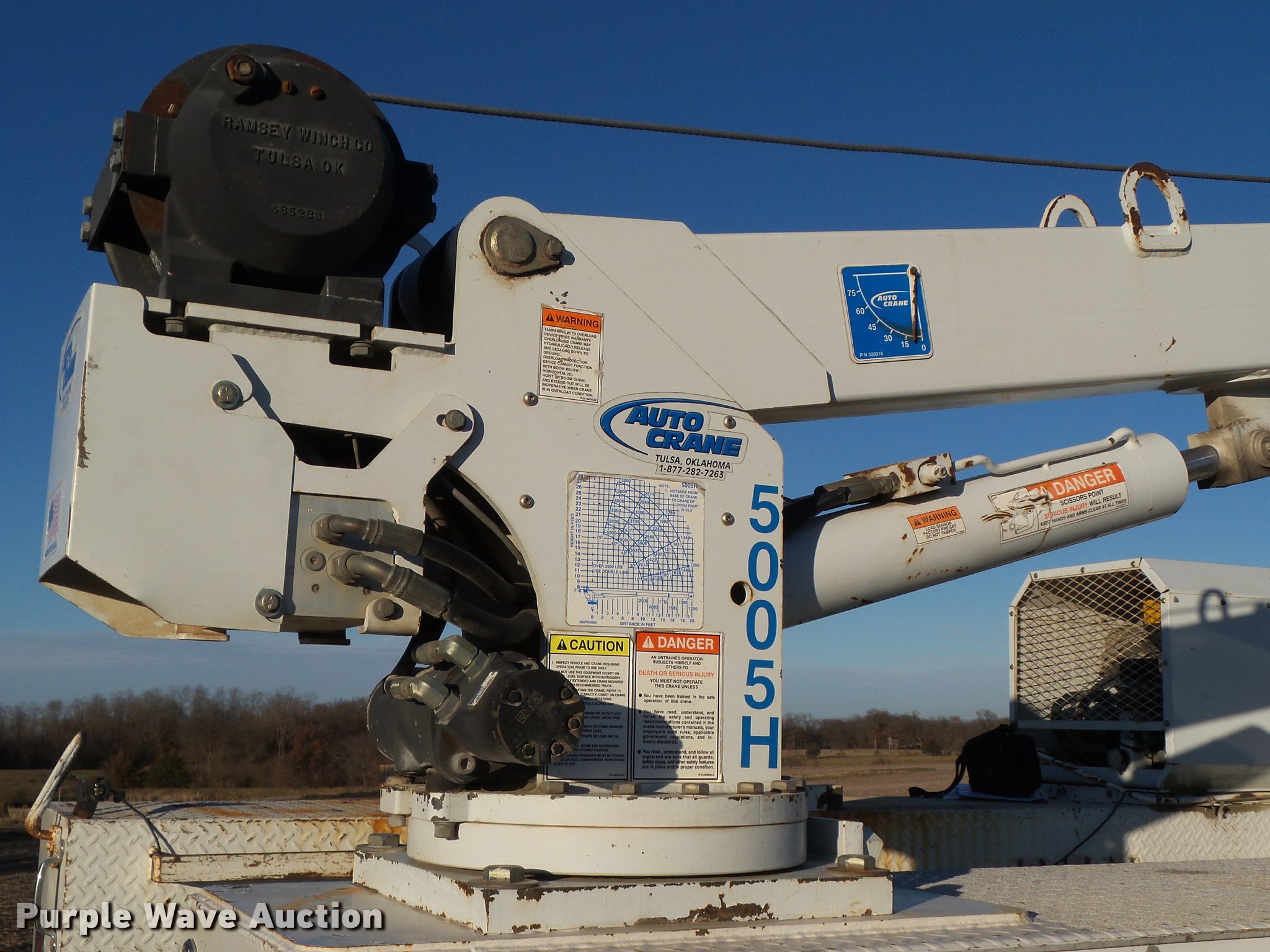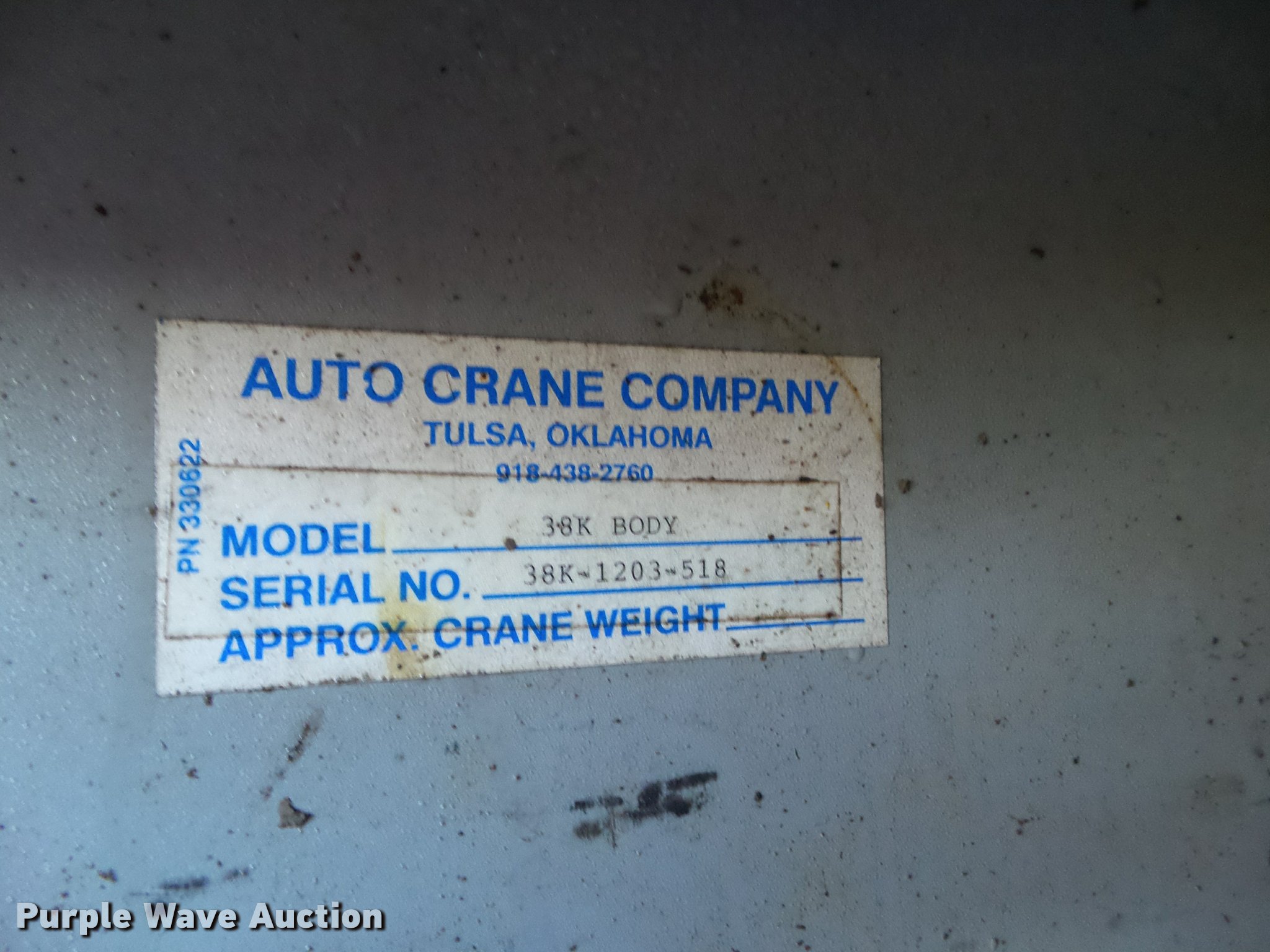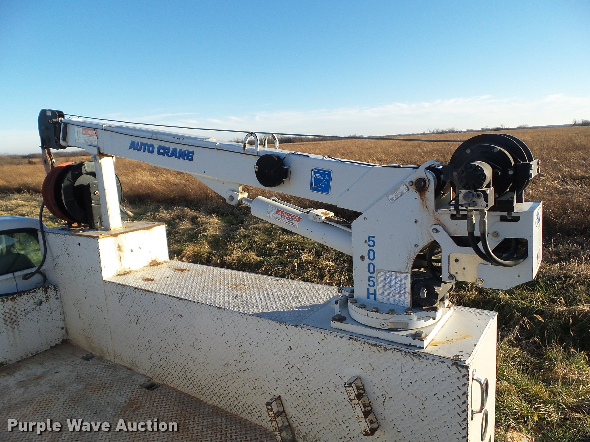 Purple Wave is selling a used Service Truck in Iowa. This item is a 2004 Ford F550 Super Duty service truck with crane with the following: 219,705 miles on odometer, 6.0L V8 turbo diesel engine, Six speed manual transmission, Single axle, AC and heat, AM/FM, Heated mirrors, Block heater, Single exhaust stack, PTO, Auto Crane 38K service bed, 11'L, Shelving, Toolbox, Auto Crane air compressor, Atlas Copco engine, 180 psi, Hose reel, Hydraulic fluid reservoir, Auto Crane 5005H crane, 20' boom length, 5,000 lbs max lift capacity, Remote control, (2) outriggers,, Single fuel tank, Receiver hitch, Trialer wiring, Spring suspension, Hydraulic brakes, 165" wheelbase, 245/70R19.5 tires, GVWR 19,000 lbs