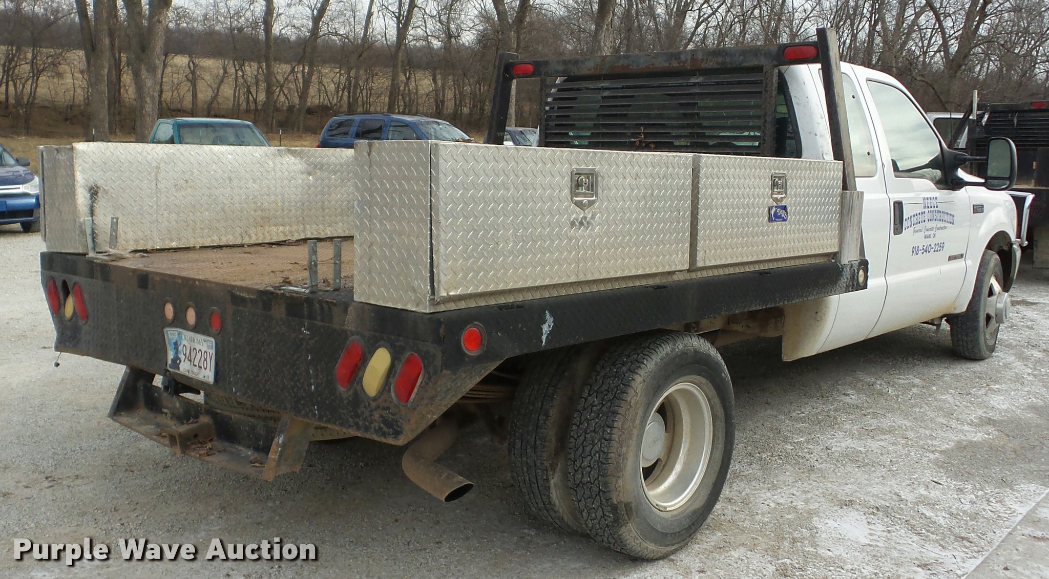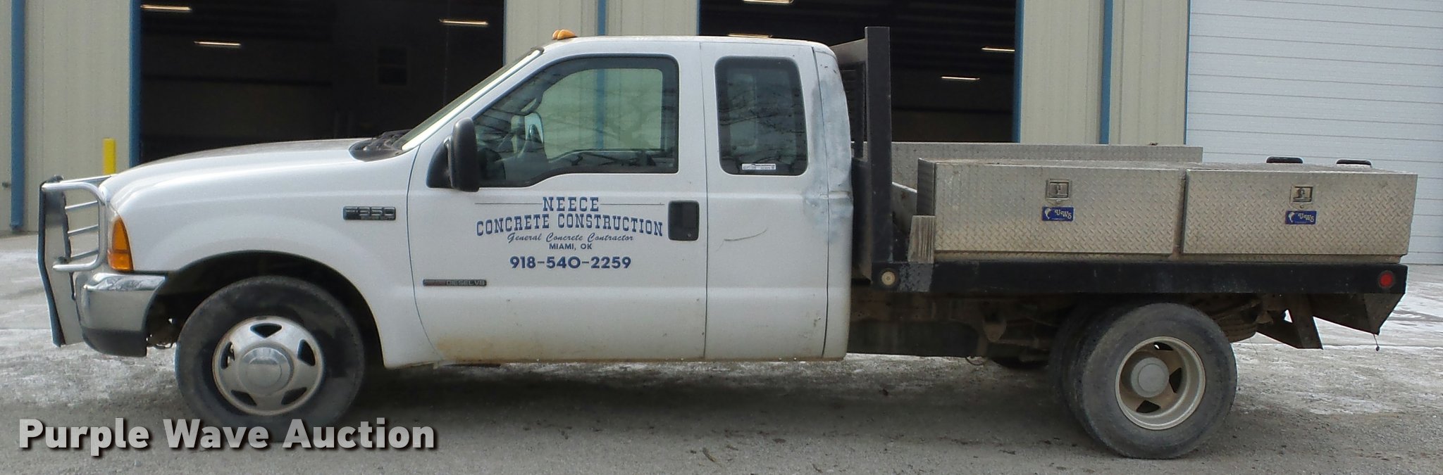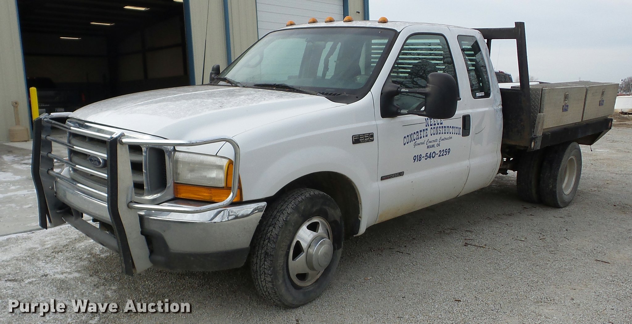 2000 Ford F350 Super Duty SuperCab flatbed pickup truck. 205,513 miles on odometer, 7.3L V8 OHV 16V diesel engine, AC and heat, Tilt, Cruise, AM/FM/cassette, Power windows and locks, Cloth interior, Gooseneck ball, Receiver hitch, Trailer wiring, LT235/85R16 tires, Cracked window. Oklahoma title. Title distribution may be delayed up to 14 days from verification of funds. 1FTWX32F1YED32570. Neece Concrete Construction. 58300 E 100 Rd. Miami, OK 74354