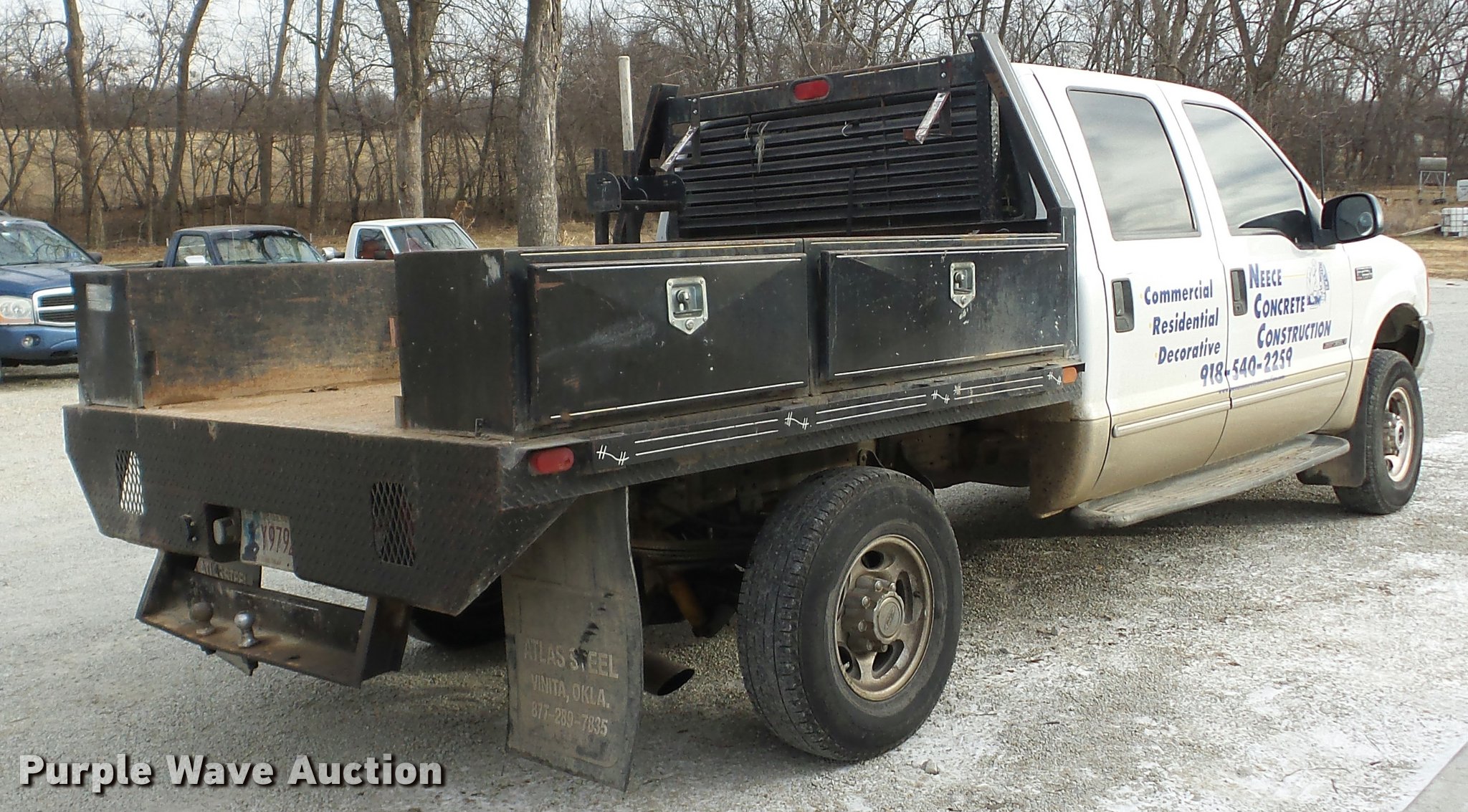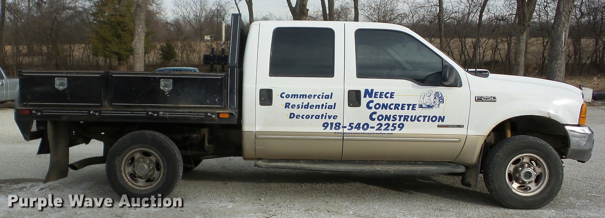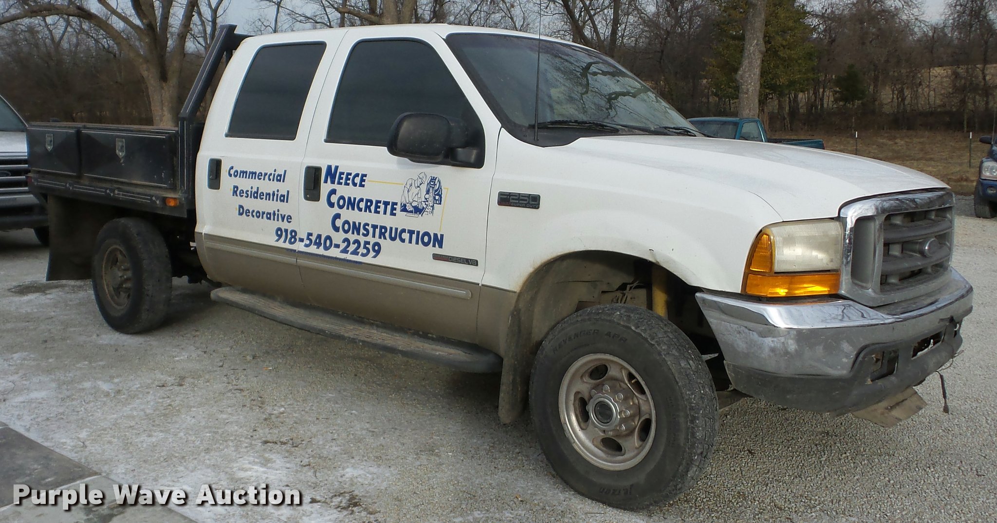 2000 Ford F250 Super Duty Crew Cab flatbed pickup truck. 196,351 miles on odometer, 7.3L V8 OHV 16V diesel engine, Four wheel drive, AC and heat, Tilt, Cruise, AM/FM/cassette, Power windows, locks, and mirrors, Vinyl interior, LT215/85R16 tires, Cracked windshield. Oklahoma title. Title distribution may be delayed up to 14 days from verification of funds. 1FTNW21F6YED73240. Neece Concrete Construction. 58300 E 100 Rd. Miami, OK 74354