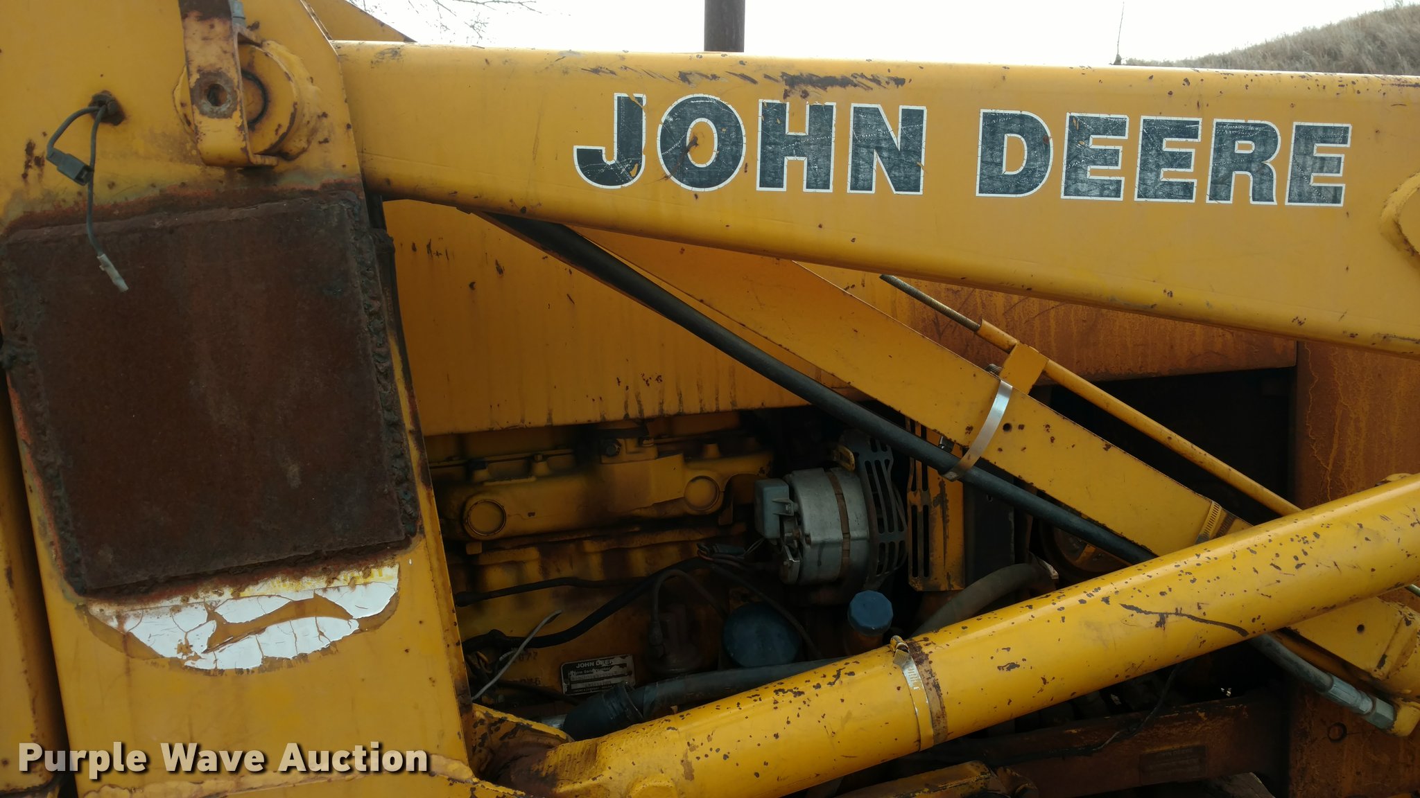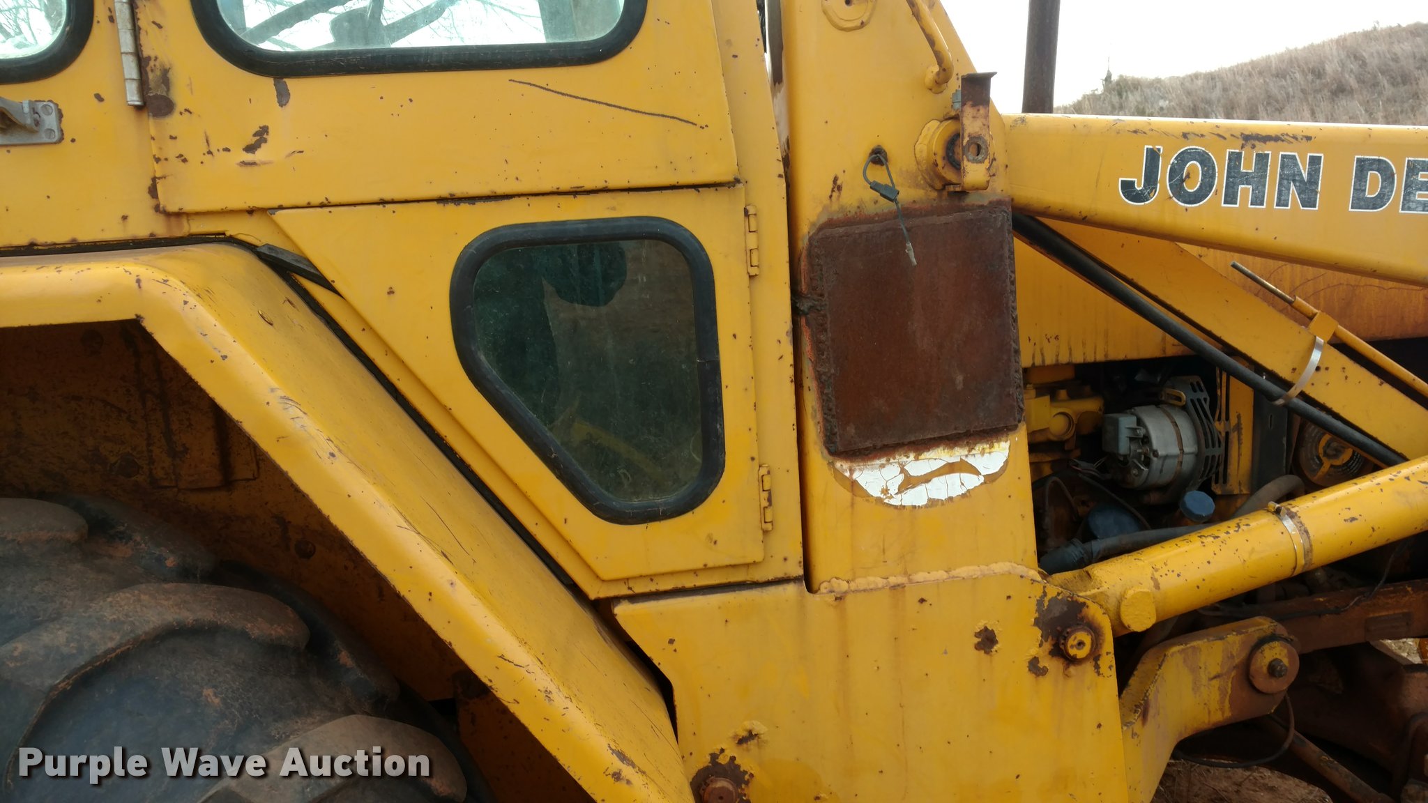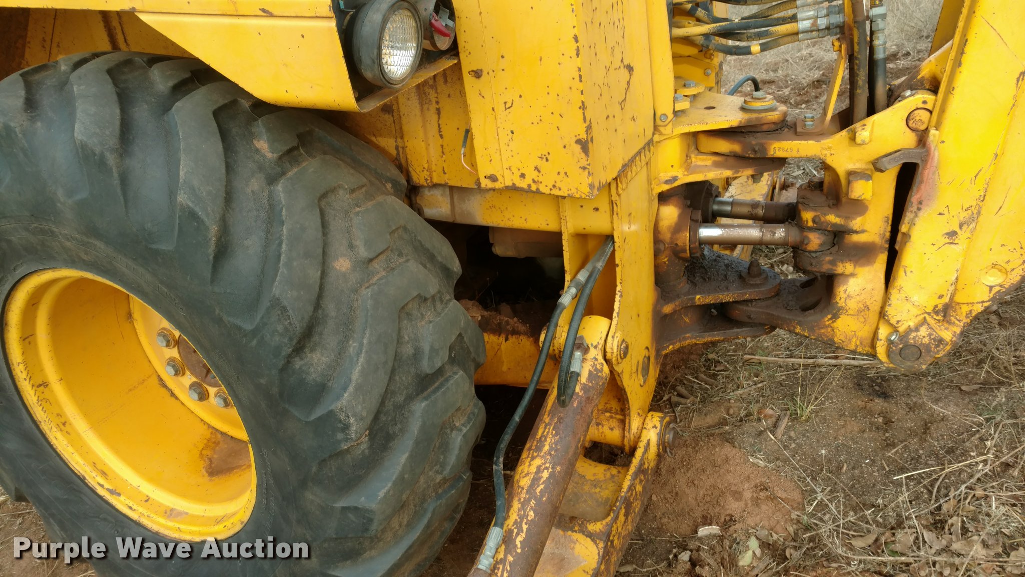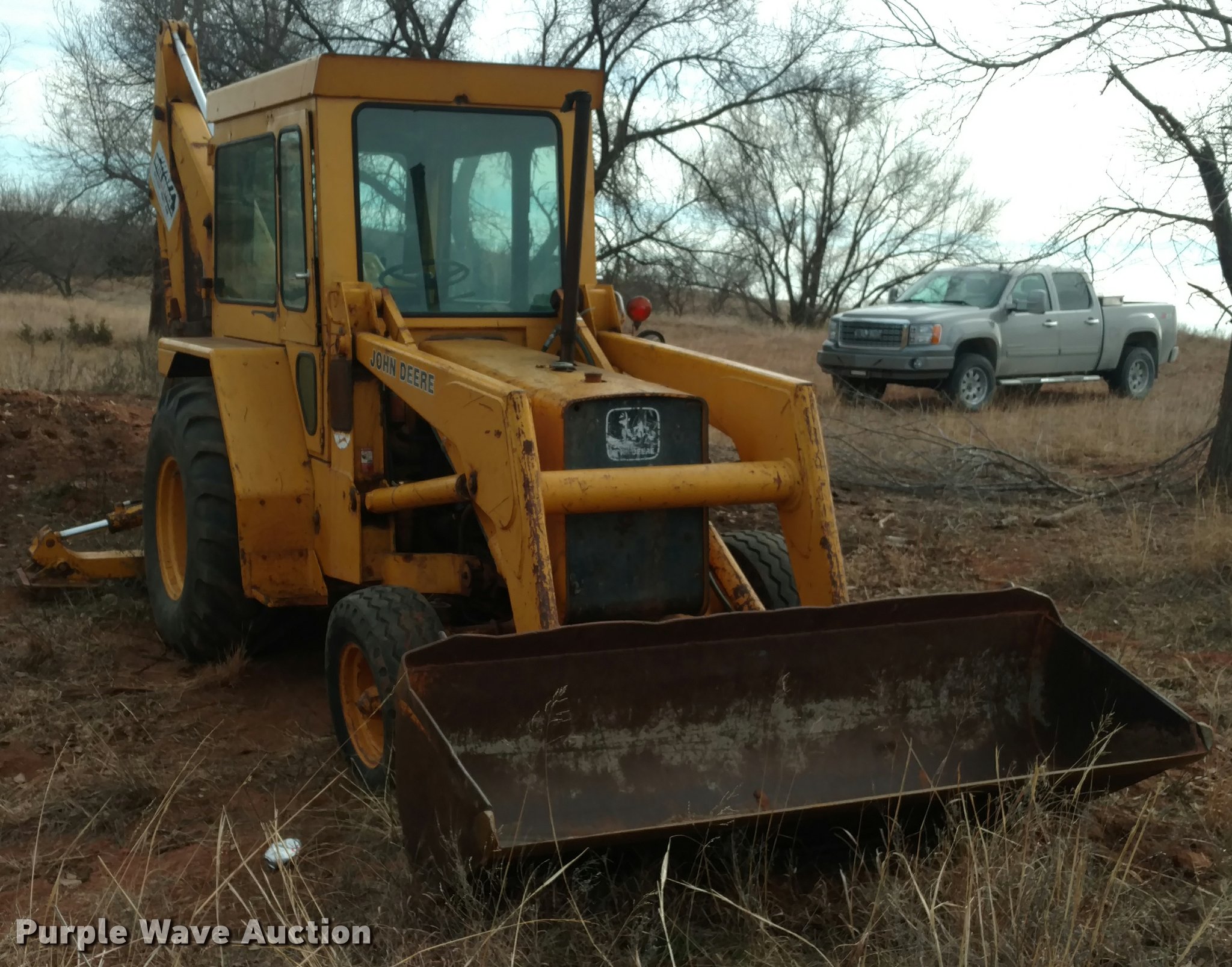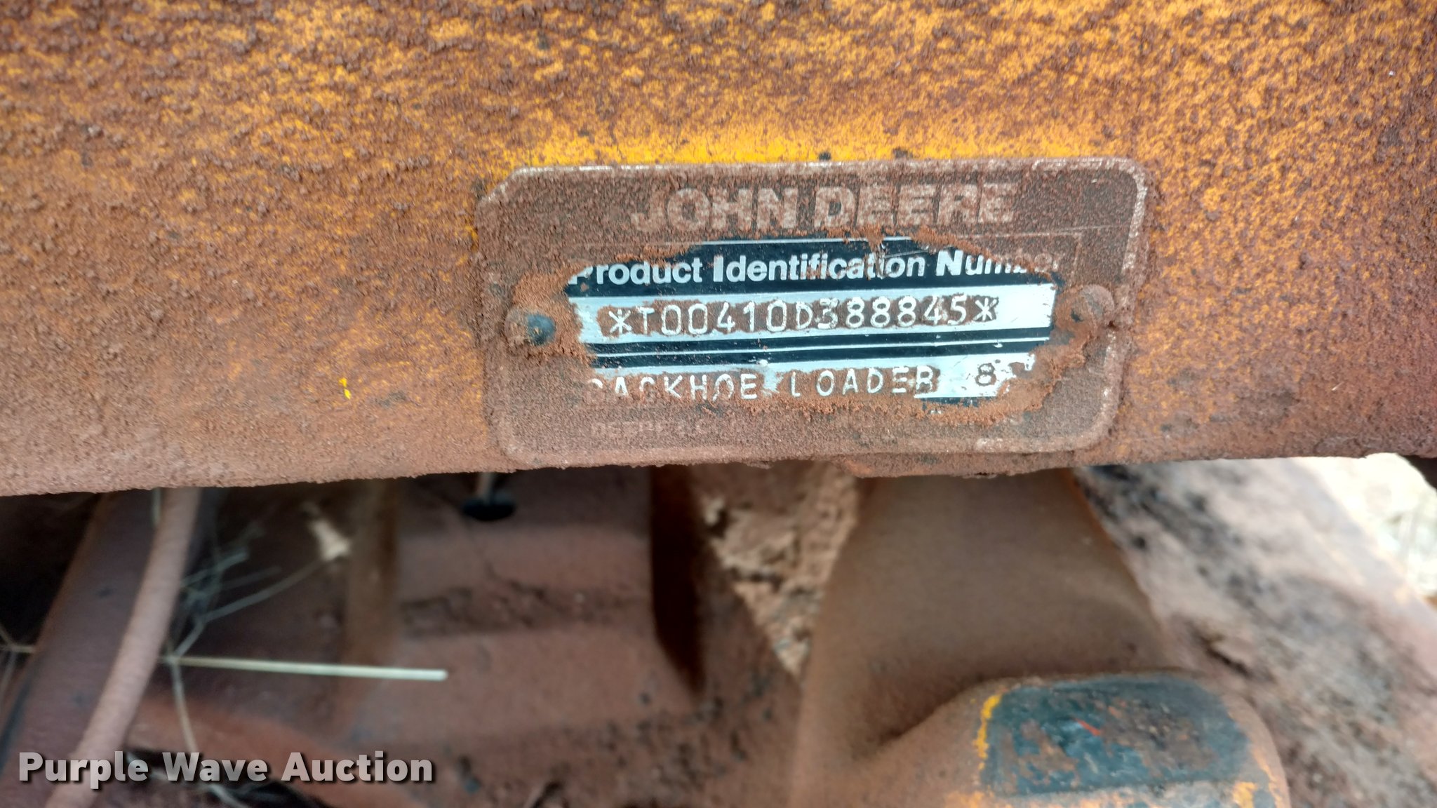 Purple Wave is selling a used Tractor Loader Backhoe in Kansas. This item is a 1983 John Deere 410 backhoe with the following: Unknown hours on meter, Four cylinder diesel engine, Manual transmission, 4F-4R gears, Enclosed cab, Four stick backhoe controls, 88"W loader bucket, 24"W backhoe bucket, 11L-16SL front tires, 18.4-24 rear tires, Unit will not move under its own power, possible transmission or rear end issue, Serial T00410D388845