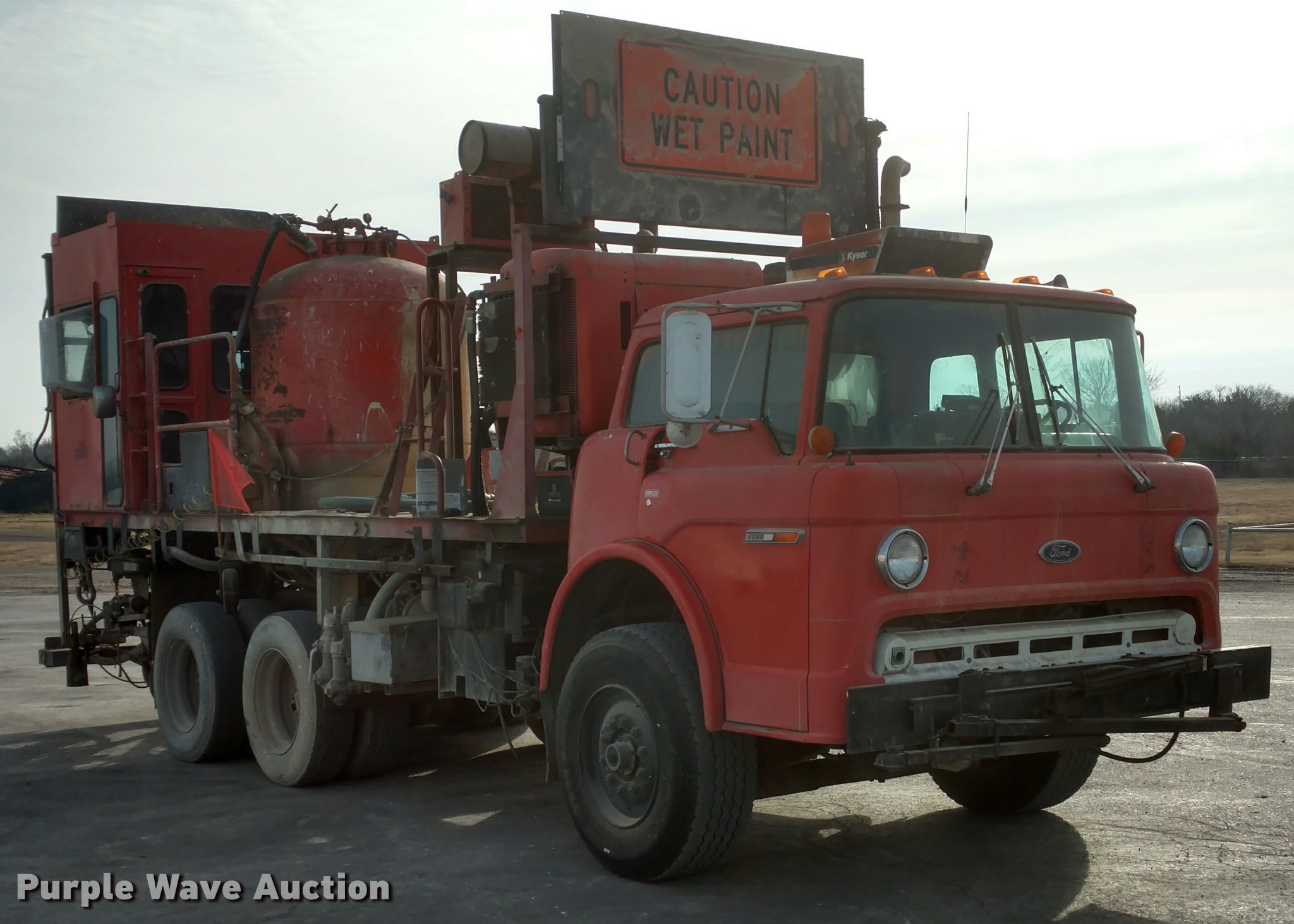 Purple Wave is selling a used Service Truck in Kansas. This item is a 1989 Ford CT8000 paint striping truck with the following: 33,378 miles on odometer, Actual mileage unknown, Caterpillar 10.4L V8 diesel engine, Automatic transmission, Manual windows and locks, Linear Dynamics 1000G airless striping equipment, Four cylinder diesel engine, Dual side operators station, In-cab controls, Arrow boards, On board air compressor, Air brakes, 395/65R22.5 front tires, 295/75R22.5 rear tires, Additional parts