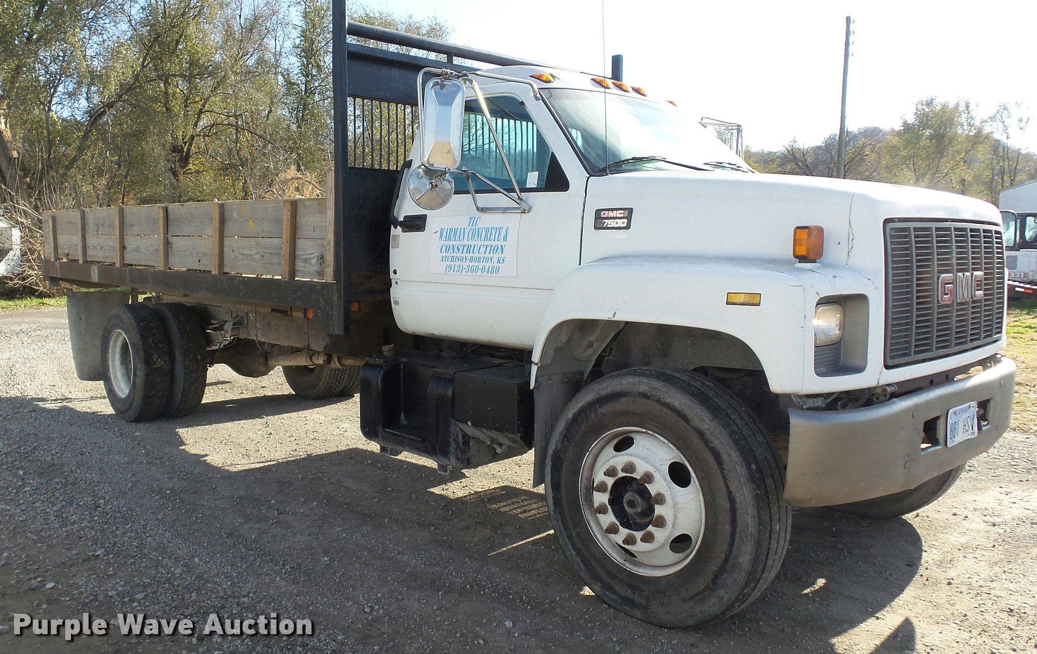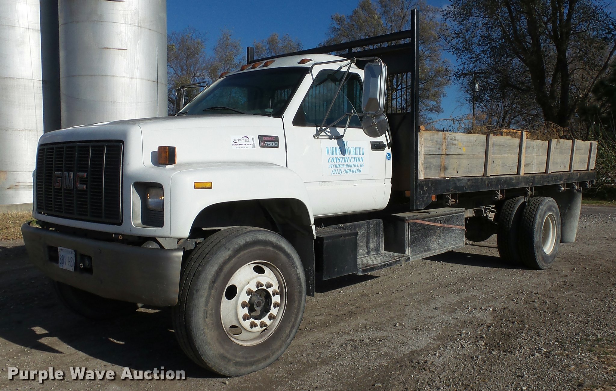 Purple Wave is selling a used Flat Bed Truck in Missouri. This item is a 2001 GMC C7500 dump flatbed truck with the following: 294,916 miles on odometer, Caterpillar 3126 7.2L six cylinder turbo diesel engine, Six speed manual transmission, Single axle, Heat, AM/FM, PTO, 18'L x 96"W dump flatbed, 18" side height, Toolboxes, Single fuel tank, Spring suspension, Hydraulic brakes, 11R22.5 tires, FAWR 12,000 lbs, RAWR 21,000 lbs, ABS light is on