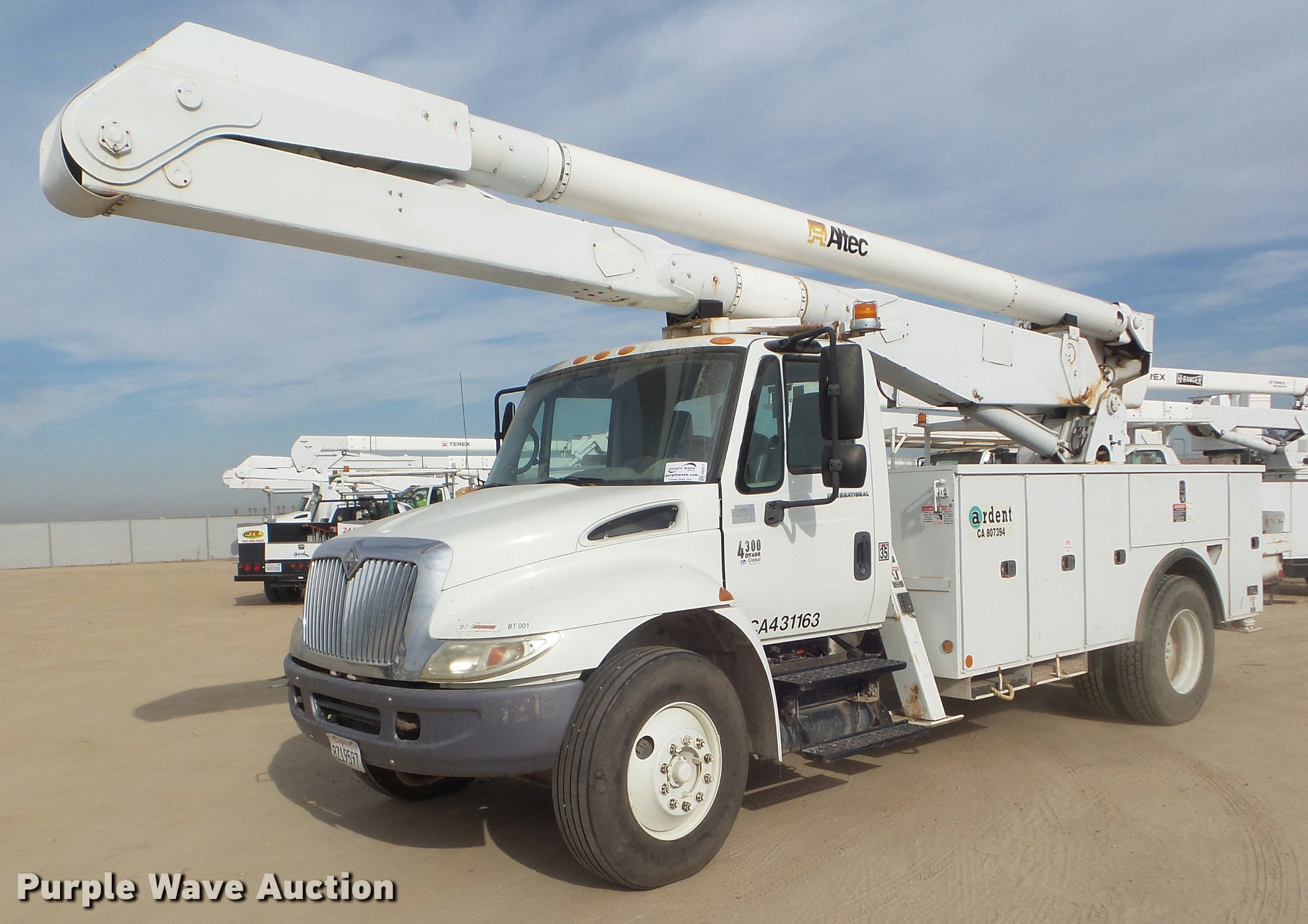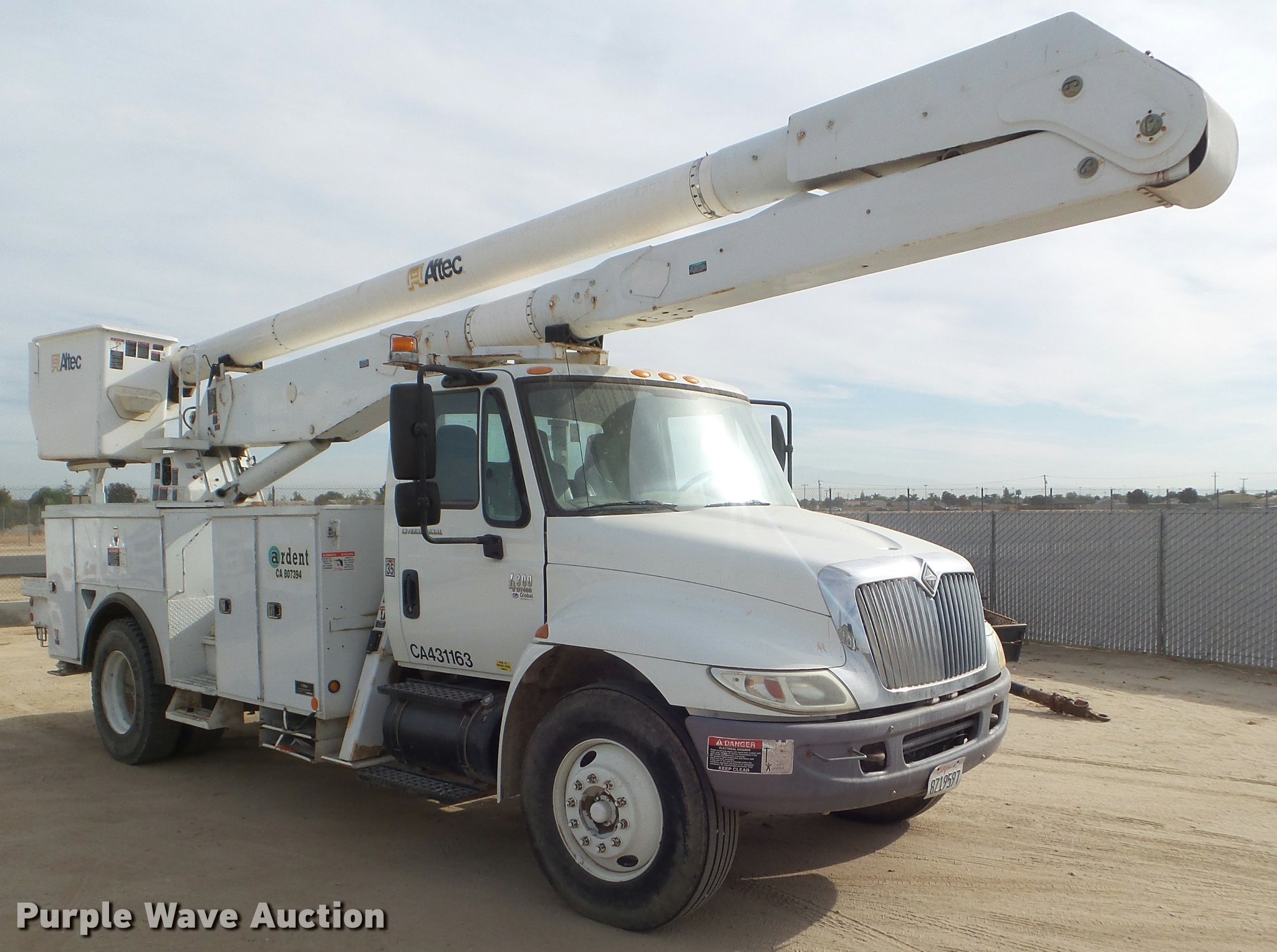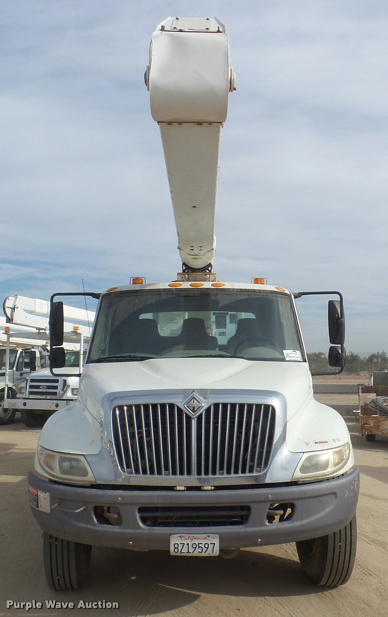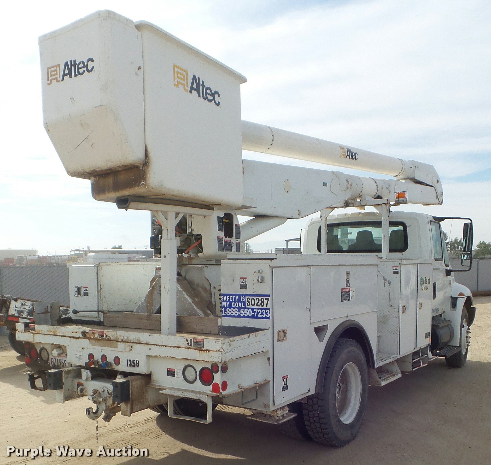 Purple Wave is selling a used Bucket Truck in California. This item is a 2008 International DuraStar 4300 bucket truck with the following: 51,418 miles on odometer, 5,631 hours on meter, International MaxxForce DT DT466 7.6L L6 turbo diesel engine, Automatic transmission, Single axle, AC and heat, Cruise, AM/FM, Heated mirrors, Spring suspension seat, Beacon light, Front tow hooks, PTO, Altec service bed, 16'L, Shelving, Pintle hitch, Trailer wiring, Glad hand couplers, 2007 Altec AA755L boom, 600 lbs maximum lift capacity, 56' maximum lift height, Man basket, Platform and ground controls, Boom rotation, Articulating, insulated boom, Single fuel tank, 188" wheelbase, Spring suspension, Air brakes, 11R22.5 tires, GVWR 33,000 lbs, Boom rusted, Boom is not certified, Vehicle is not California emissions compliant, Contents are not included, Unit# 1358