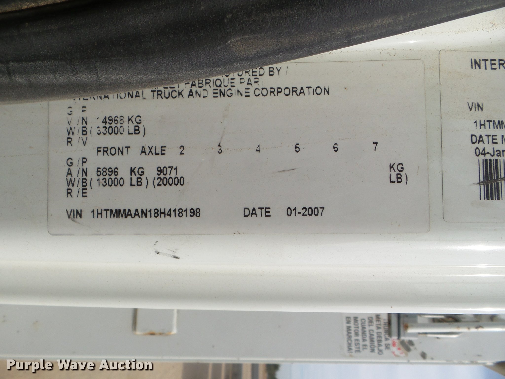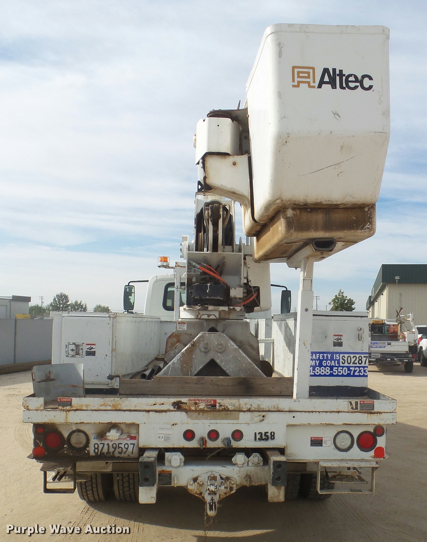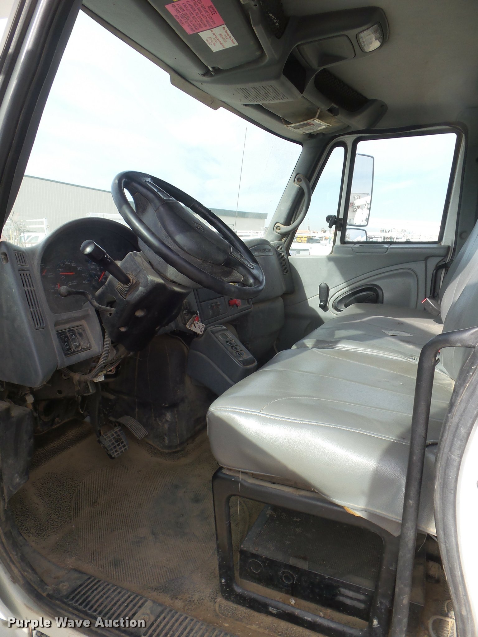Purple Wave is selling a used Bucket Truck in California. This item is a 2008 International DuraStar 4300 bucket truck with the following: 51,418 miles on odometer, 5,631 hours on meter, International MaxxForce DT DT466 7.6L L6 turbo diesel engine, Automatic transmission, Single axle, AC and heat, Cruise, AM/FM, Heated mirrors, Spring suspension seat, Beacon light, Front tow hooks, PTO, Altec service bed, 16'L, Shelving, Pintle hitch, Trailer wiring, Glad hand couplers, 2007 Altec AA755L boom, 600 lbs maximum lift capacity, 56' maximum lift height, Man basket, Platform and ground controls, Boom rotation, Articulating, insulated boom, Single fuel tank, 188" wheelbase, Spring suspension, Air brakes, 11R22.5 tires, GVWR 33,000 lbs, Boom rusted, Boom is not certified, Vehicle is not California emissions compliant, Contents are not included, Unit# 1358