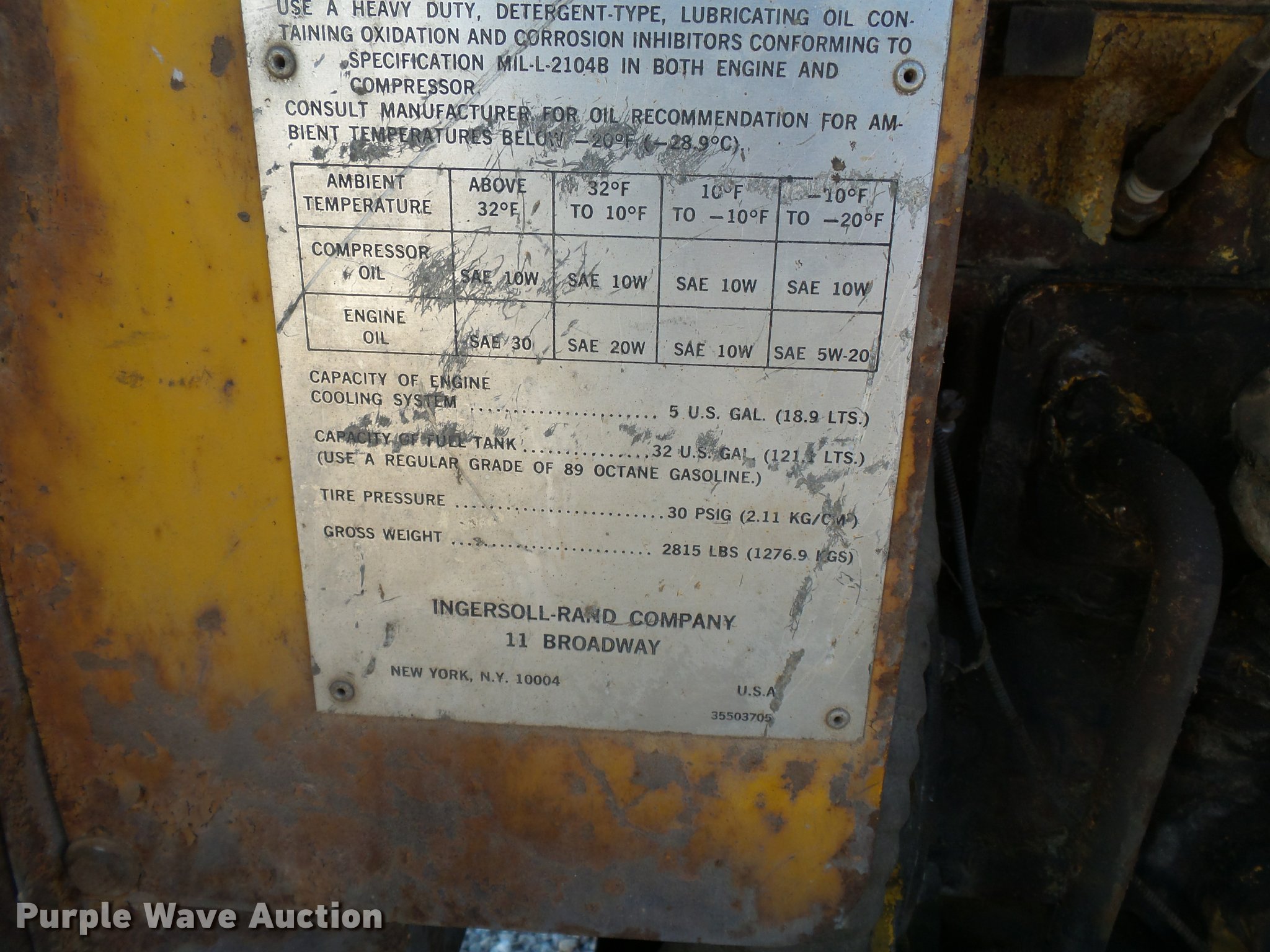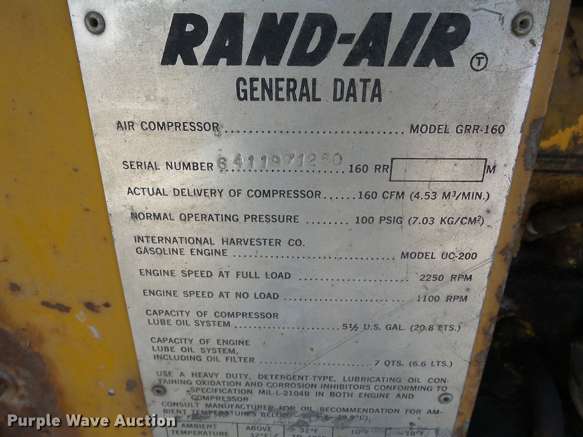 Purple Wave is selling a used Air Compressor in Missouri. This item is a Ingersoll Rand GRR160 air compressor with the following: 2,040 hours on meter, International Harvester 0C200 four cylinder gas engine, Serial 6411971250, 160 CFM, 100 psi, 2" ball hitch, 15" tires