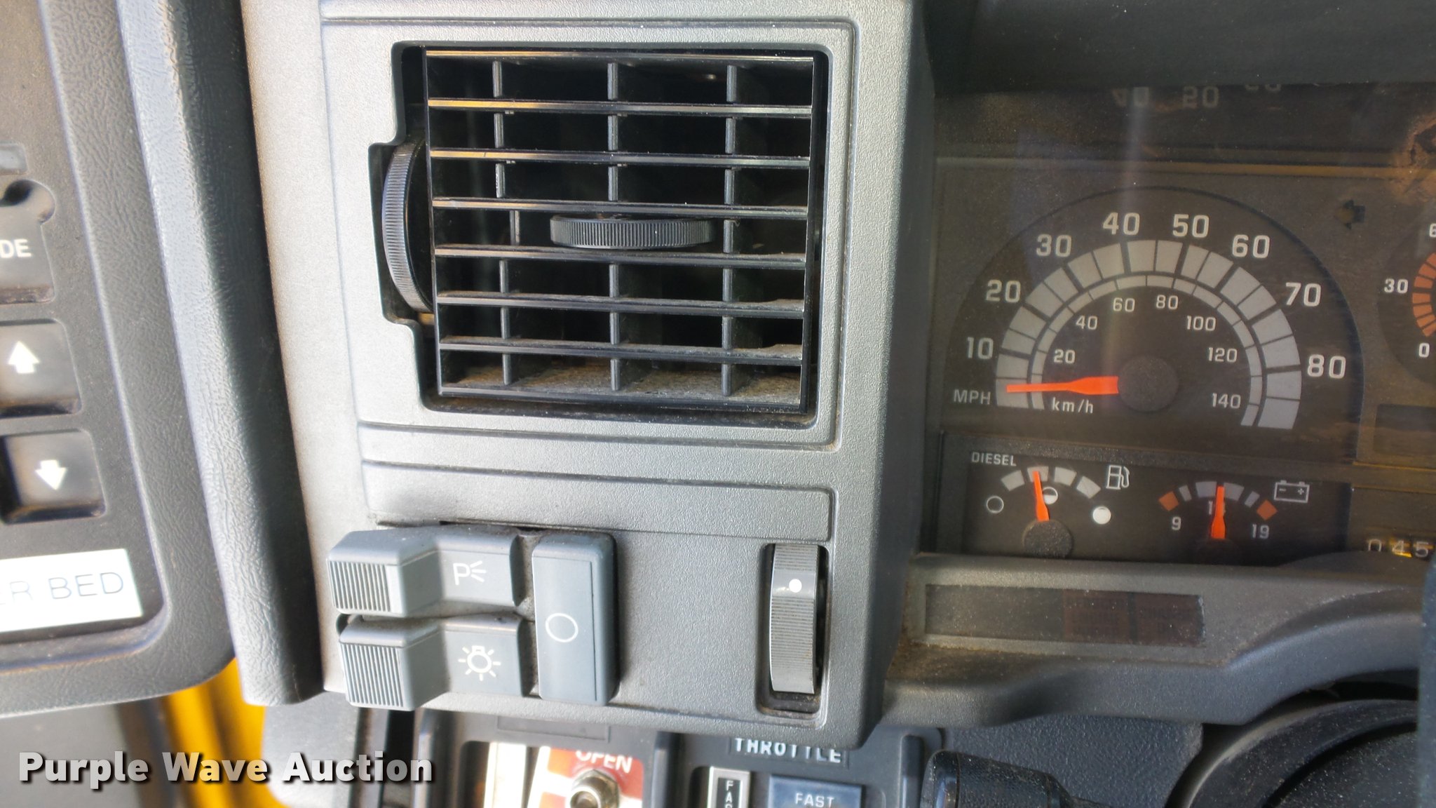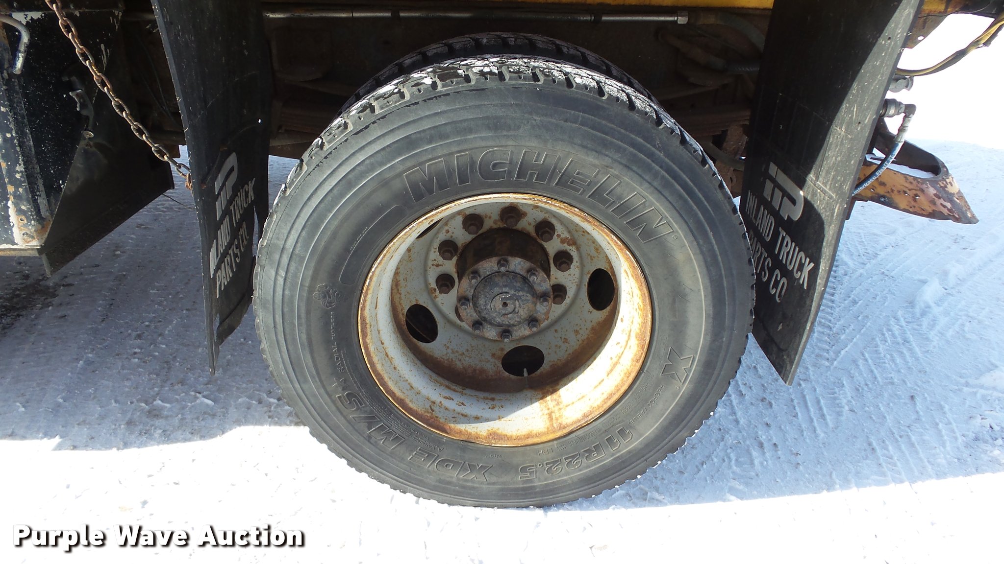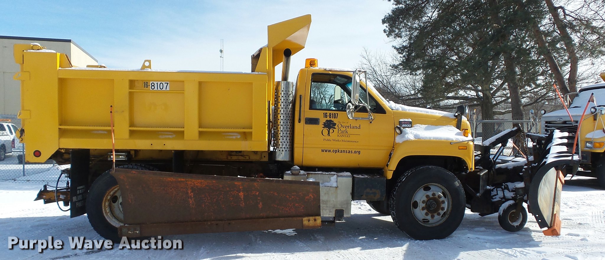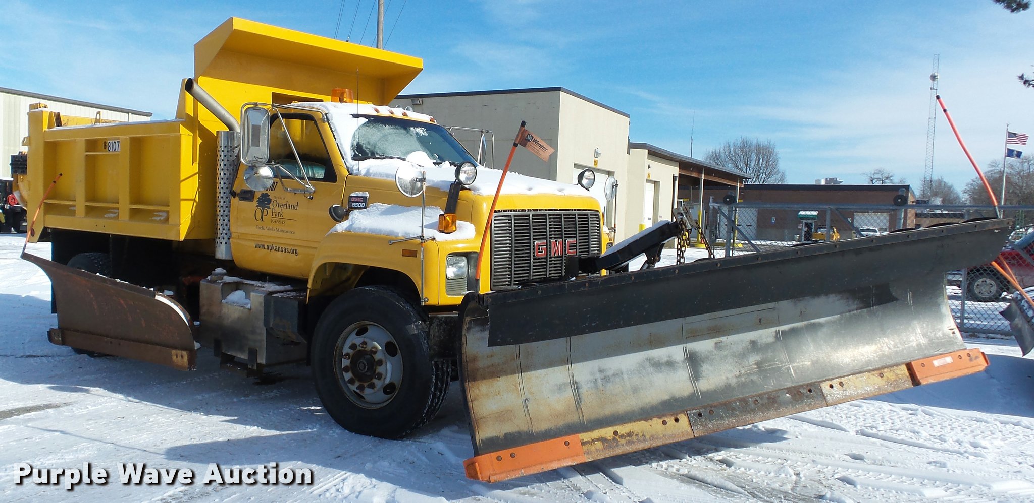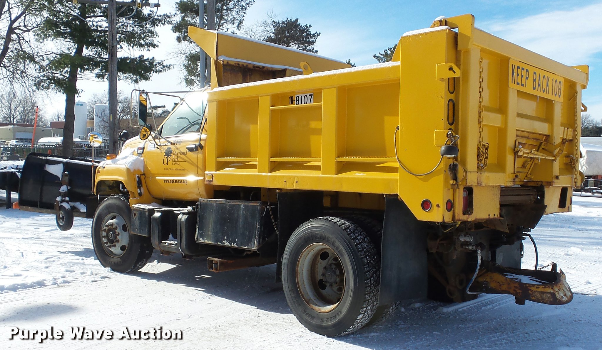 Purple Wave is selling a used Construction Dump Truck in Kansas. This item is a 2000 GMC C7500 dump truck with the following: 45,170 miles on odometer, Caterpillar 3126 7.2L six cylinder turbo diesel engine, Automatic transmission, Single axle, AC and heat, Tilt, AM/FM, Heated mirrors, Air suspension seat, Block heater, Steel dump bed, 10'L x 8'W, 39" side height, Single ram two stage hoist, Hinke 11'W snow plow, 8'W side blade, Air Flow FND spreader, Dickey John DJCS2000 control unit, Front and rear work lights, Single fuel tank, Pintle hitch, Trailer wiring, 13' wheelbase, Spring suspension, Air brakes, 11R22.5 tires, GVWR 36,220 lbs, FAWR 13,220 lbs, RAWR 23,000 lbs, Batteries dead, Rust, Unit# 8107