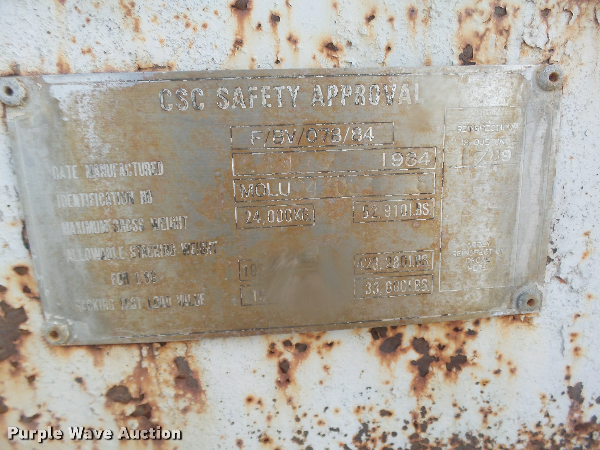 1984 Jindo storage container. Approx. 20'L x 8'W O.D., Approx. 20'L x 92"W x 94"H I.D., 1,163 cu. ft. capacity, 52,910 lbs max gross weight, 47,910 lbs max cargo weight, 5,000 lbs tare weight, Contents not included, Serial M0LU2430238. Butler County Speedway. 3730 C Rd. Rising City, NE 68658