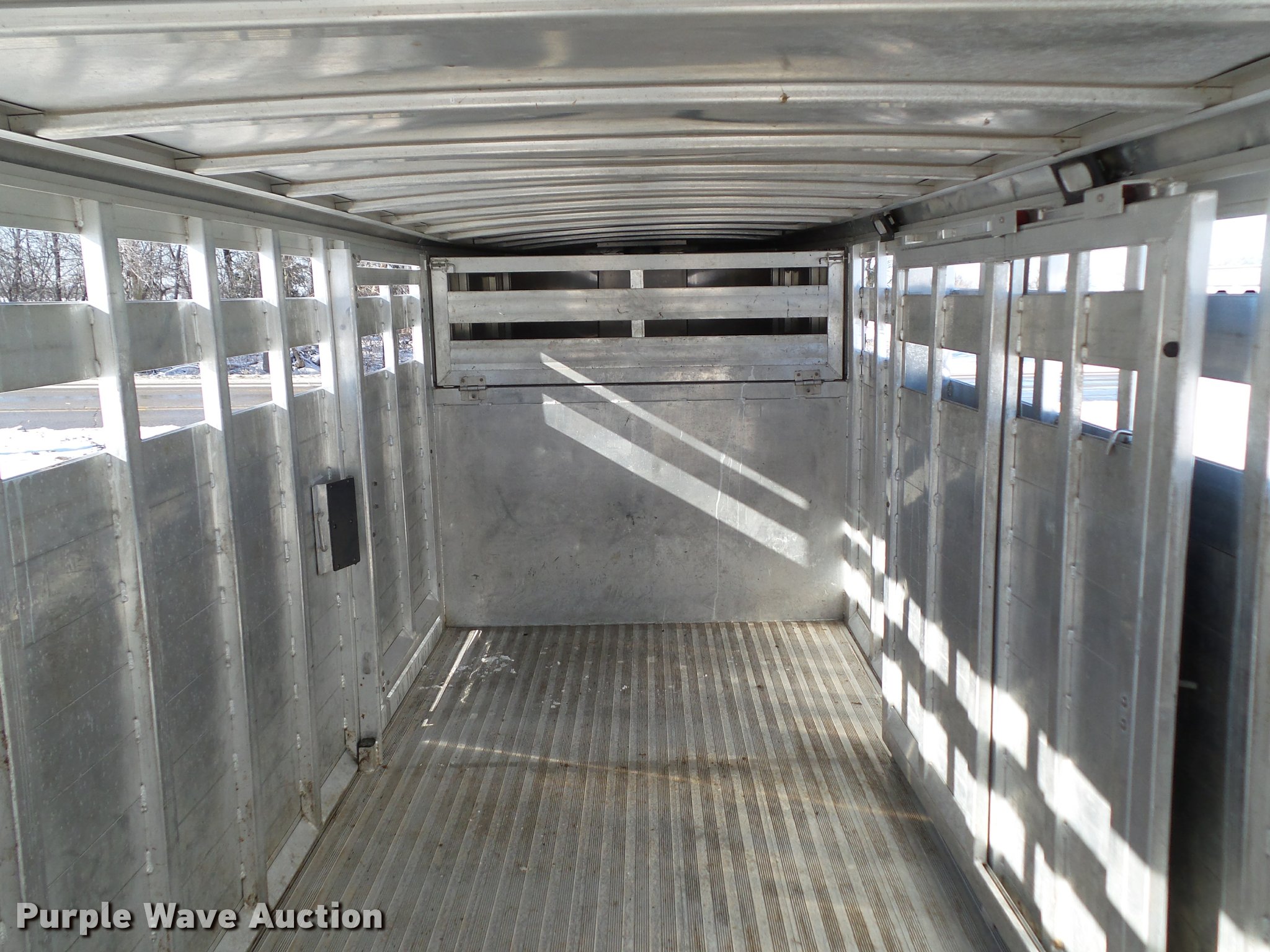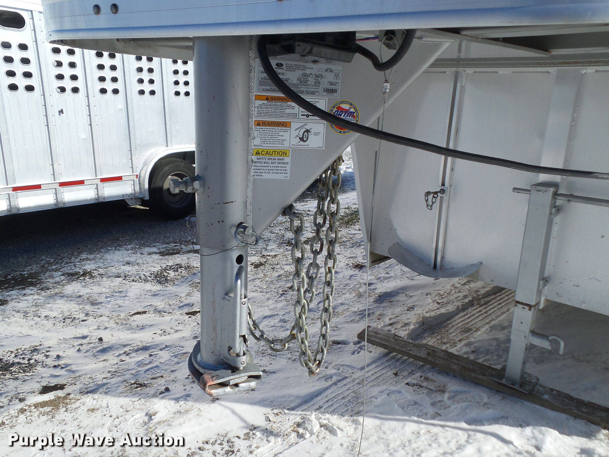 Purple Wave is selling a used Livestock Trailer in Iowa. This item is a 2013 Exiss Sooner SR-624 livestock trailer with the following: 32'L x 102"W, 24'L x 84"W body, 84" side height, (2) center divider gates with slider gate, Side door, Full swing rear door with slider gate, Interior lights, Dock bumper, Spare tire carrier, Aluminum construction, Gooseneck hitch, Single leg two speed landing gear, Spring suspension, Electric brakes, Tandem axle, Steel wheels, ST235/85R16 tires, GVWR 14,000 lbs