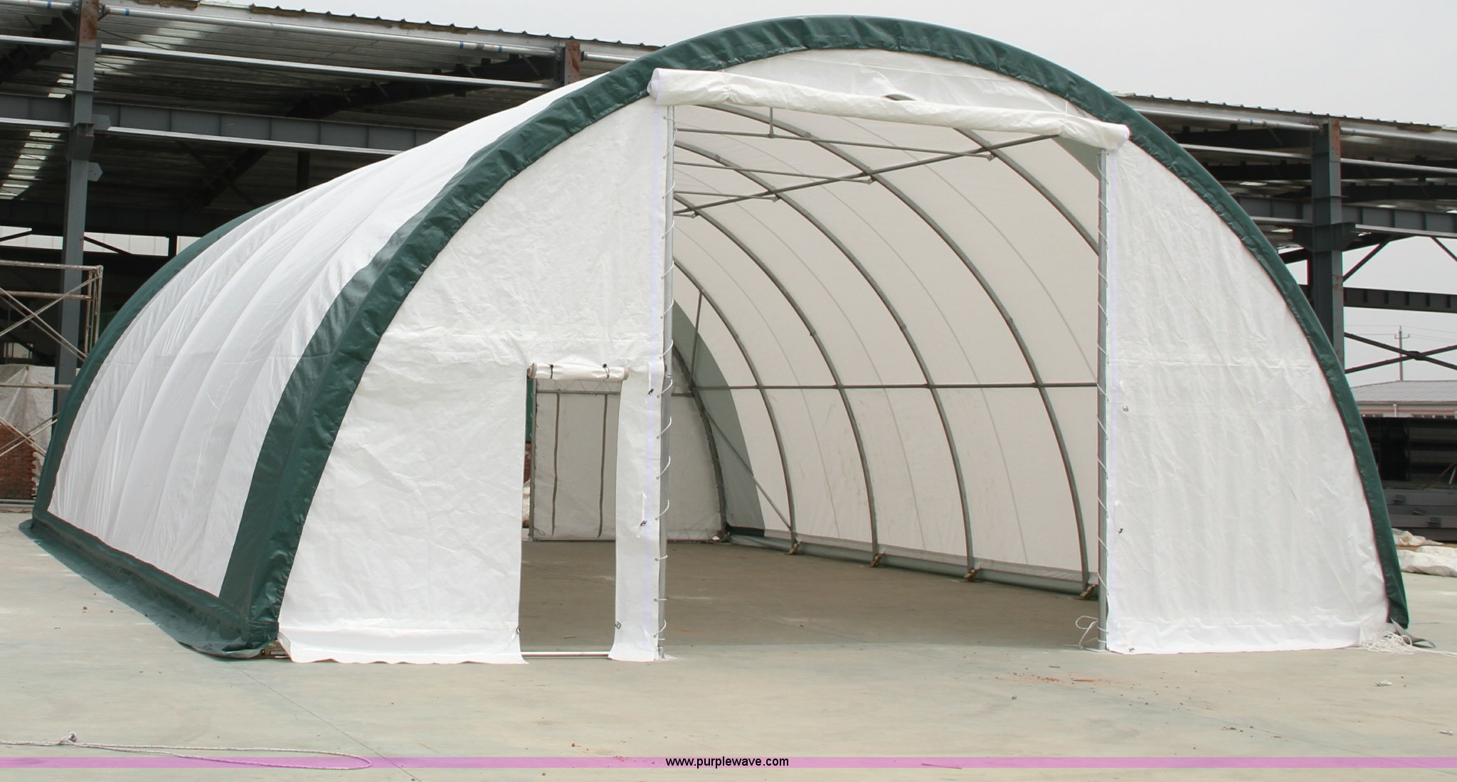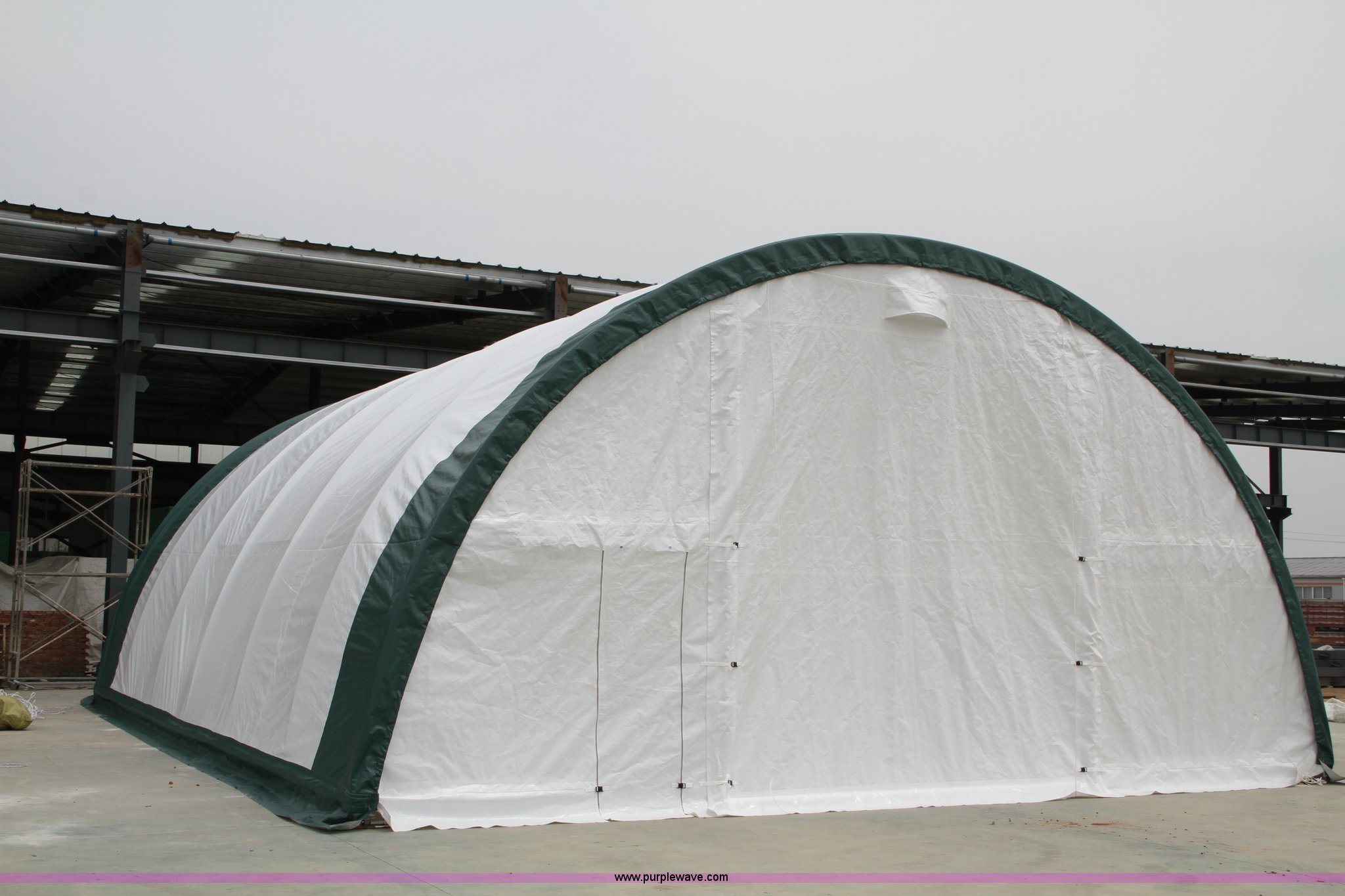 Dome storage building. 65'L x 30'W x 15'H, Galvanized finished steel frame, 2 3/4" oval galvanized steel piping 15 gauge, 10 oz. PE fabric UV coating, Sway bars, Front and rear roll up doors, Ground base plates and basic anchor pegs, Green caps, White main cover, Wind brace support on each corner, Double cover tensioning system, Rod anchoring system, 10 oz. CPAI-84 fabric cover and doors, Unused. Seller provided shipping available to a commercial address with a forklift for starting at $399. Additional charges for residential and rural locations. Contact seller for specific information. Representative photo. Canada West Supply. 17451 Bayside Drive. Tonganoxie, KS 66086