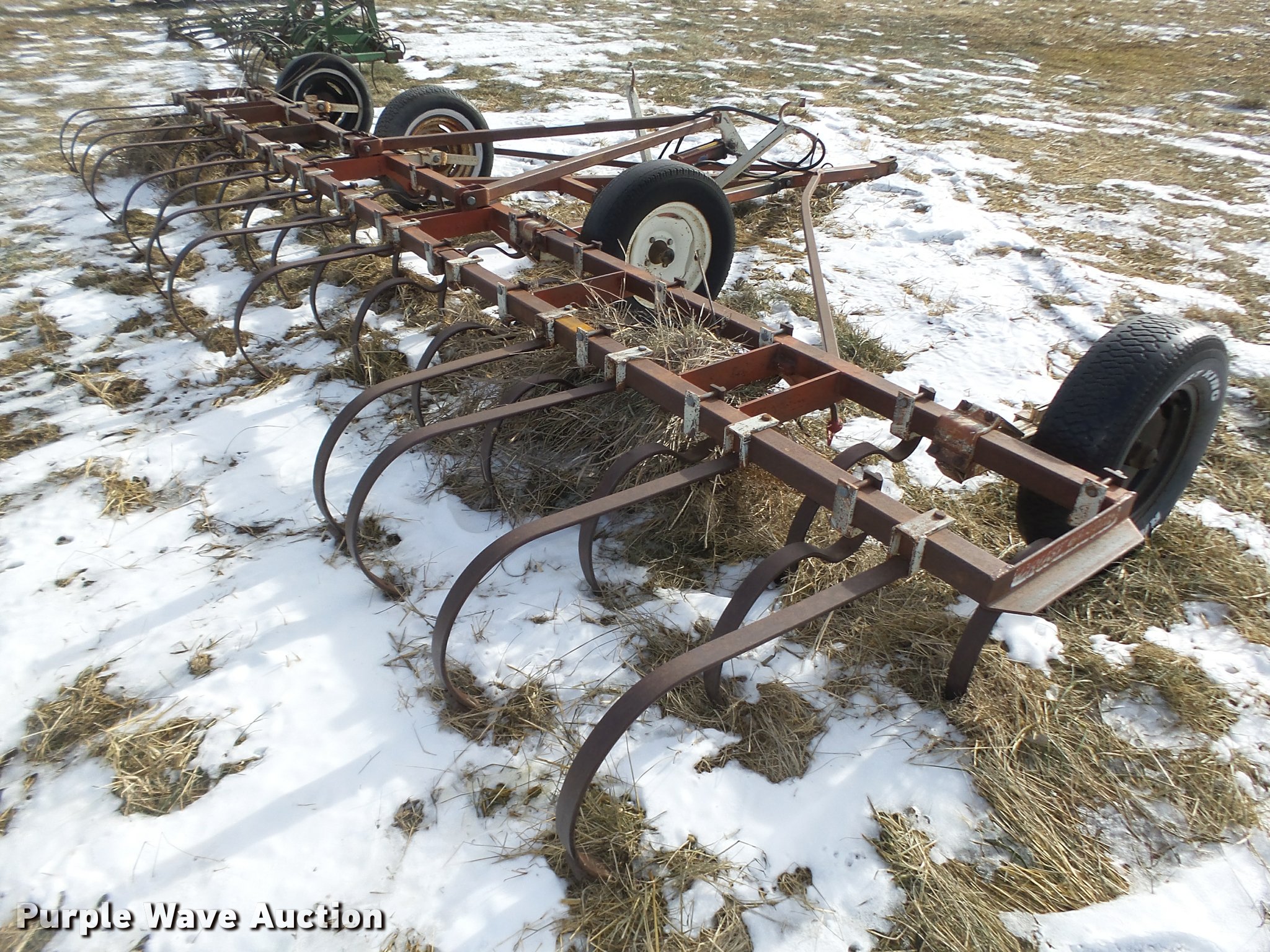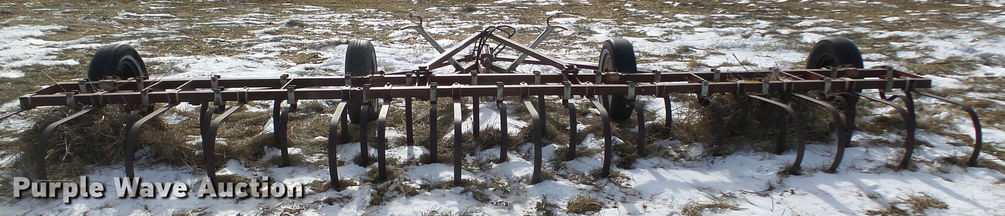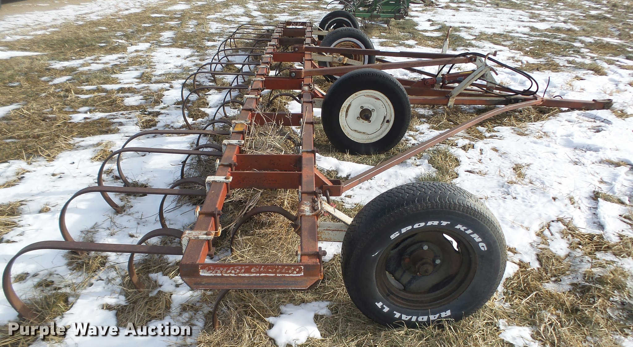 Purple Wave is selling a used Field Cultivator or Sweep Plow in Nebraska. This item is a CrustBuster field cultivator/harrow with the following: 20'W, 75" center section, 7' manual fold wings, No sweeps on spring shanks, Cross hydraulic cylinder, Pin hitch, 14" tires