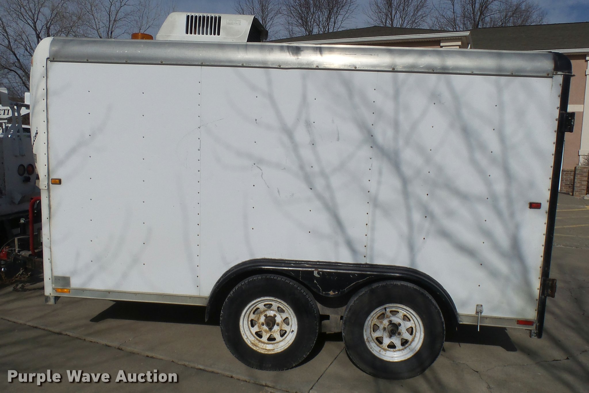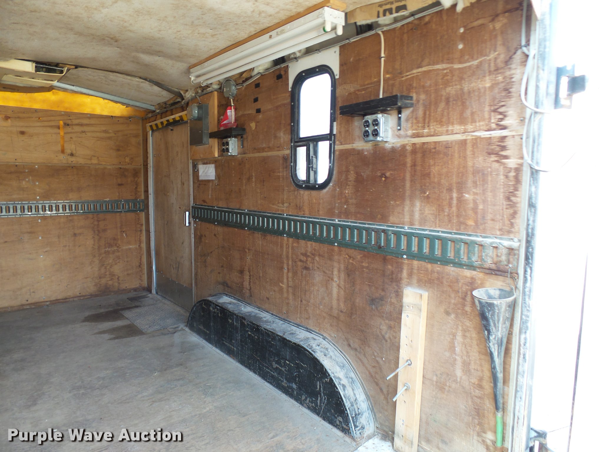 Purple Wave is selling a used Enclosed Cargo Trailer in Missouri. This item is a 1992 Wells Cargo enclosed cargo trailer with the following: 12'L, Fiberglass cone nose, Interior sight window, 36" side entry door, Rear fiberglass swing doors, Interior work bench with drawers, AC roof unit, Coleman Powermate generator, Subaru gas engine, 5,000 kW, Tongue mounted, 2 5/16" ball hitch, Tongue jack, Safety chains, Electric brakes, Safety break-away brake system, 225/75R15 tires, 10 ply, GAWR 4,500 lbs, Truck not included