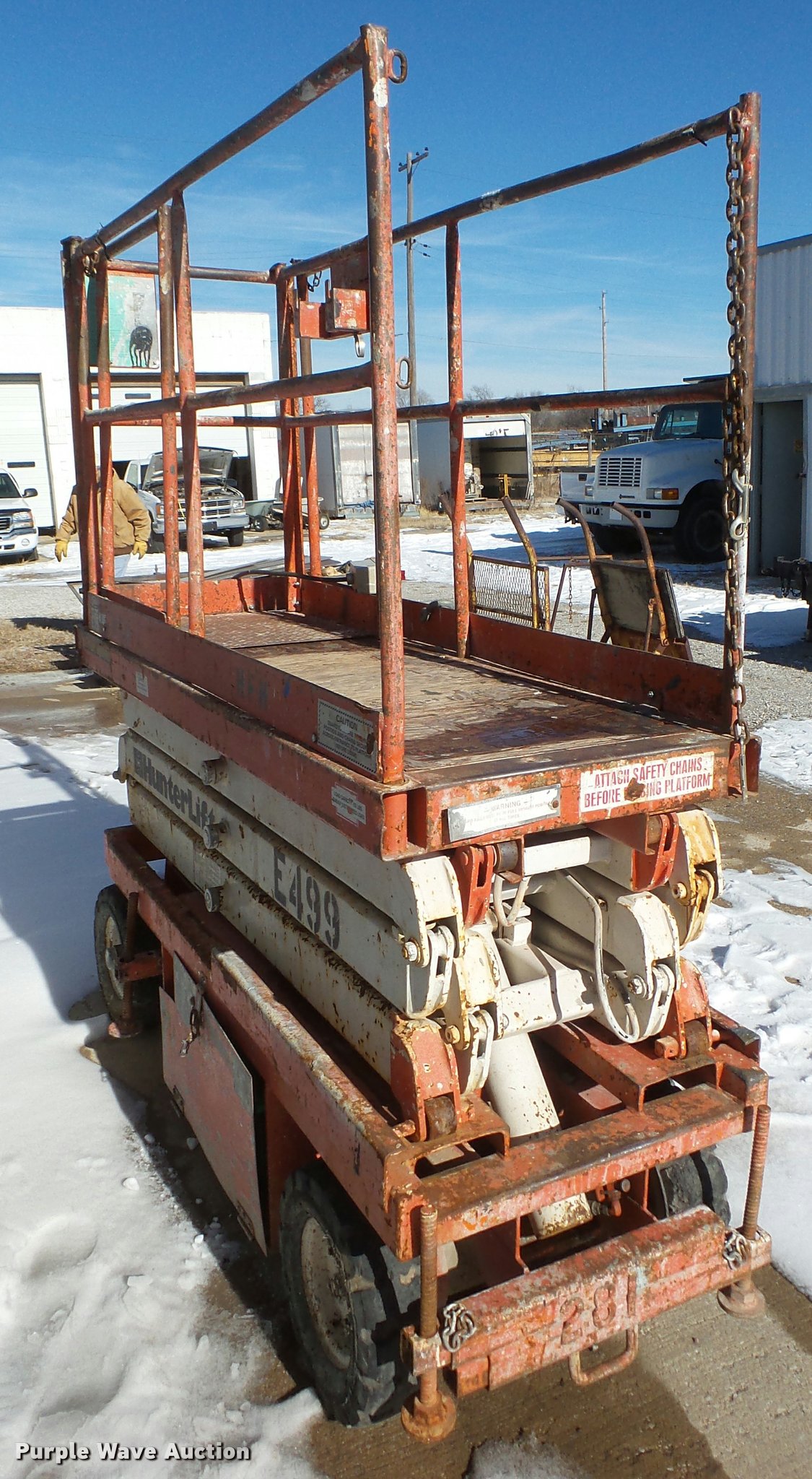 Purple Wave is selling a used Scissor or Vertical Lift in Kansas. This item is a Hunter Lift 1528 scissor lift with the following: 12V electric operation, 750 lbs max lift capacity, 15' max lift height, Ground and platform controls, 78"L x 28"W platform, Manual extensions, (4) manual outriggers, Solid tires, Dead battery