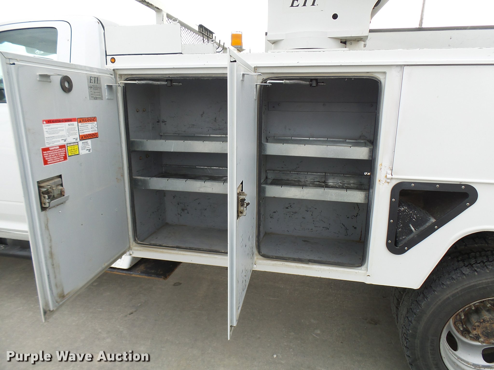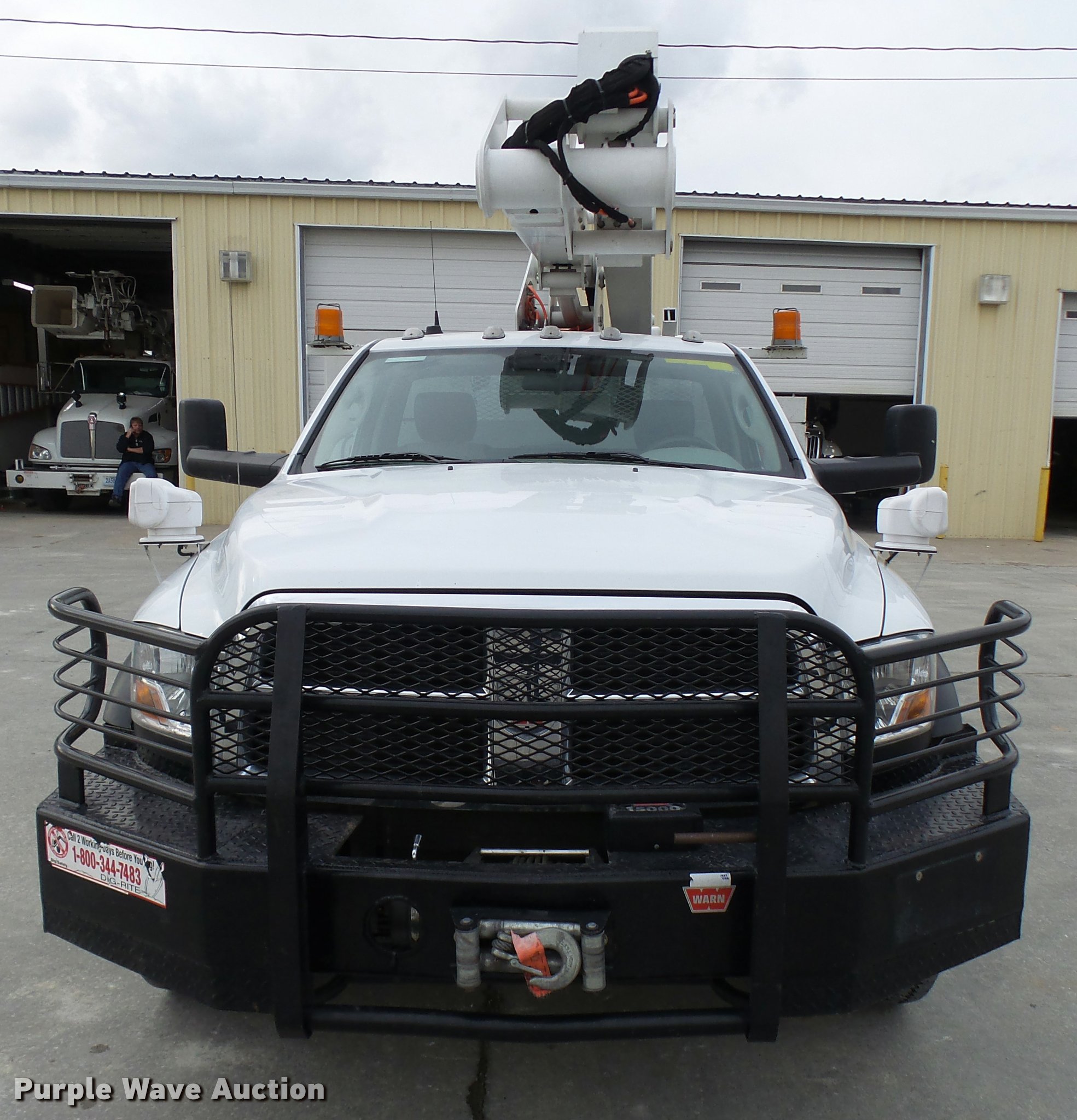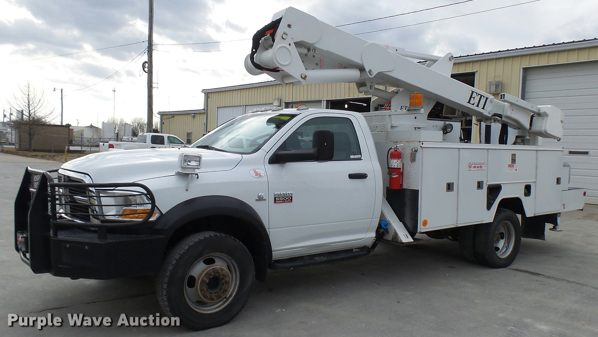Purple Wave is selling a used Bucket Truck in Missouri. This item is a 2011 Dodge Ram 5500 HD bucket truck with the following: 129,352 miles on odometer, 6.7L L6 OHV 24V turbo diesel engine, Automatic transmission, Four wheel drive, AC and heat, AM/FM/CD, PTO, Backup alarm, Beacon light, Front tow hooks, ETI SB132DD96B36Q service bed, Shelving, Compartment lights, Catwalk, Running boards, Pintle hitch, Trailer wiring, Serial 13587, 2011 ETI ETCMH37IH boom, Serial 0311CM78121, 400 lbs maximum lift capacity, 37' maximum lift height, Man basket, Ground and platform controls, Boom rotation, Articulating, insulated, telescopic boom, Rope material handler, 800 lbs capacity, (4) outriggers, Remote control, Work lights, Ranch front bumper, Warn 15,000 lbs capacity winch, Single fuel tank, Spring suspension, Hydraulic brakes, 245/70R19.5 tires, GVWR 19,500 lbs, Current bucket inspection