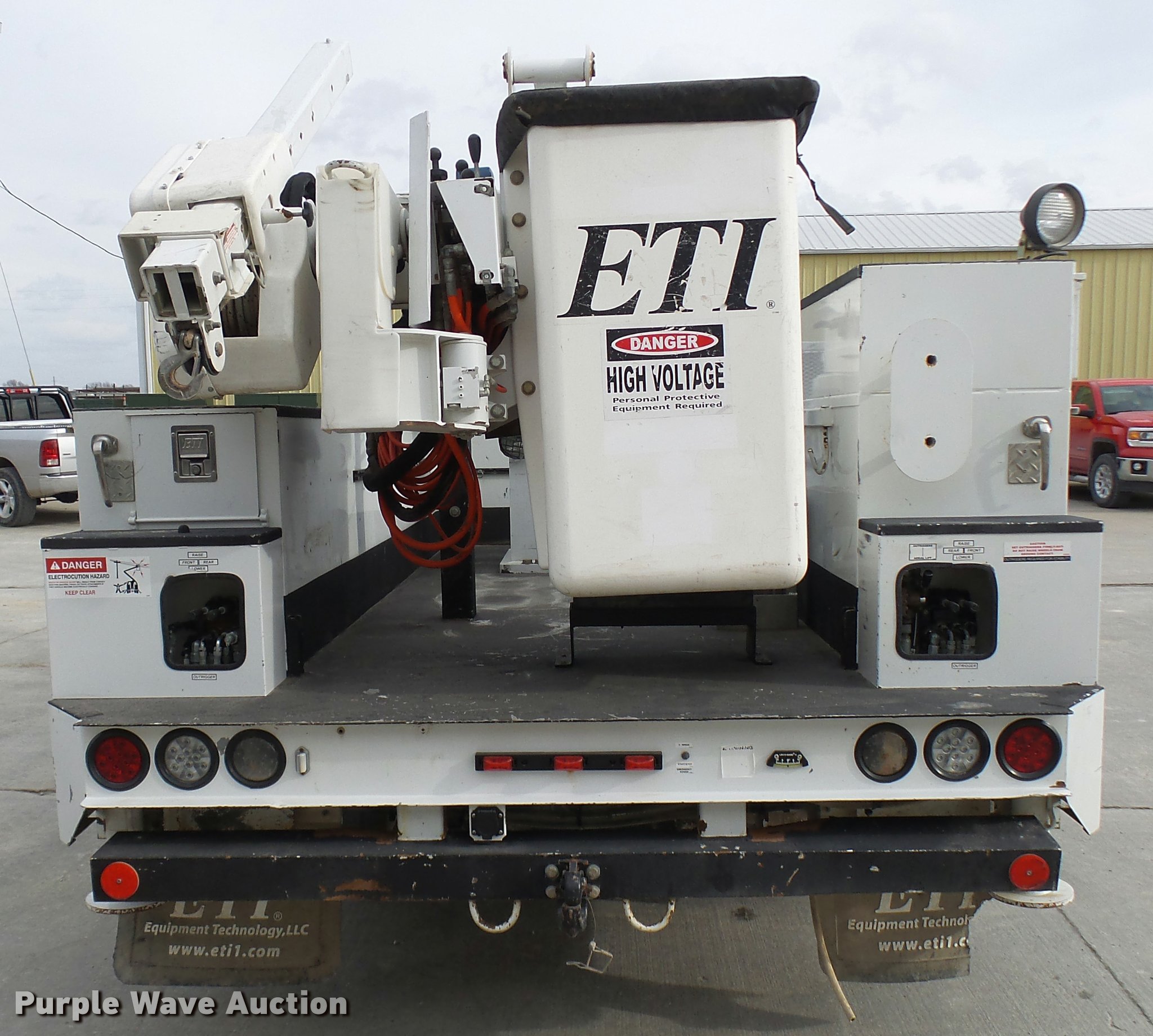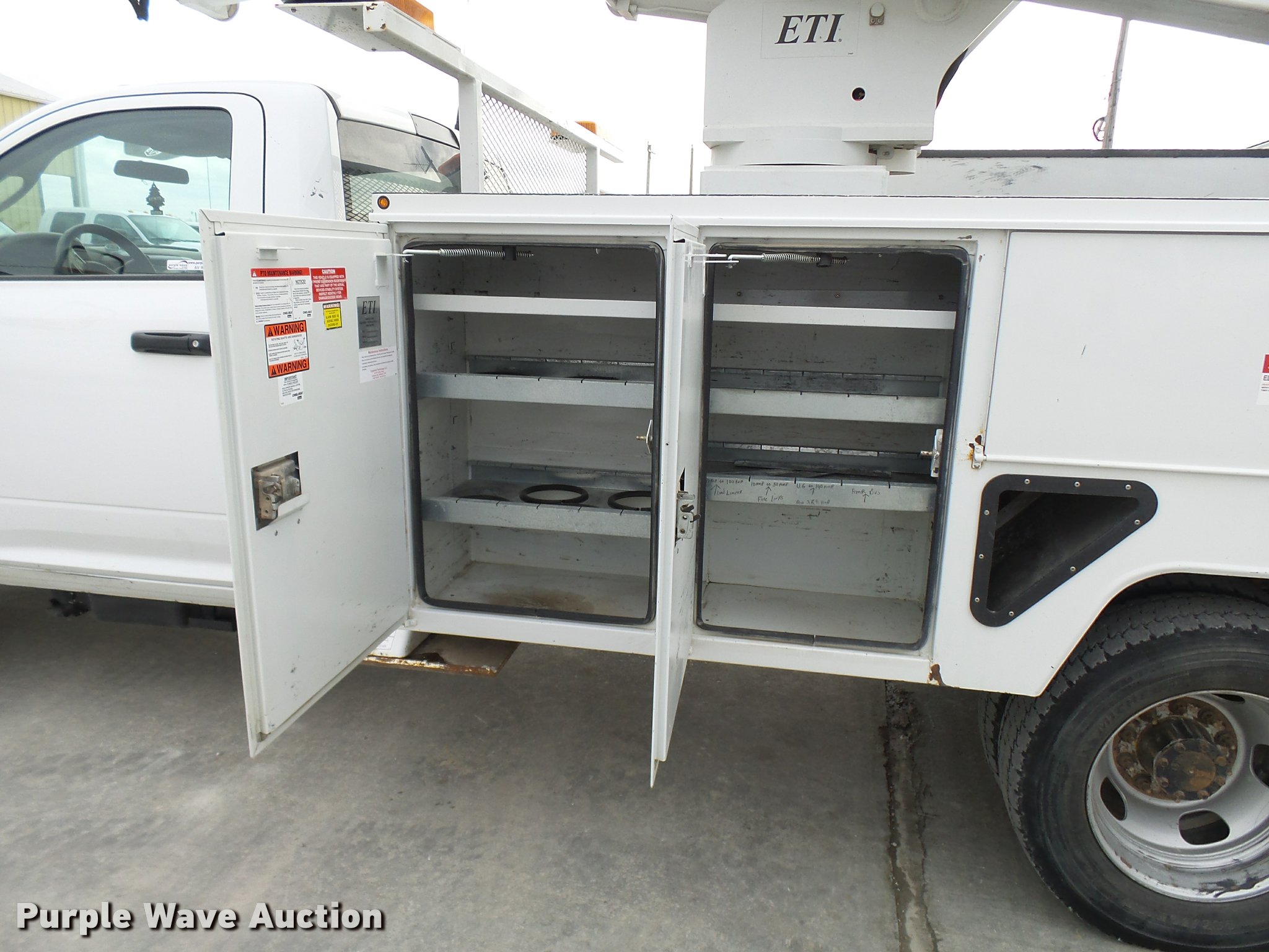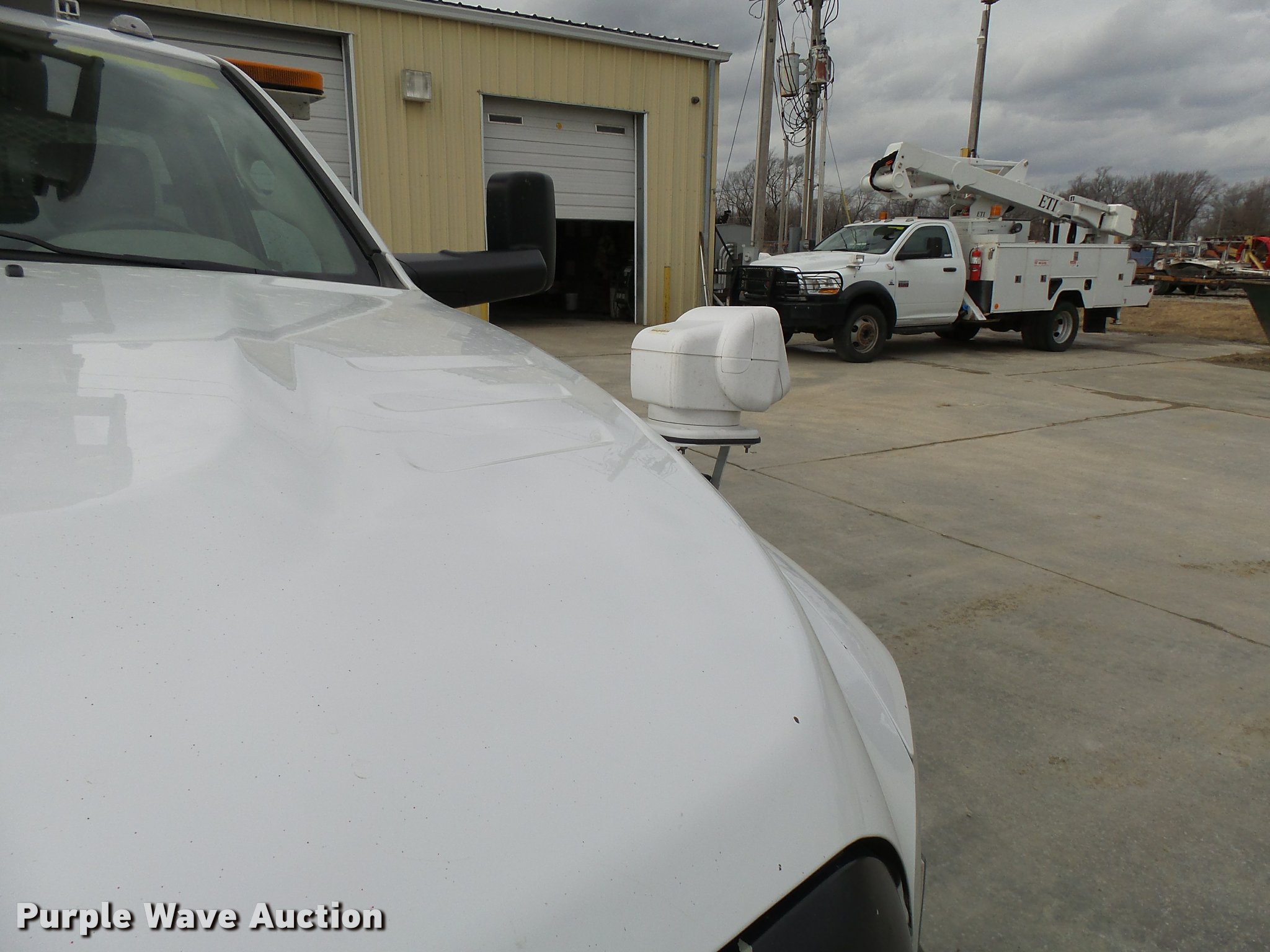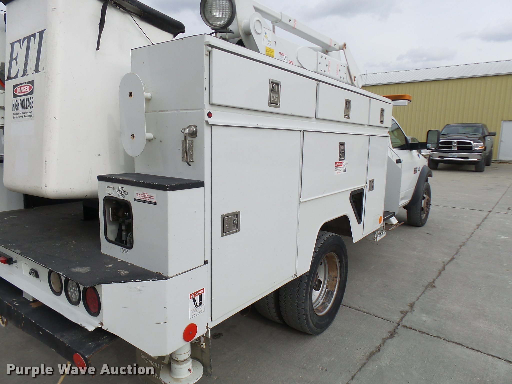 Purple Wave is selling a used Bucket Truck in Missouri. This item is a 2012 Dodge Ram 5500 HD bucket truck with the following: 138,428 miles on odometer, 6.7L L6 OHV 24V turbo diesel engine, Automatic transmission, Four wheel drive, AC and heat, AM/FM/CD, PTO, In-cab computer stand, Backup alarm, Beacon lights, Front tow hooks, ETI SB13ZDD9CB18Q service bed, Shelving, Compartment lights, Catwalk, Worklights, Pintle hitch, 2012 ETI ETCMH37IH boom, Serial 0412CM79192, 400 lbs maximum lift capacity, 37' maximum lift height, Ground and platform controls, Boom rotation, Articulating, insulated, telescopic boom, Rope material handler, 800 lbs maximum load capacity, (4) outriggers, Remote control, Spotlights, Warn 15,000 lbs capacity front winch, Single fuel tank, Spring suspension, Hydraulic brakes, Steel wheels, 245/70R19.5 tires, GVWR 19,500 lbs, Current bucket inspection
