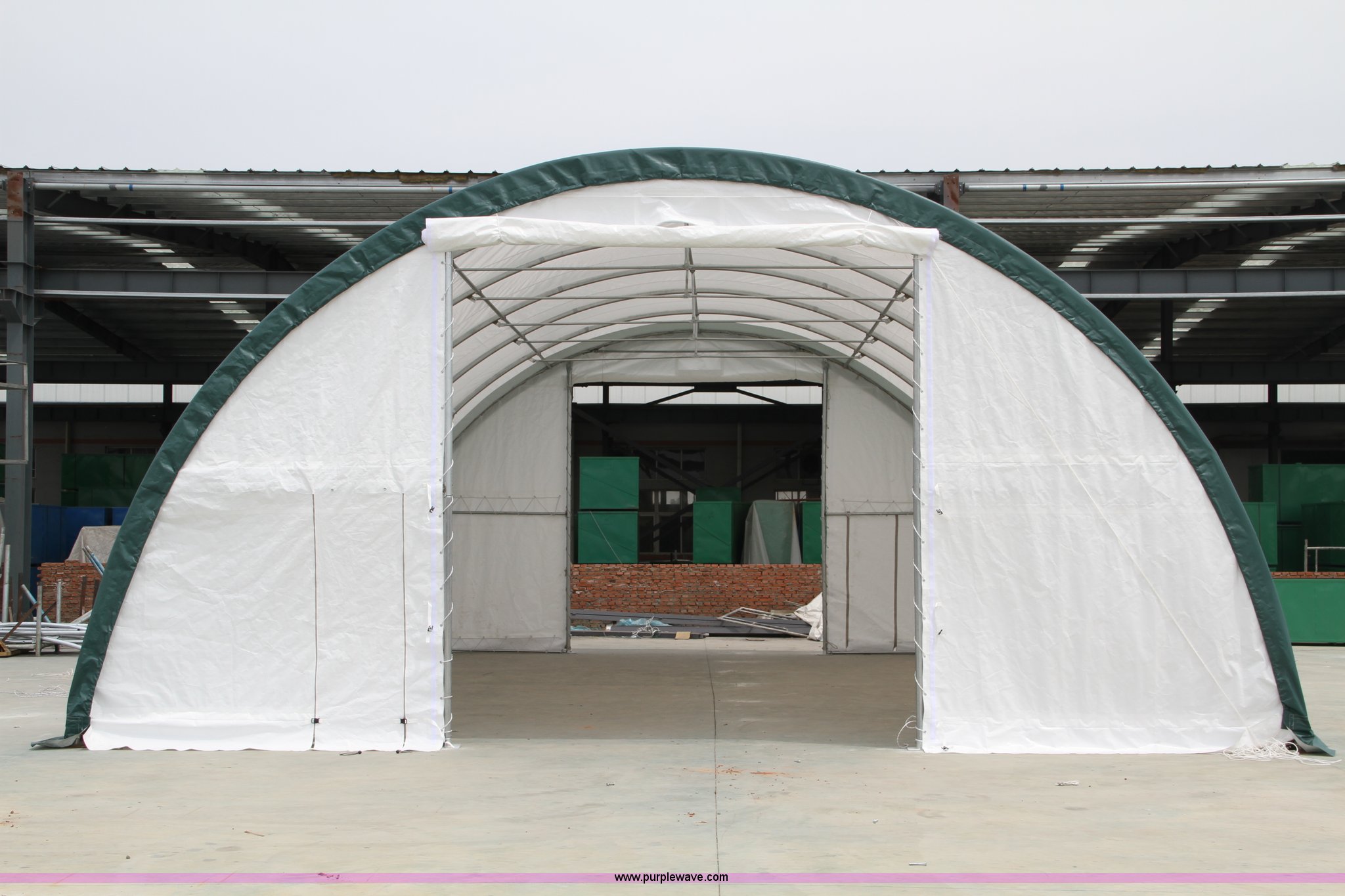Dome storage building. 65'L x 30'W x 15'H, Galvanized finished steel frame, 2 3/4" oval galvanized steel piping 15 gauge, 10 oz. PE fabric UV coating, Sway bars, Front and rear roll up doors, Ground base plates and basic anchor pegs, Green caps, White main cover, Wind brace support on each corner, Double cover tensioning system, Rod anchoring system, 10 oz. CPAI-84 fabric cover and doors, Unused. Seller provided shipping available to a commercial address with a forklift for starting at $399. Additional charges for residential and rural locations. Contact seller for specific information. Representative photo. Canada West Supply. 17451 Bayside Drive. Tonganoxie, KS 66086