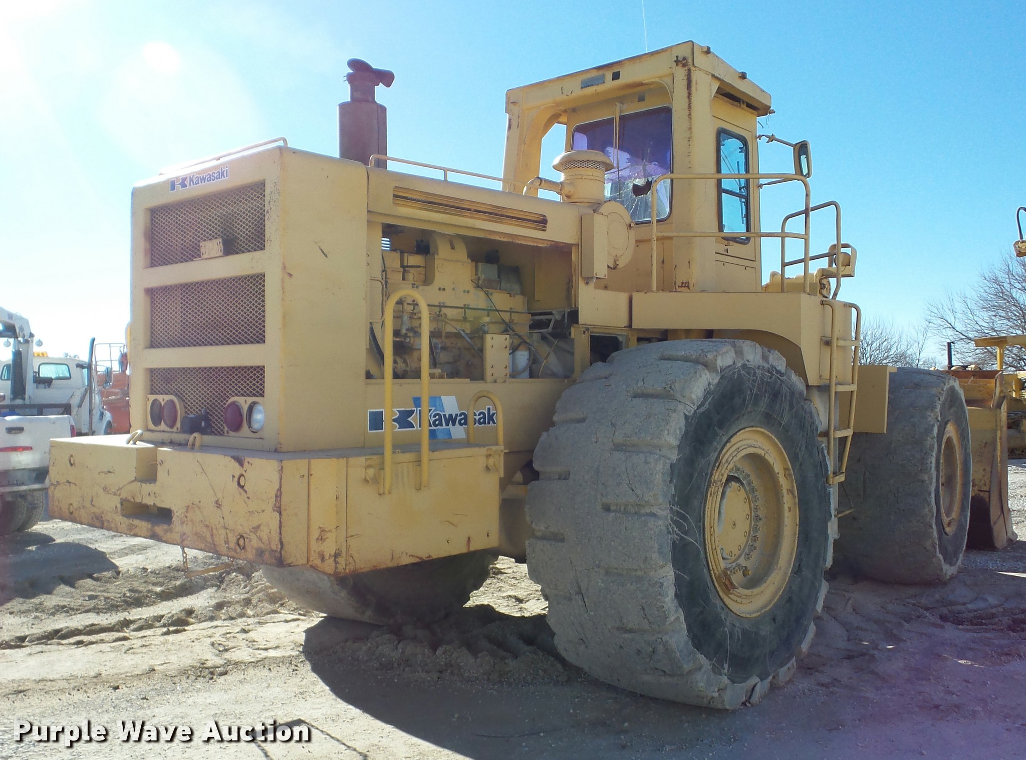 Purple Wave is selling a used Wheel Loader in Missouri. This item is a 1988 Kawasaki 110Z II wheel loader with the following: 6,199 hours on meter, KT Cummins 1150 six cylinder turbo diesel engine, 450 HP, Powershift transmission, 3F-3R gears, EROPS, Heat, Two-lever bucket controls, Backup alarm, 12'W bucket, 10 cu. yd. capacity, Weld-on cutting edge, Counterweight, 35-65-33 tires, Serial 110Z25008