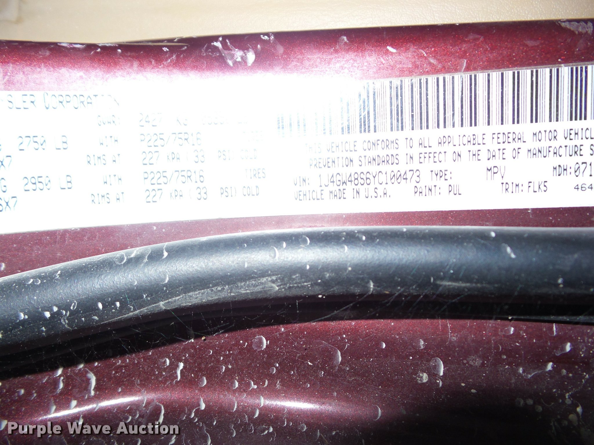 Purple Wave is selling a used Passenger Vehicle in Kansas. This item is a 2000 Jeep Grand Cherokee SUV with the following: Unknown miles on odometer, 4.0L L6 OHV 12V gas engine, Automatic transmission, Four wheel drive, AC and heat, Tilt, Cruise, AM/FM/CD/cassette, Power windows, locks, mirrors, and seat, Vinyl interior, P235/70R16 tires, Unknown operating condition
