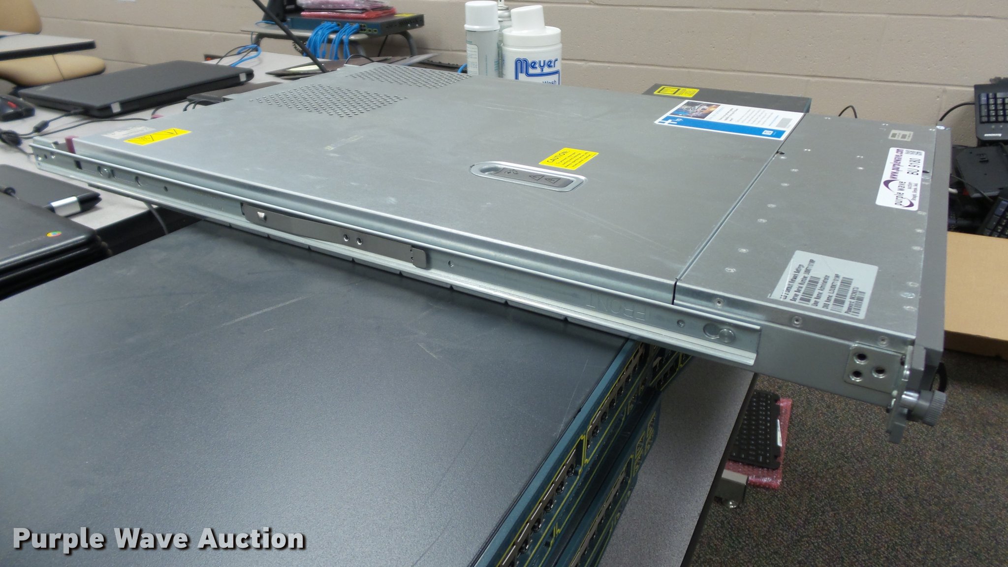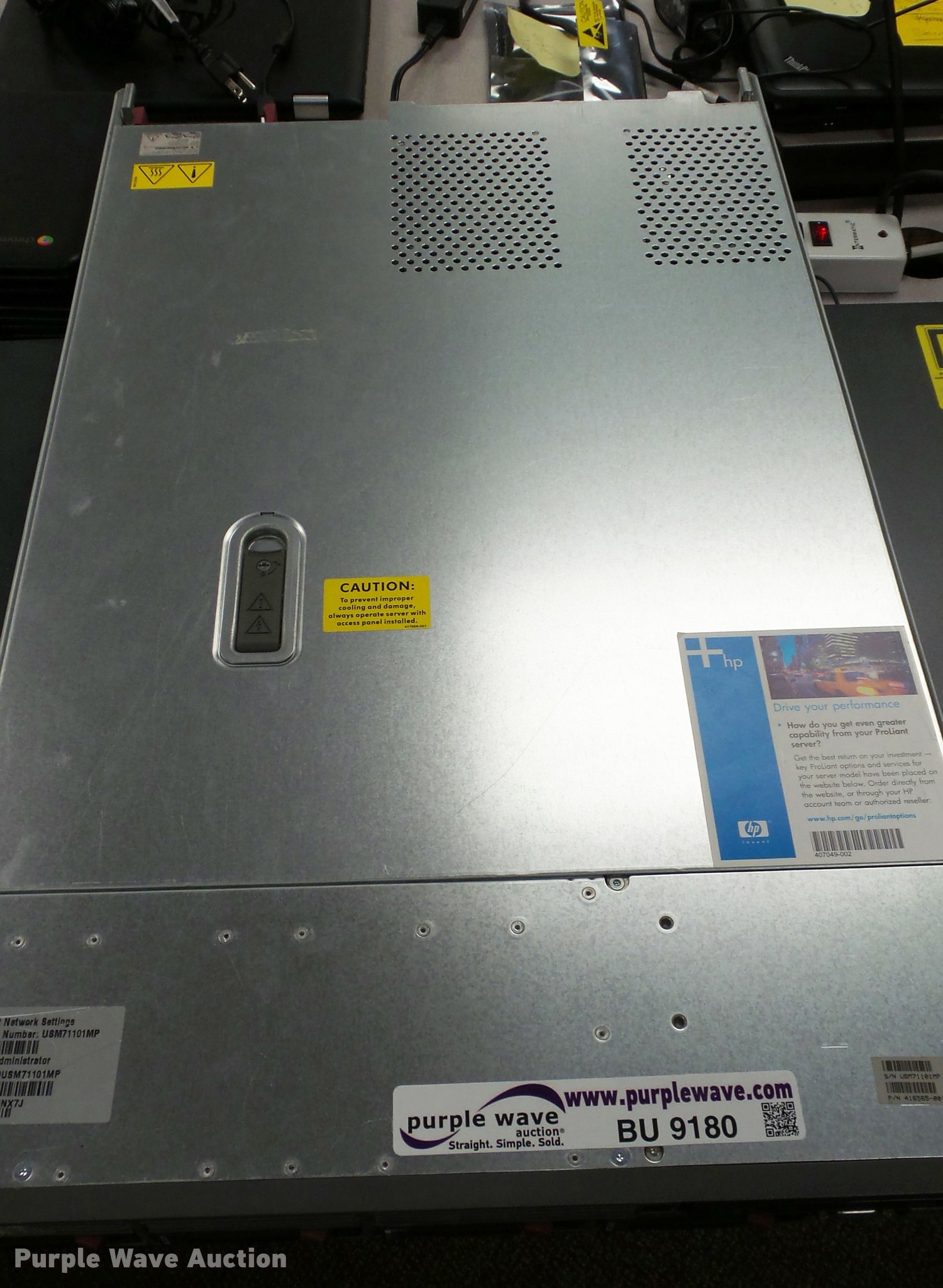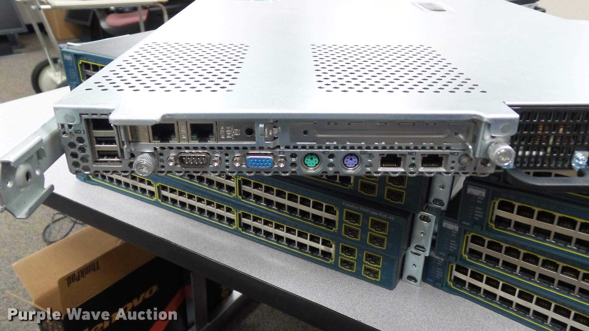 Purple Wave is selling a used Electronics in Kansas. This item is a HP Proliant DL360 G5 server with the following: (2) Intel Xenon Dual-Core processors, 12 GB memory, (4) 72 GB 10k hot-swappable disk drives, (2) power supplies, HP NC-360T dual port network controller