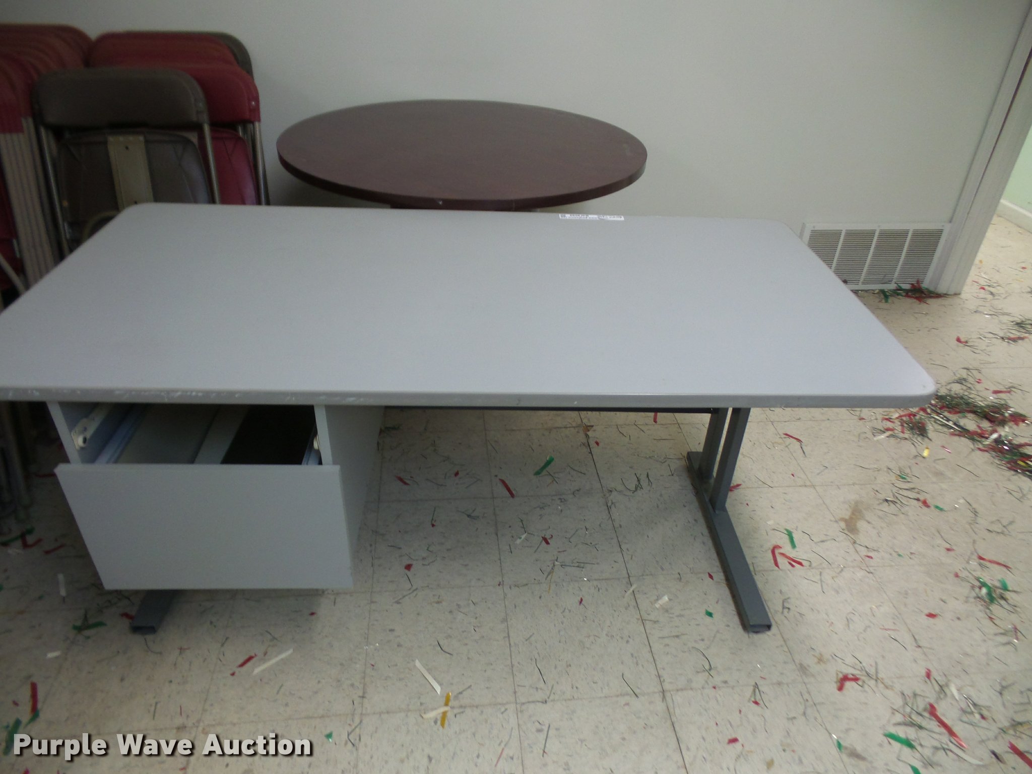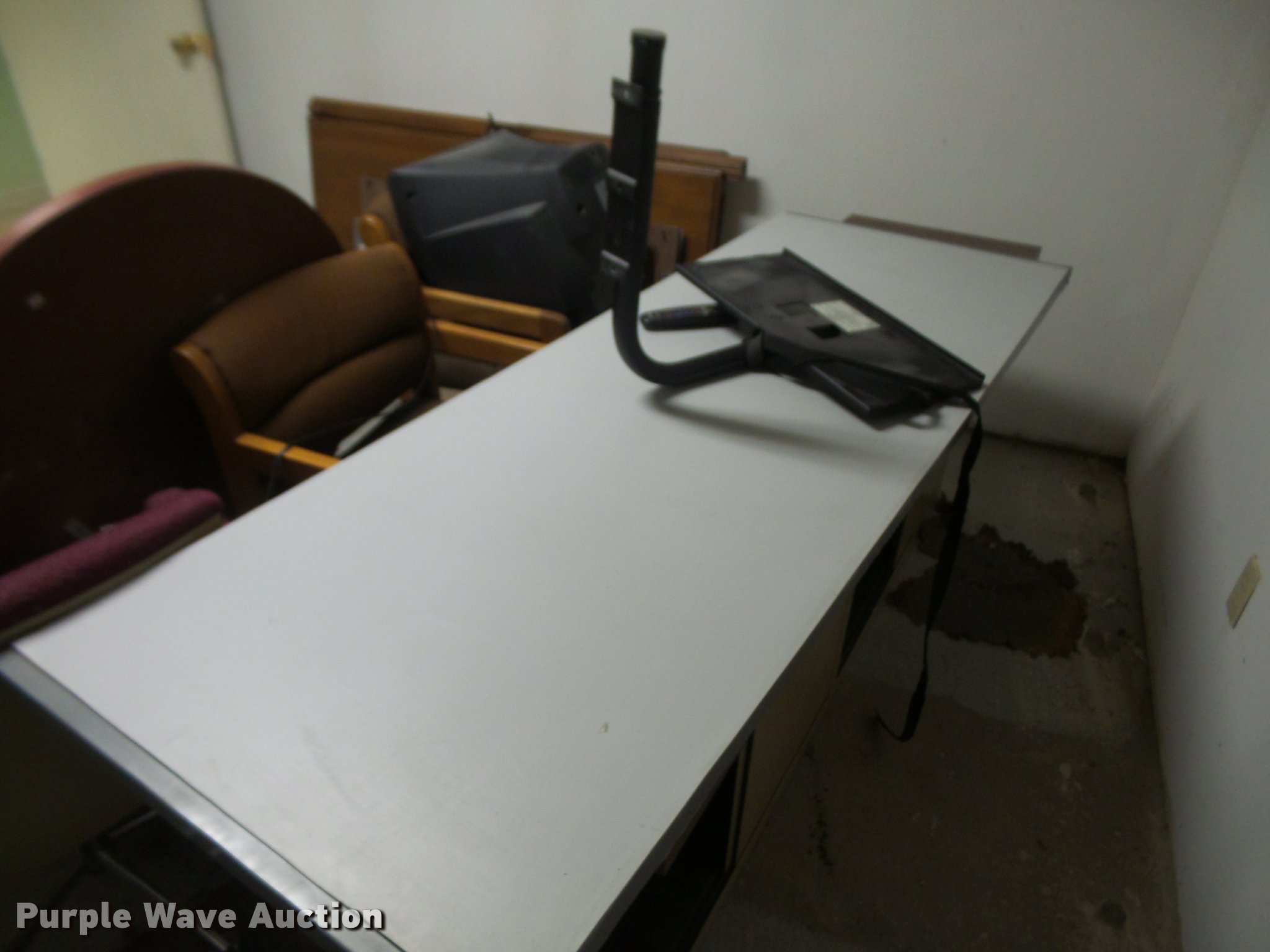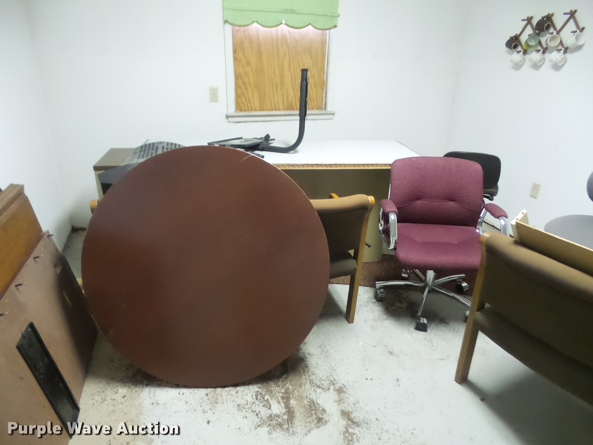 Purple Wave is selling a used Furniture in Kansas. This item is a Furniture with the following: 42" round table, 60" x 30" desk, (9) assorted chairs, 72"L x 18"D cabinets, Television, Printer, Paper shredder, 60" x 30" desk, Legs have been removed