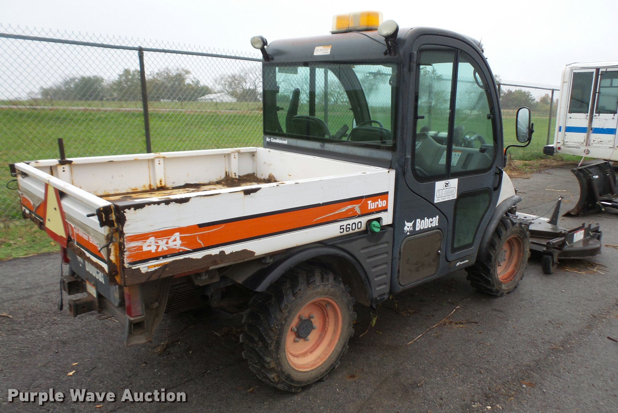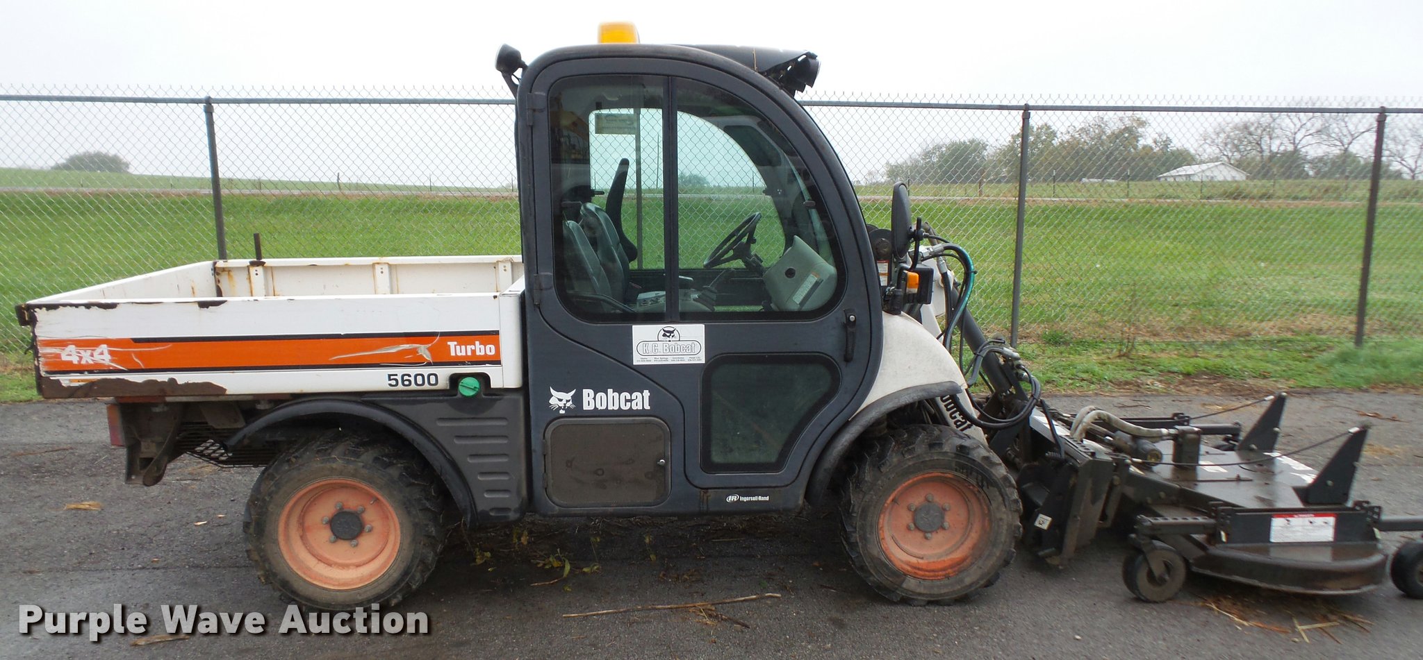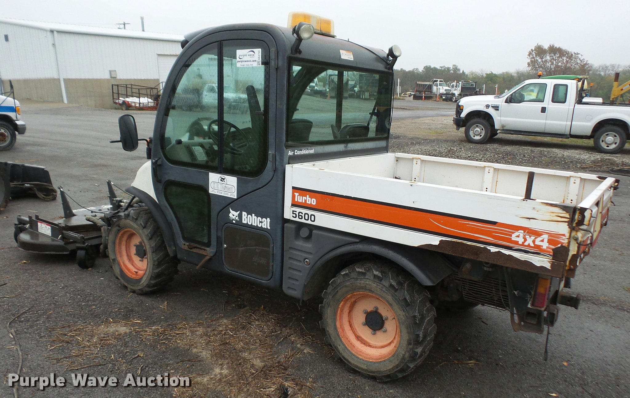 Purple Wave is selling a used Utility Vehicle in Kansas. This item is a 2005 Bobcat Toolcat 5600 utility work machine with the following: 1,667 hours on meter, Kubota 2.0L four cylinder turbo diesel engine, 59 HP, Hydrostatic transmission, Four wheel drive, Four wheel steering, Enclosed cab, AC and heat, Work lights, 64"L x 57"W hydraulic dump bed, 60"W bucket, 72"W mower attachment, Serial 230400734, Receiver hitch, 27x10.50-15 tires