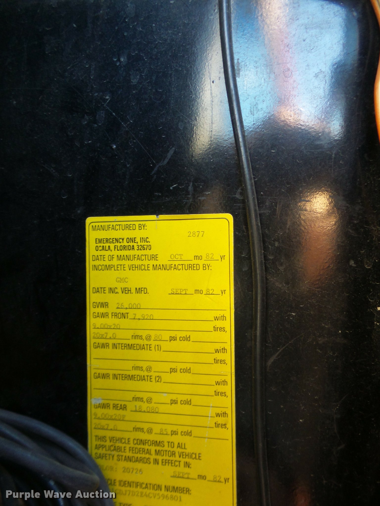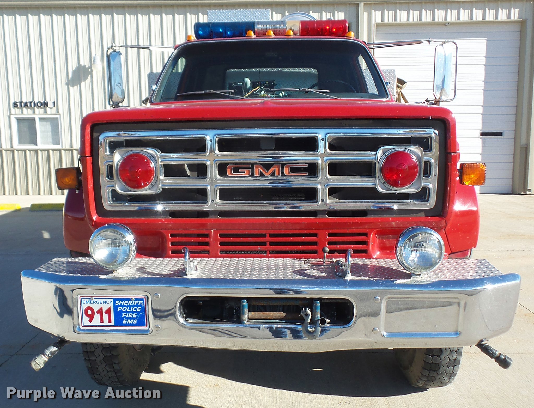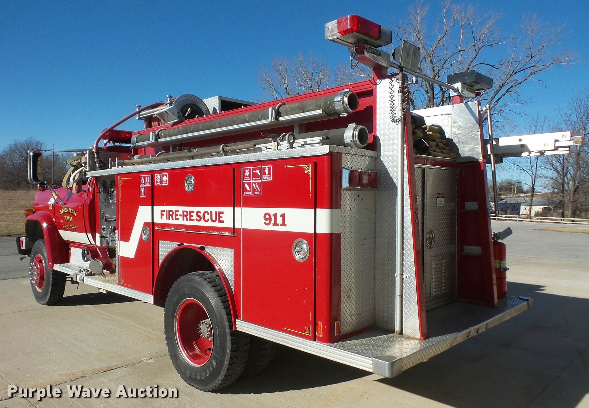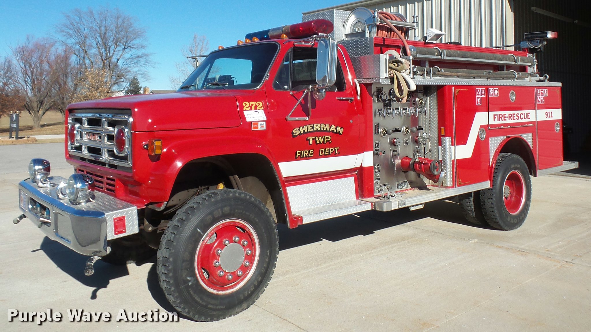 Purple Wave is selling a used Fire Truck or Emergency Vehicle in Kansas. This item is a 1982 GMC 7000 pumper fire truck with the following: 33,738 miles on odometer, 429 C.I.D. V8 gas engine, Allison automatic transmission, Four wheel drive, Single axle, Heat, Light bar, Hurst extraction unit, Emergency One tank bed, 15'L, 750 gallon capacity, 24' ladder, 14' ladder, Roof hook and extension, 750 gpm pump, 11 HP gas engine, Hose reel and hose, Attic ladder, Pipe pole, 5,000 watt generator, Single fuel tank, 9.00-20 tires, Hose and nozzles not included, Radio not included