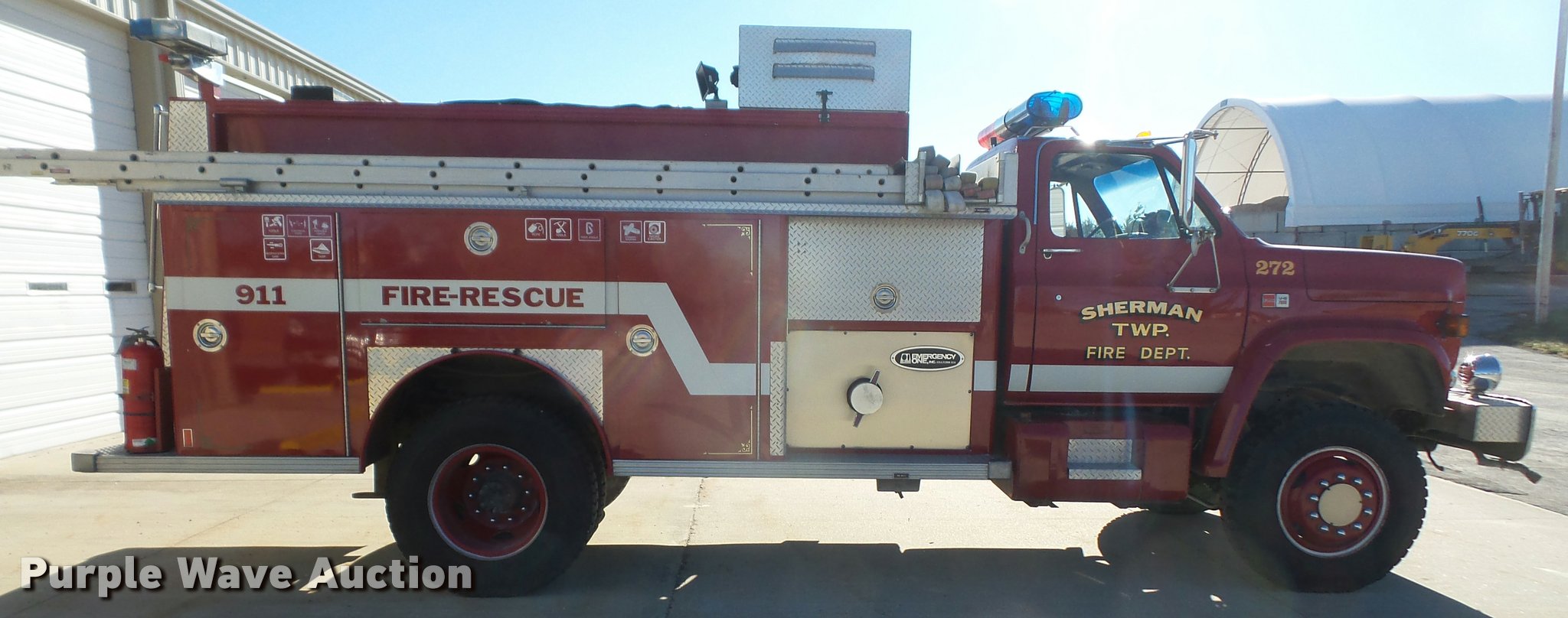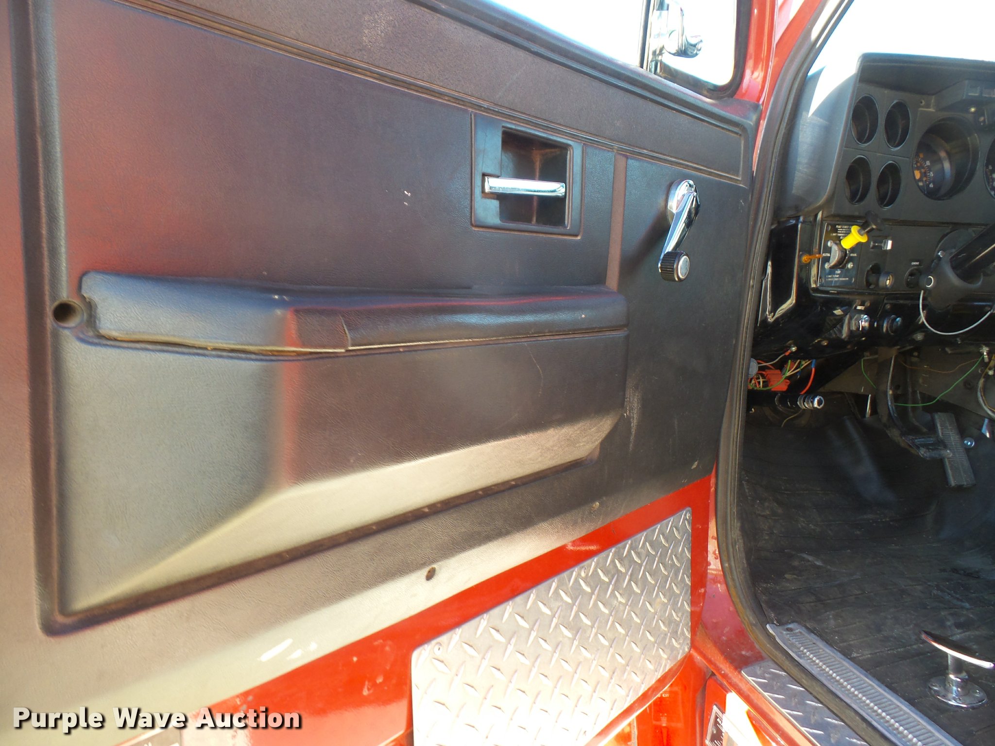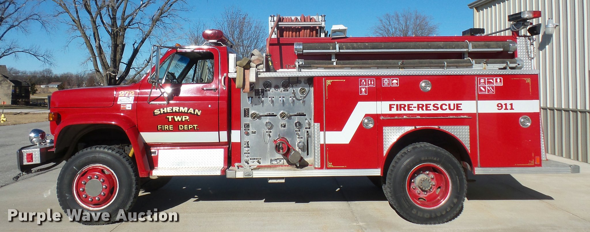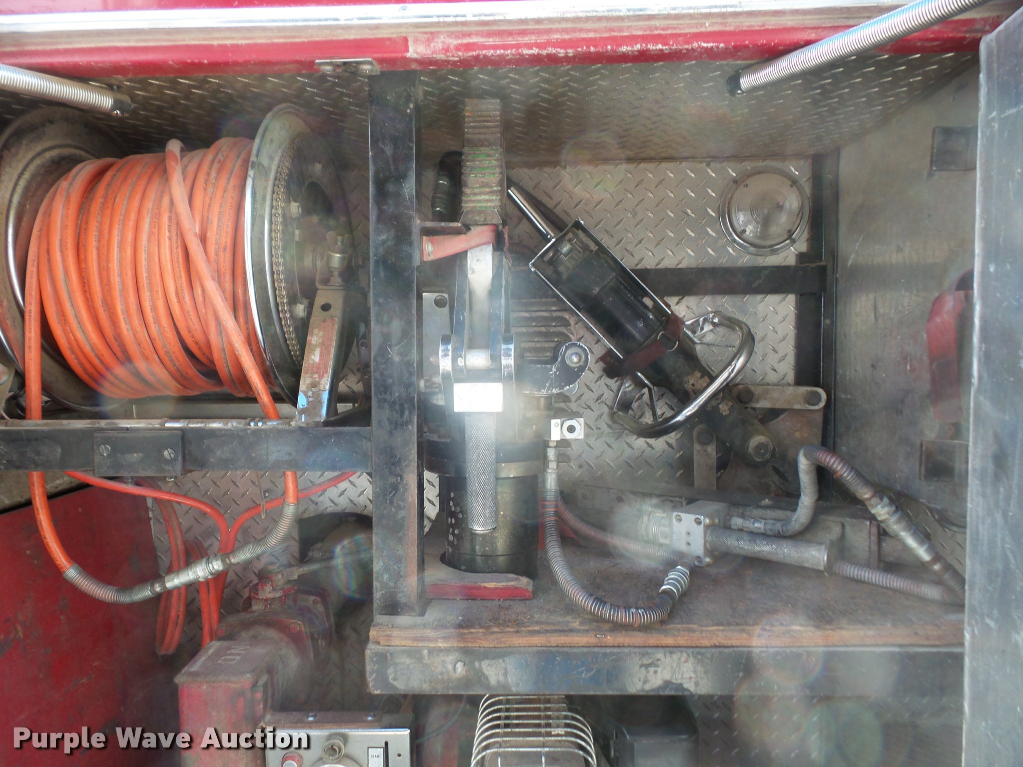 Purple Wave is selling a used Fire Truck or Emergency Vehicle in Kansas. This item is a 1982 GMC 7000 pumper fire truck with the following: 33,738 miles on odometer, 429 C.I.D. V8 gas engine, Allison automatic transmission, Four wheel drive, Single axle, Heat, Light bar, Hurst extraction unit, Emergency One tank bed, 15'L, 750 gallon capacity, 24' ladder, 14' ladder, Roof hook and extension, 750 gpm pump, 11 HP gas engine, Hose reel and hose, Attic ladder, Pipe pole, 5,000 watt generator, Single fuel tank, 9.00-20 tires, Hose and nozzles not included, Radio not included