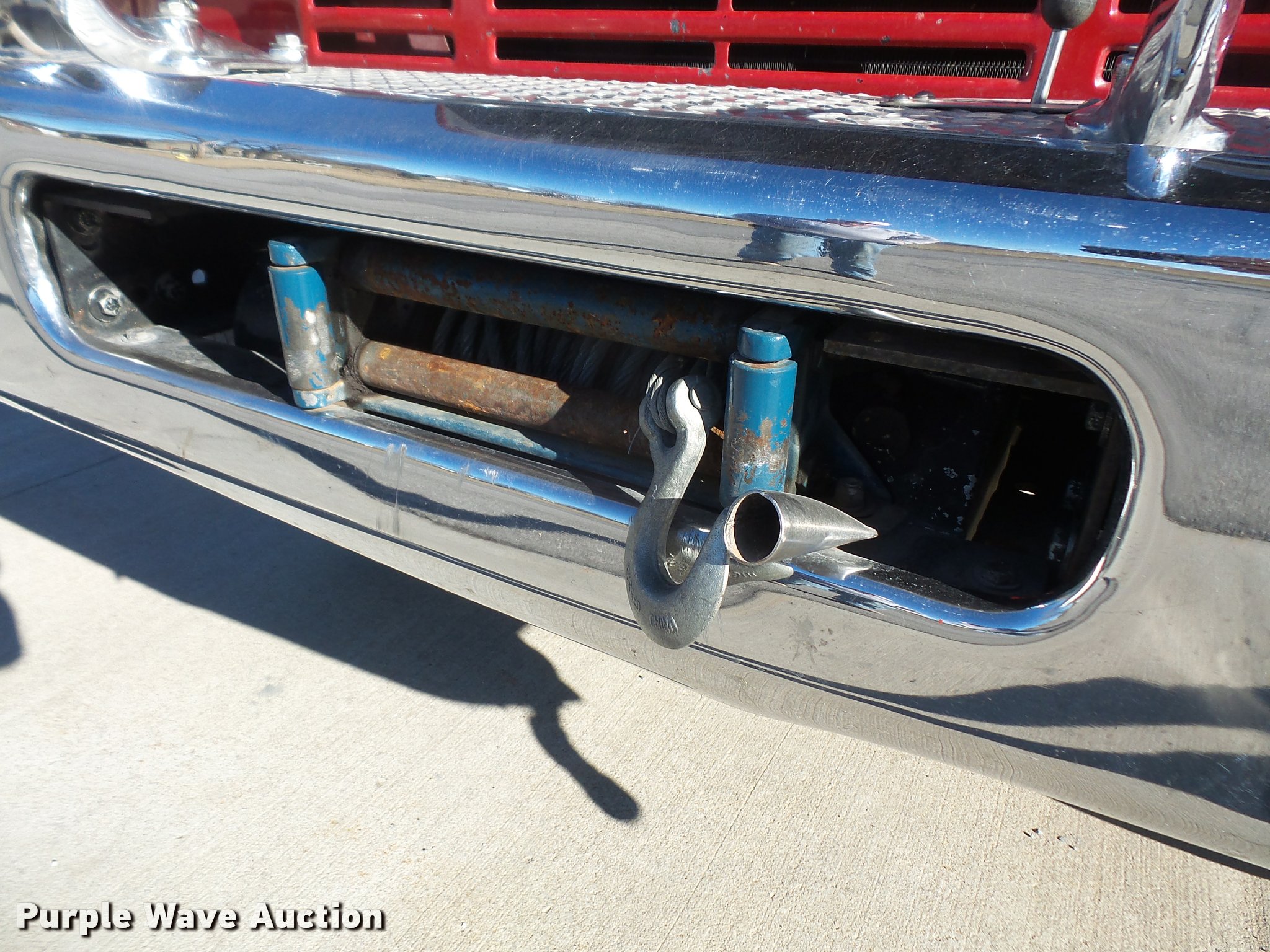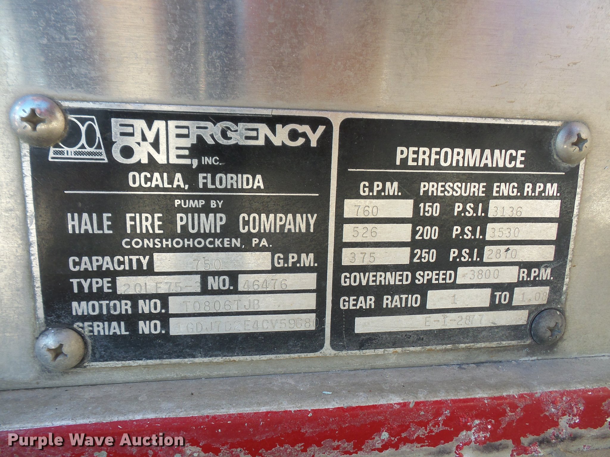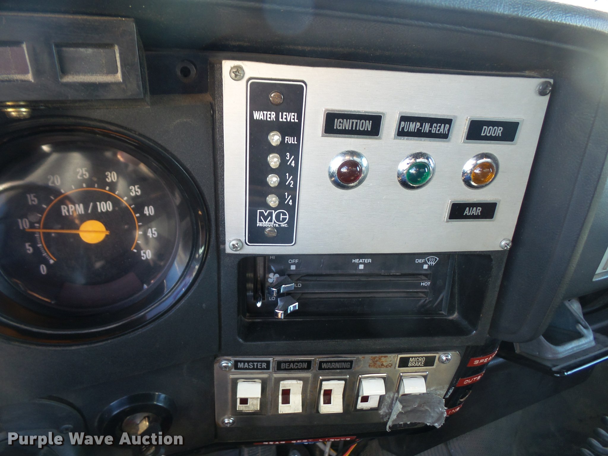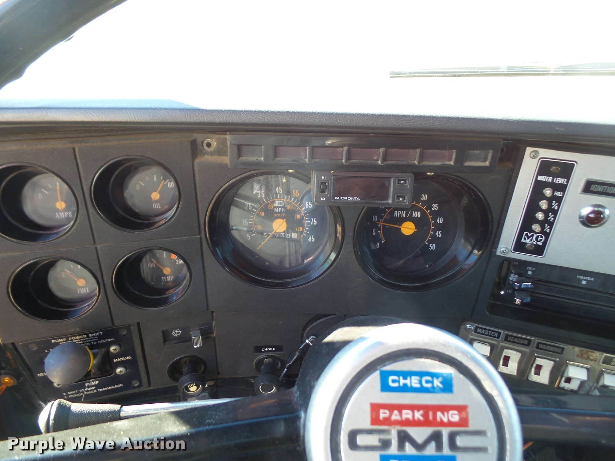 Purple Wave is selling a used Fire Truck or Emergency Vehicle in Kansas. This item is a 1982 GMC 7000 pumper fire truck with the following: 33,738 miles on odometer, 429 C.I.D. V8 gas engine, Allison automatic transmission, Four wheel drive, Single axle, Heat, Light bar, Hurst extraction unit, Emergency One tank bed, 15'L, 750 gallon capacity, 24' ladder, 14' ladder, Roof hook and extension, 750 gpm pump, 11 HP gas engine, Hose reel and hose, Attic ladder, Pipe pole, 5,000 watt generator, Single fuel tank, 9.00-20 tires, Hose and nozzles not included, Radio not included