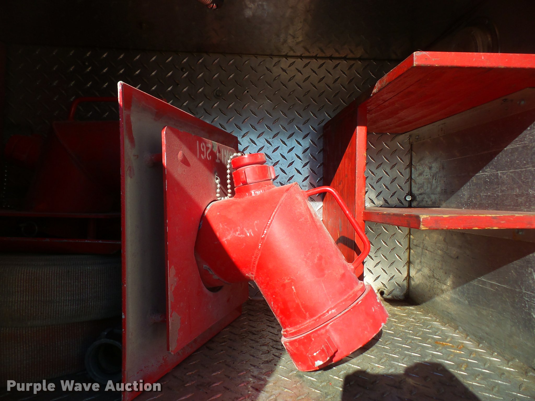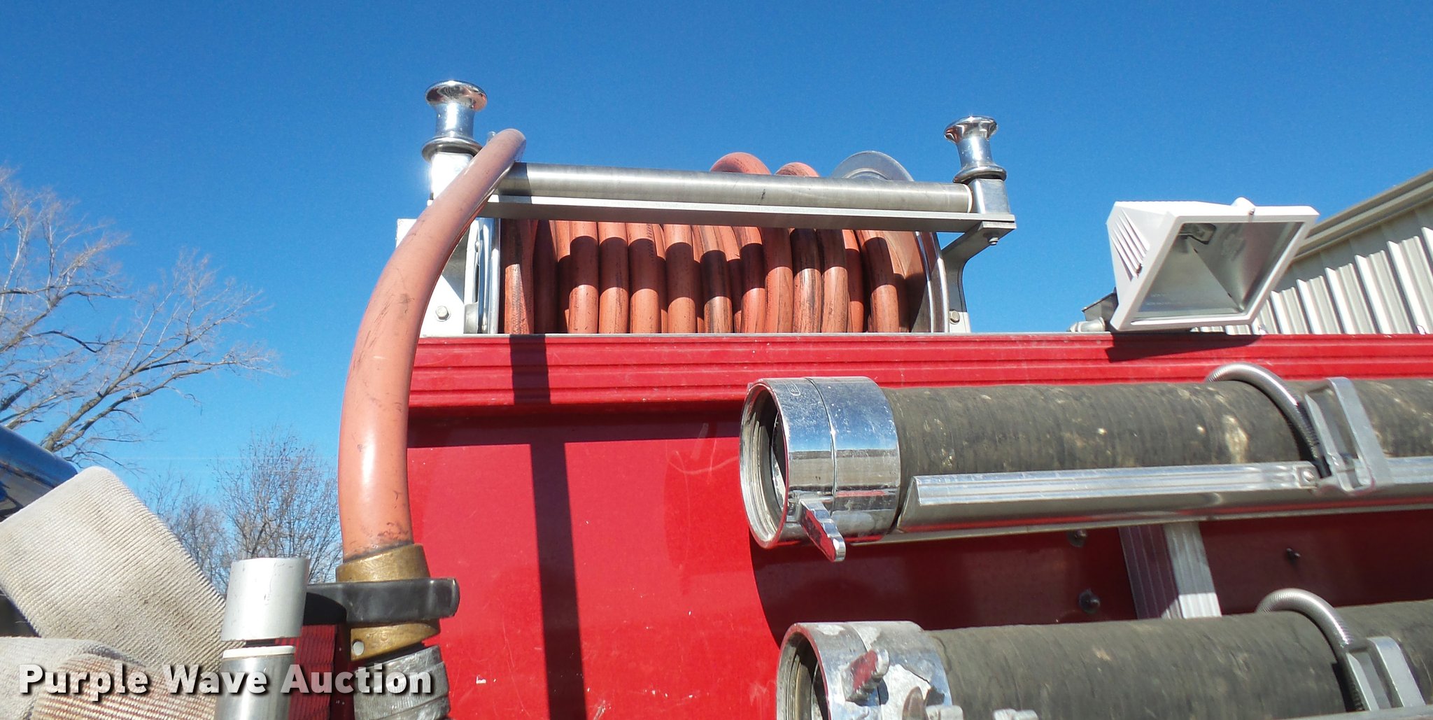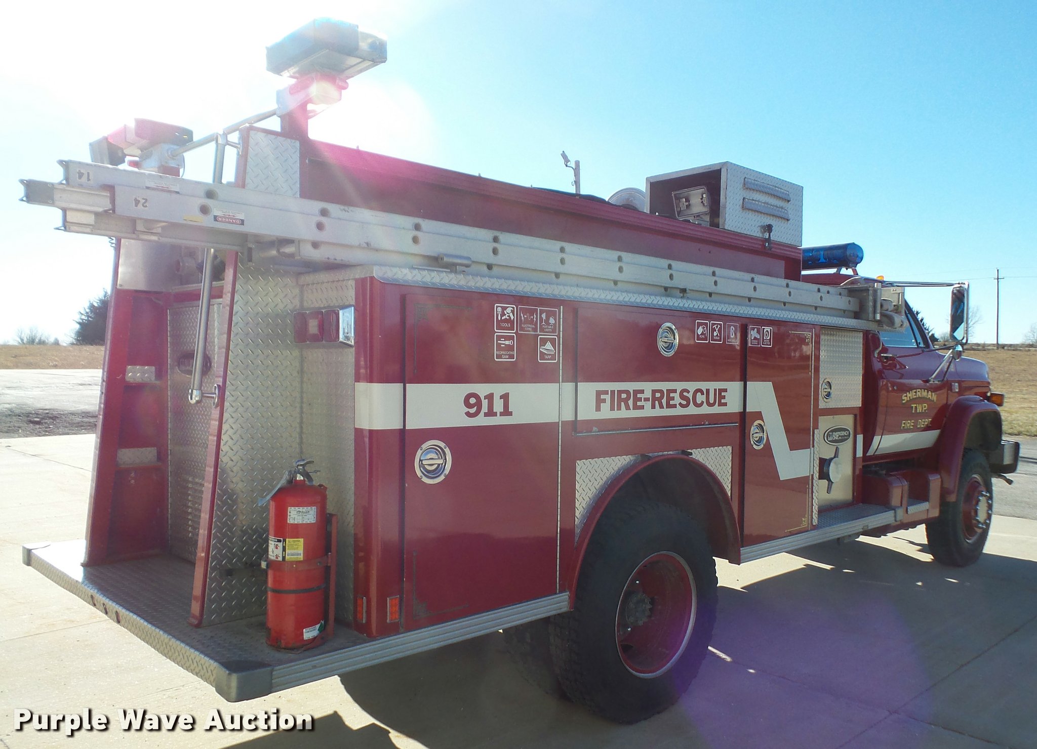 1982 GMC 7000 pumper fire truck. 33,738 miles on odometer, 429 C.I.D. V8 gas engine, Allison automatic transmission, Four wheel drive, Single axle, Heat, Light bar, Hurst extraction unit, Emergency One tank bed 15'L, 750 gallon capacity, 24' ladder, 14' ladder, Roof hook and extension, 750 gpm pump, 11 HP gas engine, Hose reel and hose, Attic ladder, Pipe pole, 5,000 watt generator, Single fuel tank, 9.00-20 tires, Hose and nozzles not included, Radio not included. Kansas title. 1GDJ7D2E4CV596801. Sherman Township. 16971 Kreider Rd. Bonner Springs, KS 66012
