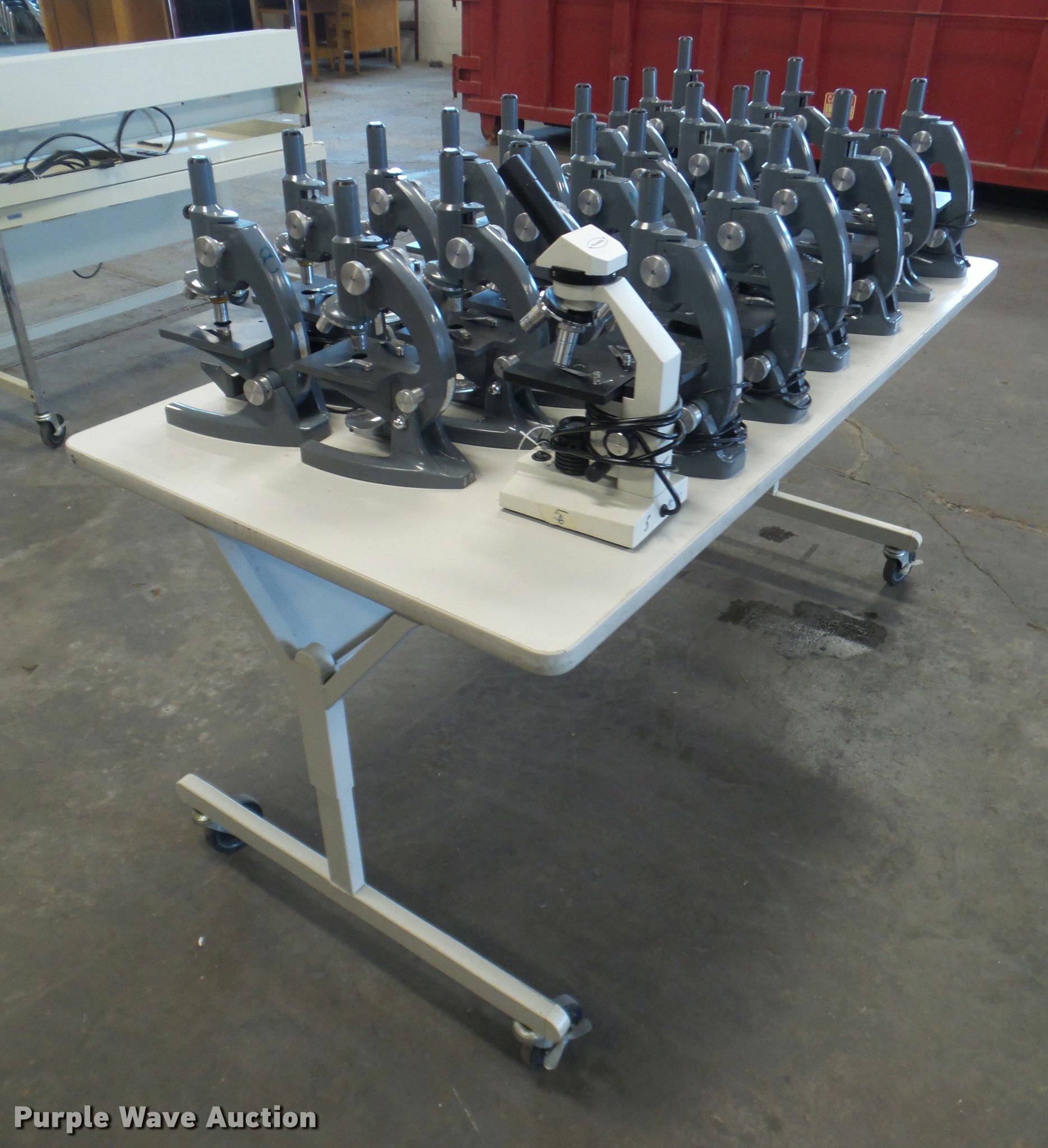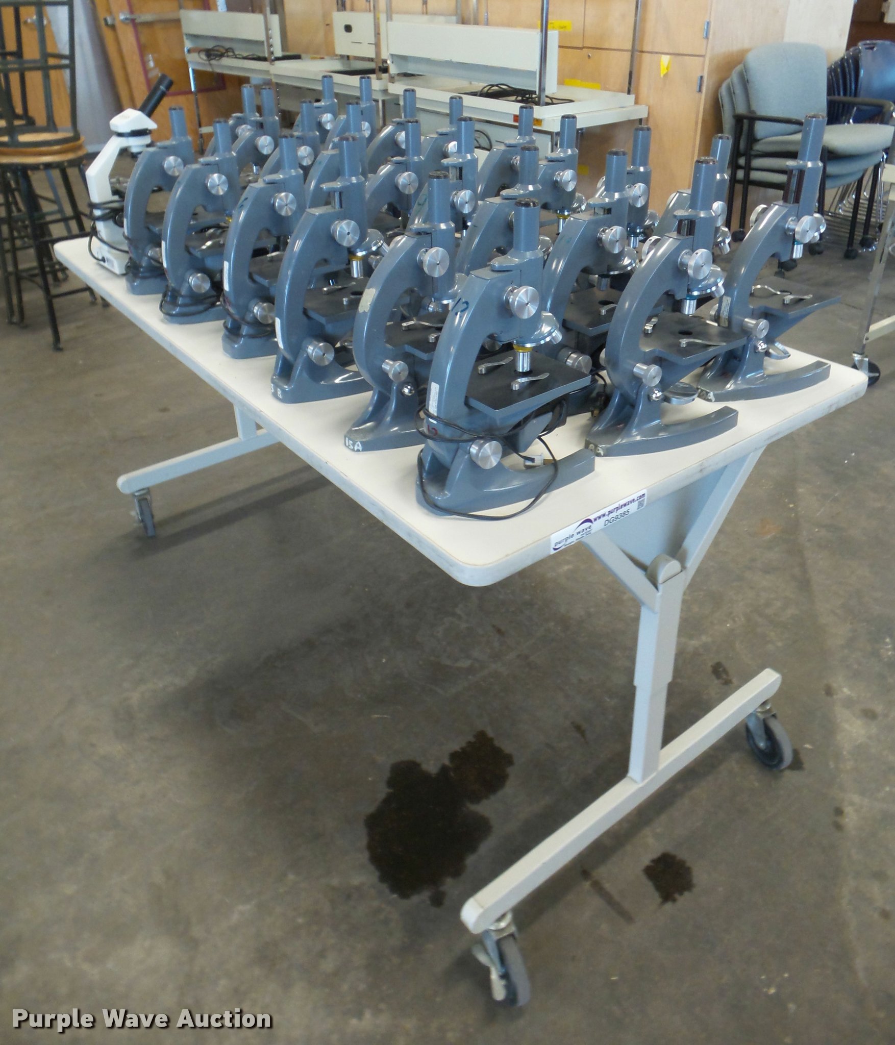 Purple Wave is selling a used Medical Equip. in Kansas. This item is a Approximately 25 microscopes with the following: Desk, Various styles and conditions