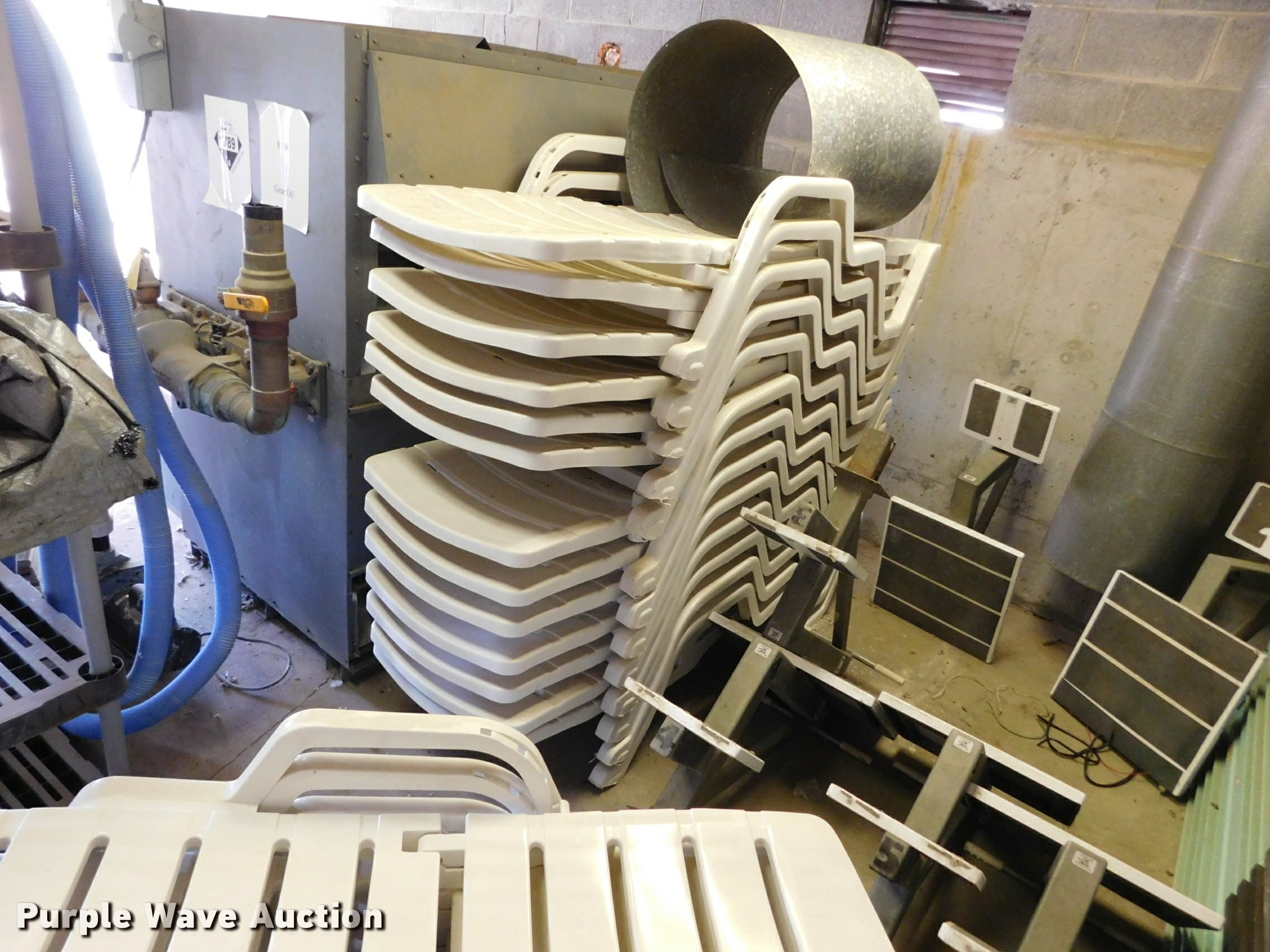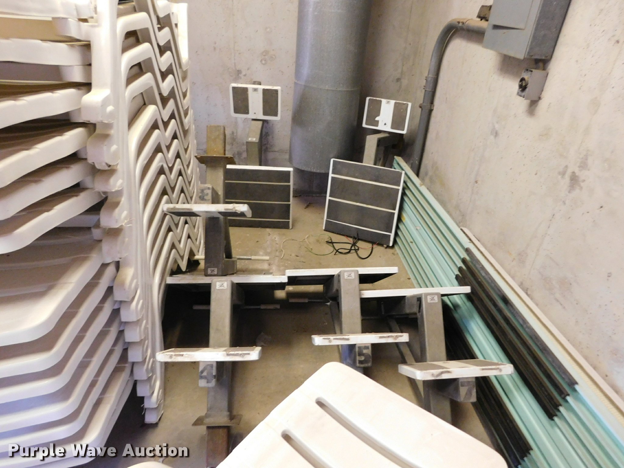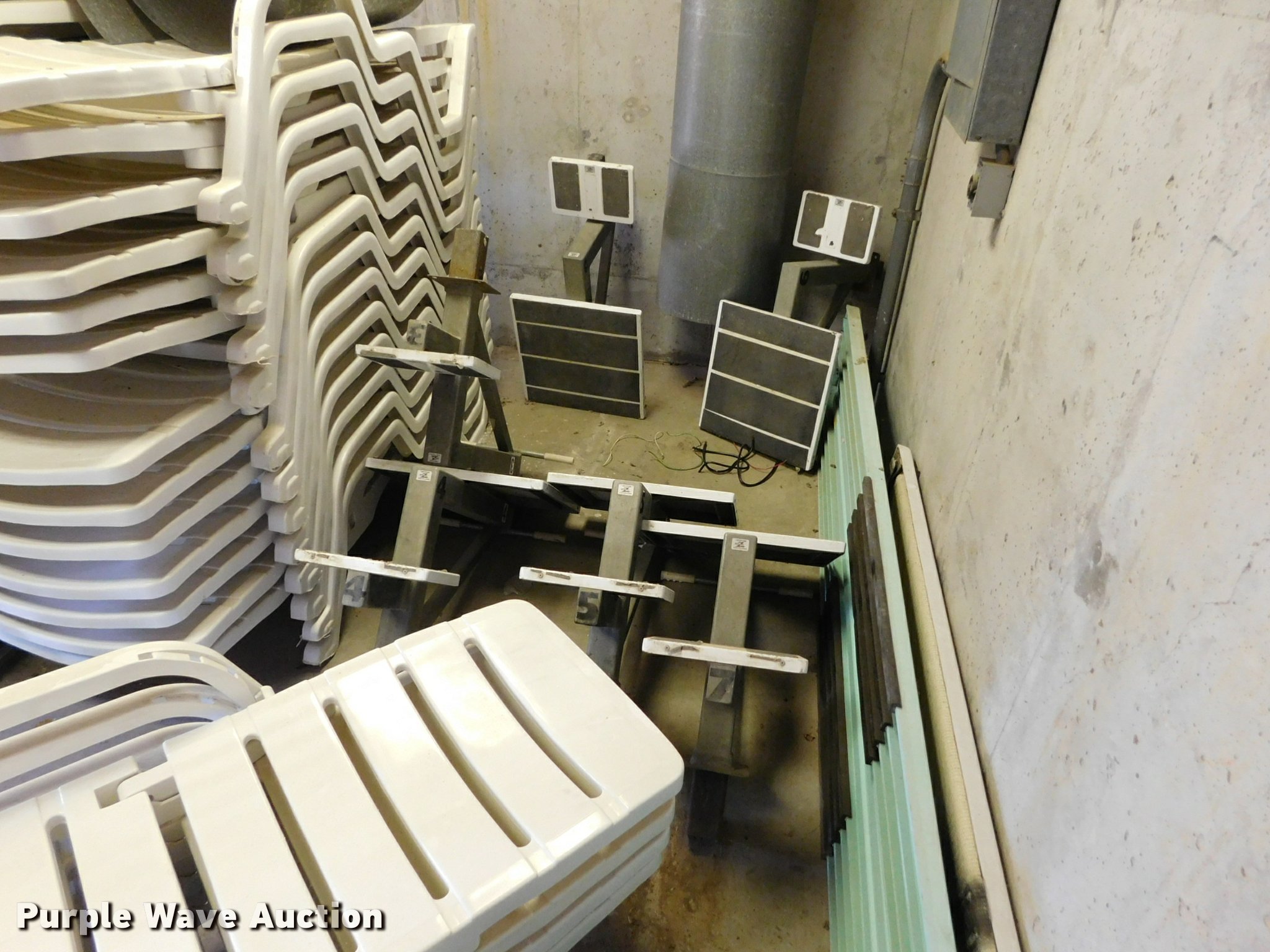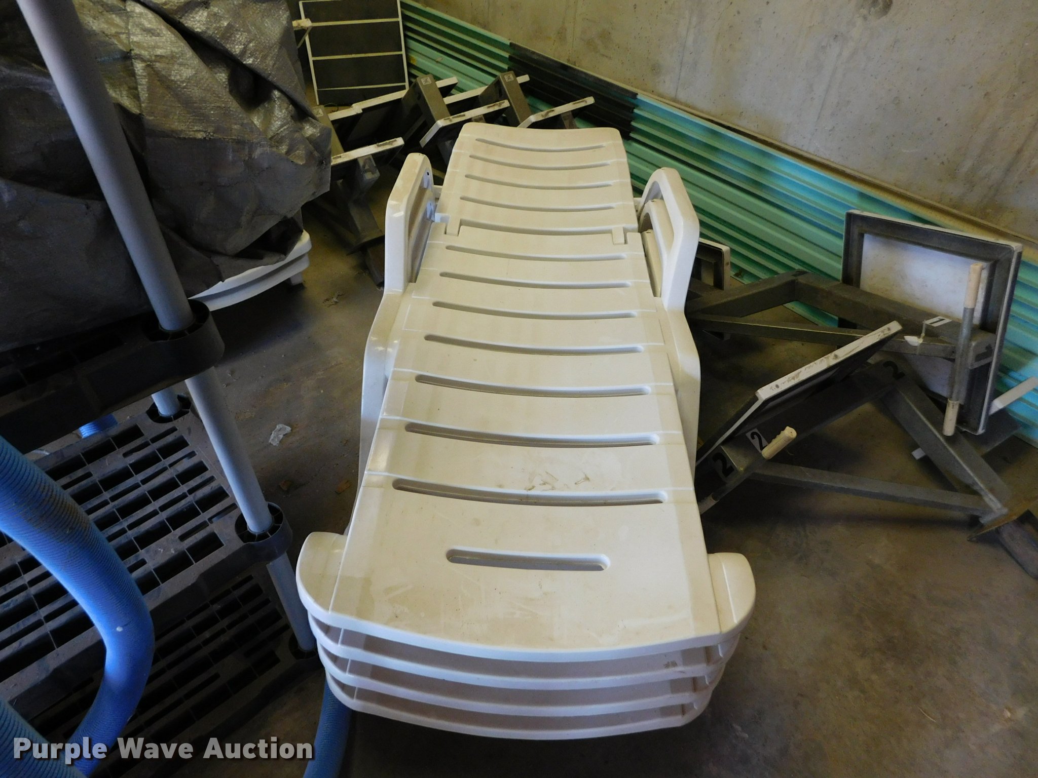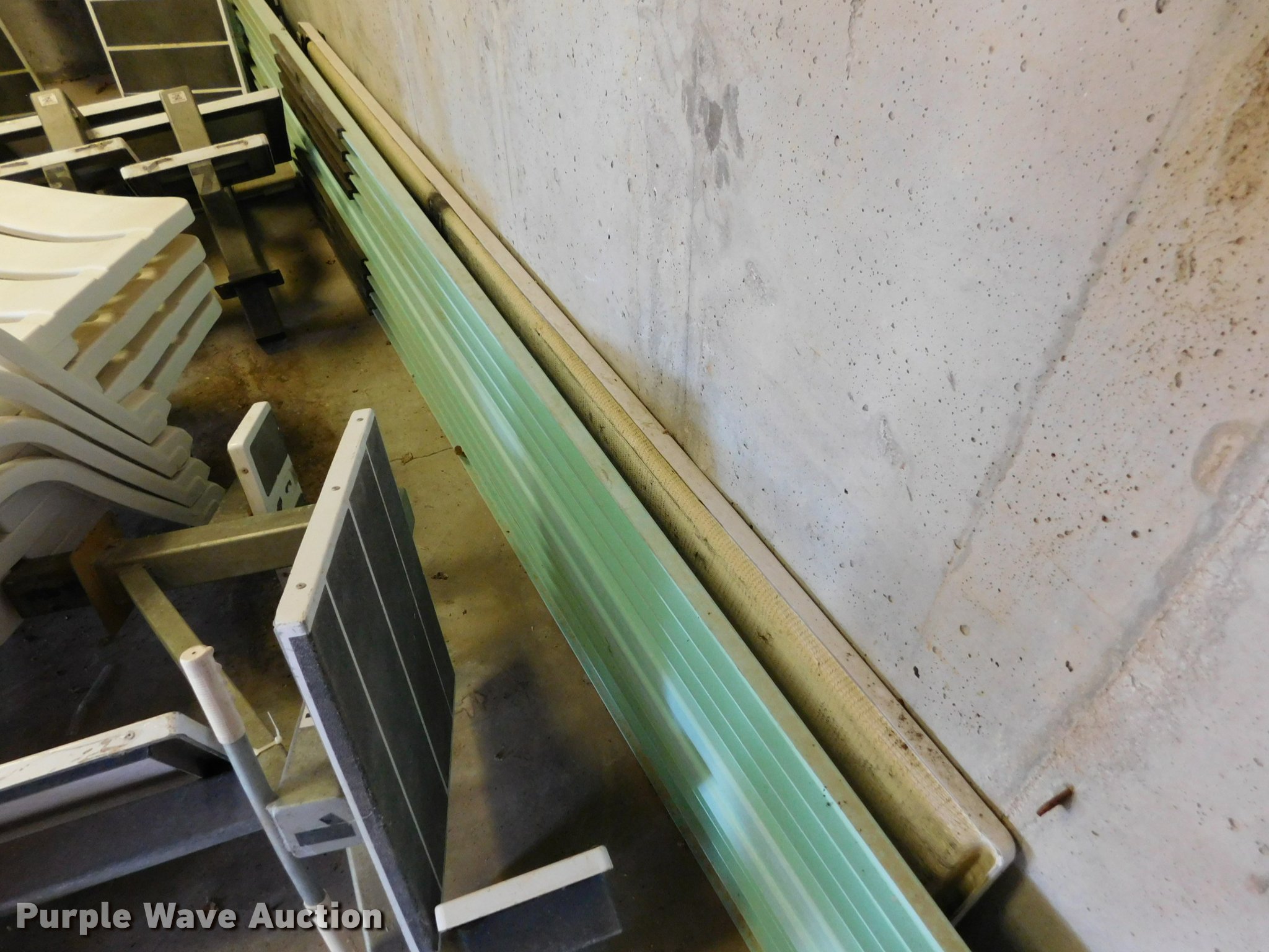 Purple Wave is selling a used Building Materials in Kansas. This item is a Pool supplies with the following: (6) 6' x 14" benches, (2) 4' x 2' benches, Tow hooks, Approximately six pool chairs, Approximately 17 lounge chairs, (2) diving boards, Pool stairs, (8) competition platforms