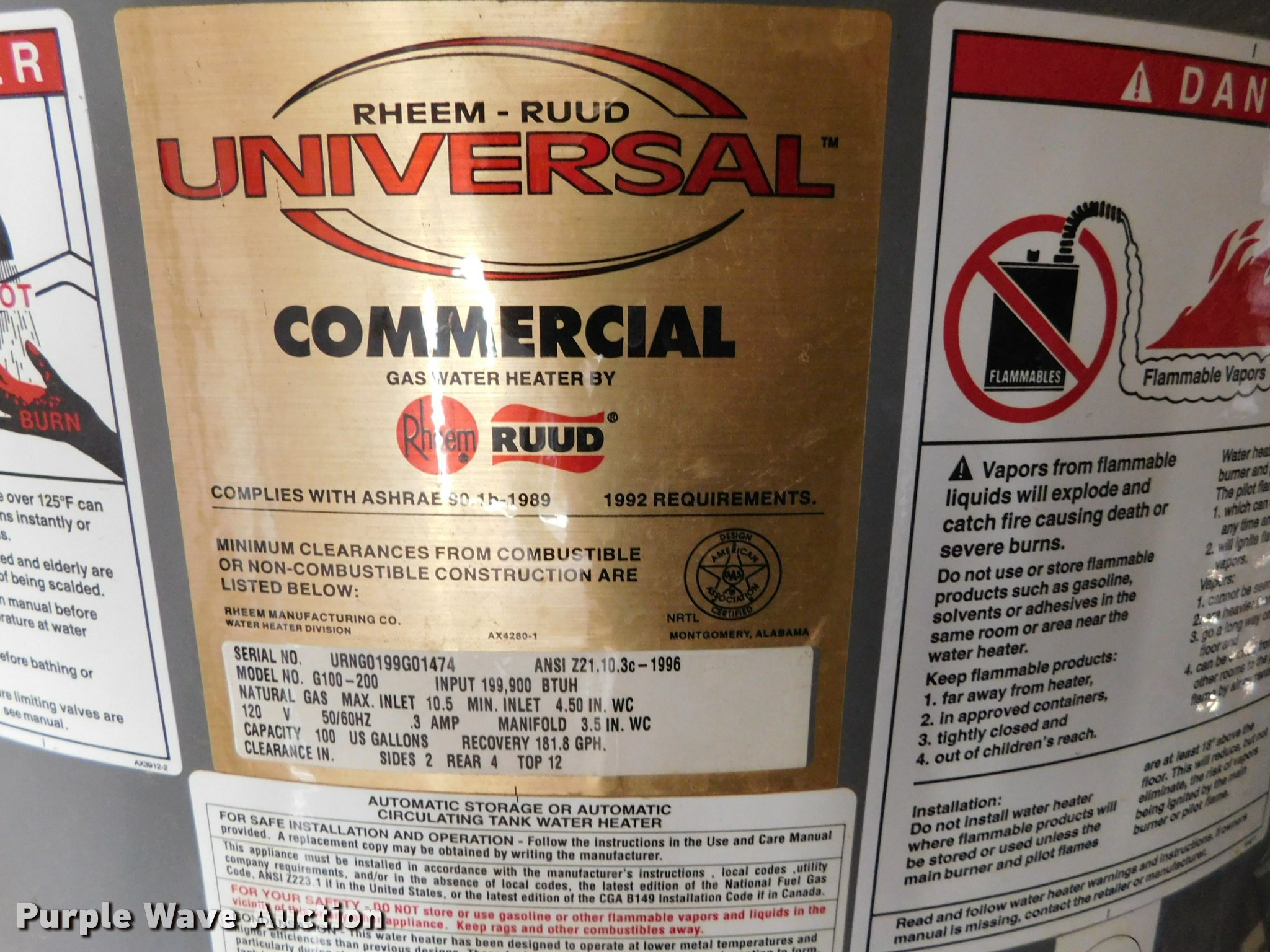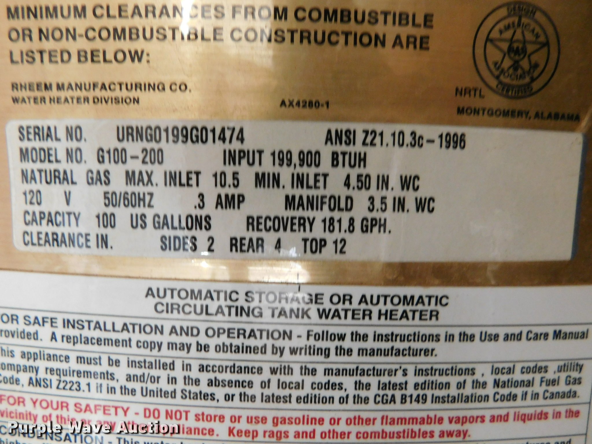 Purple Wave is selling a used Appliances in Kansas. This item is a Rehm Rudd G100-200 water heater with the following: Natural gas fired, 100 gallon capacity, 120V