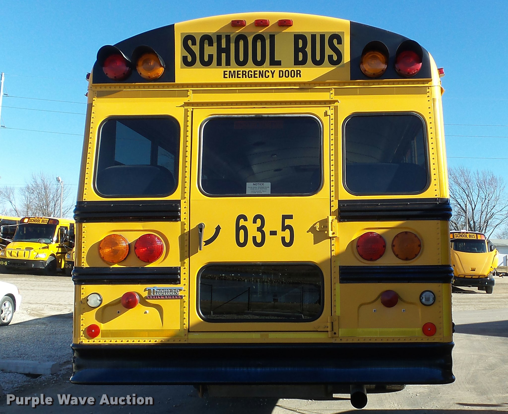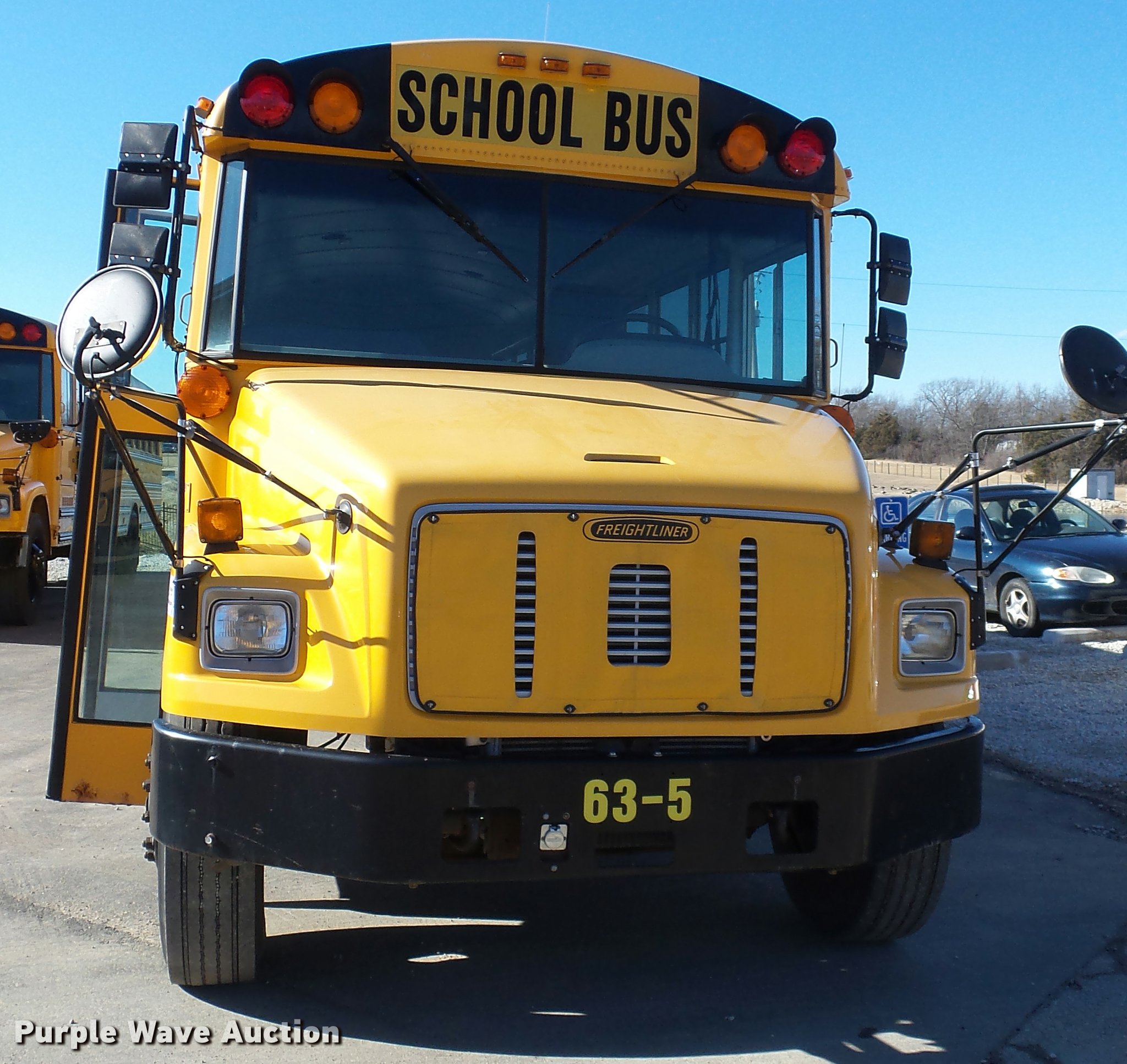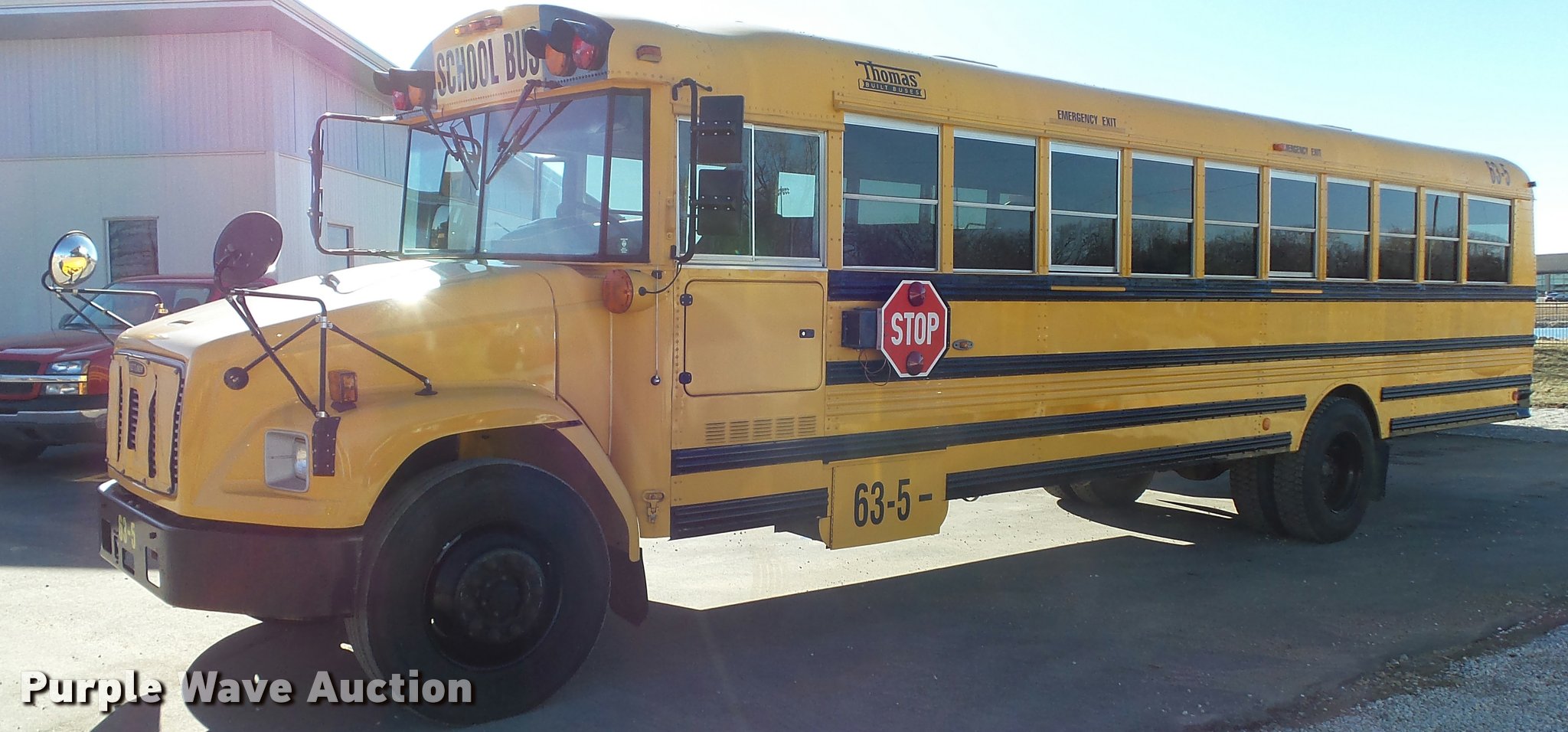 Purple Wave is selling a used Bus in Kansas. This item is a 2005 Freightliner FS65 Thomas school bus with the following: 150,547 miles on odometer, 7,866 hours on meter, Caterpillar C7 7.2L L6 turbo diesel engine, Allison 2000 automatic transmission, Single axle, Heat, Cruise, AM/FM/cassette, Heated mirrors, 65 passenger capacity, (2) child safety seats, 78" overhead space, Ceiling, rear, and side emergency egress, Lighted stop sign, Backup alarm, Block heater, Front and rear tow hooks, Hydraulic brakes, 254" wheelbase, 11R22.5 tires, GVWR 29,999 lbs, Leaks oil, Unit# 63-5