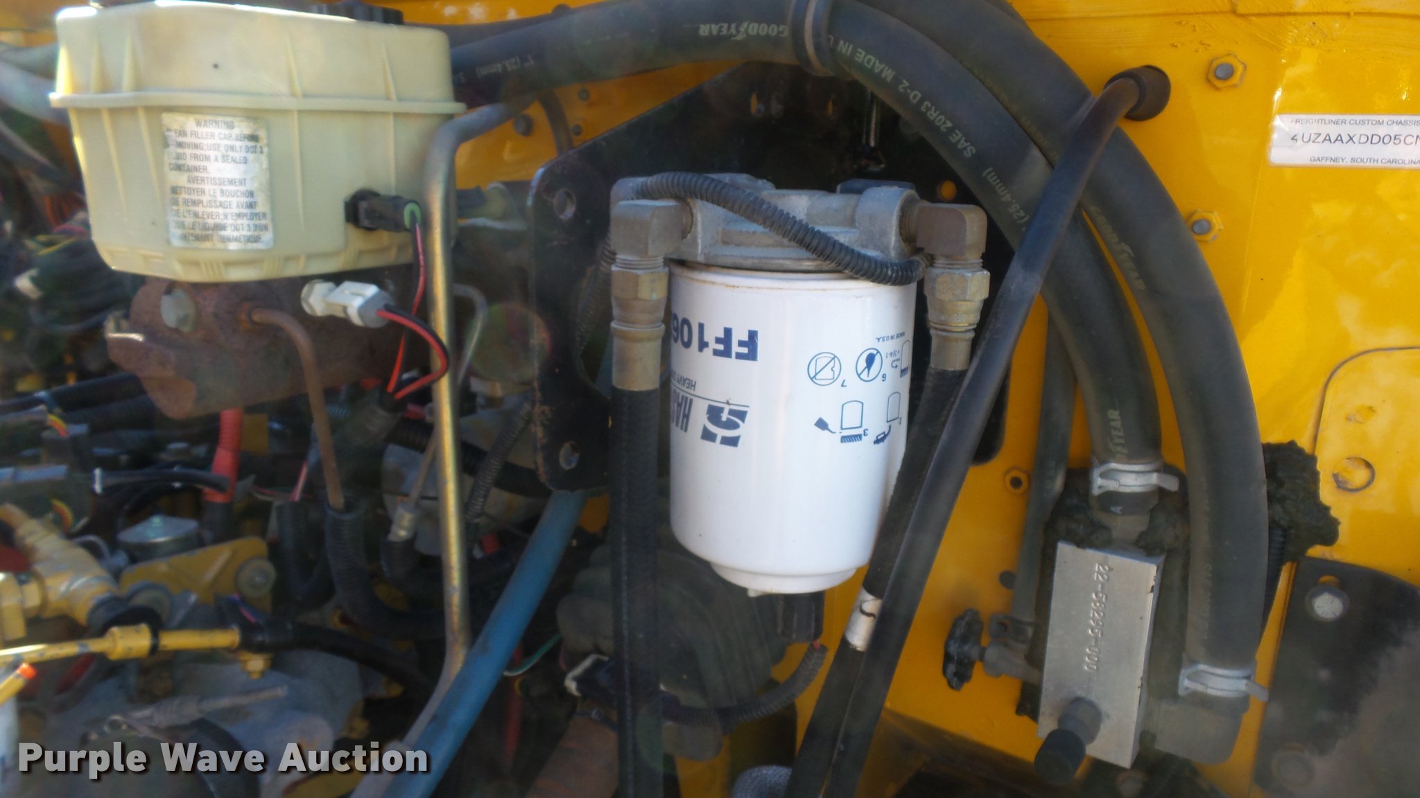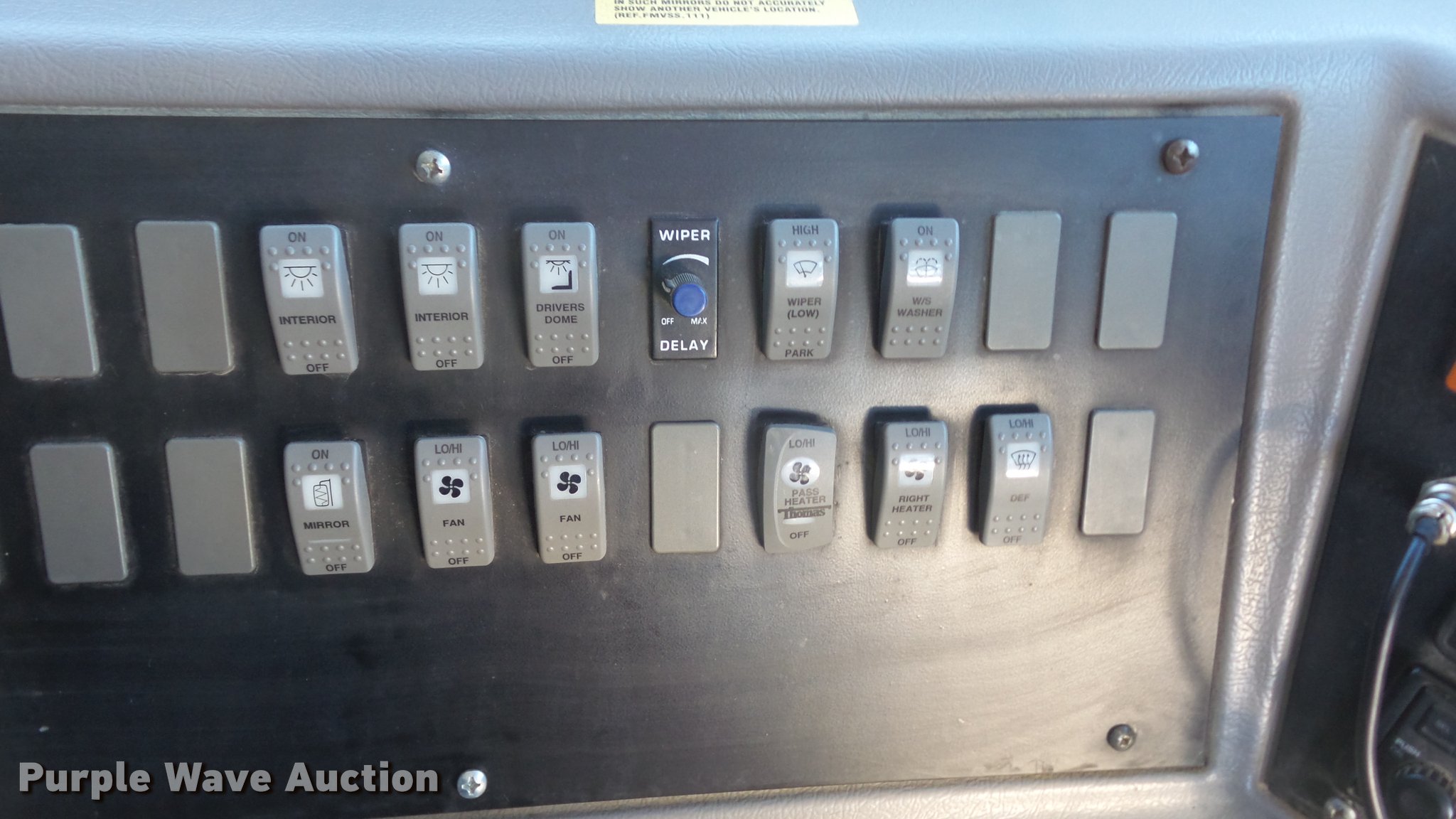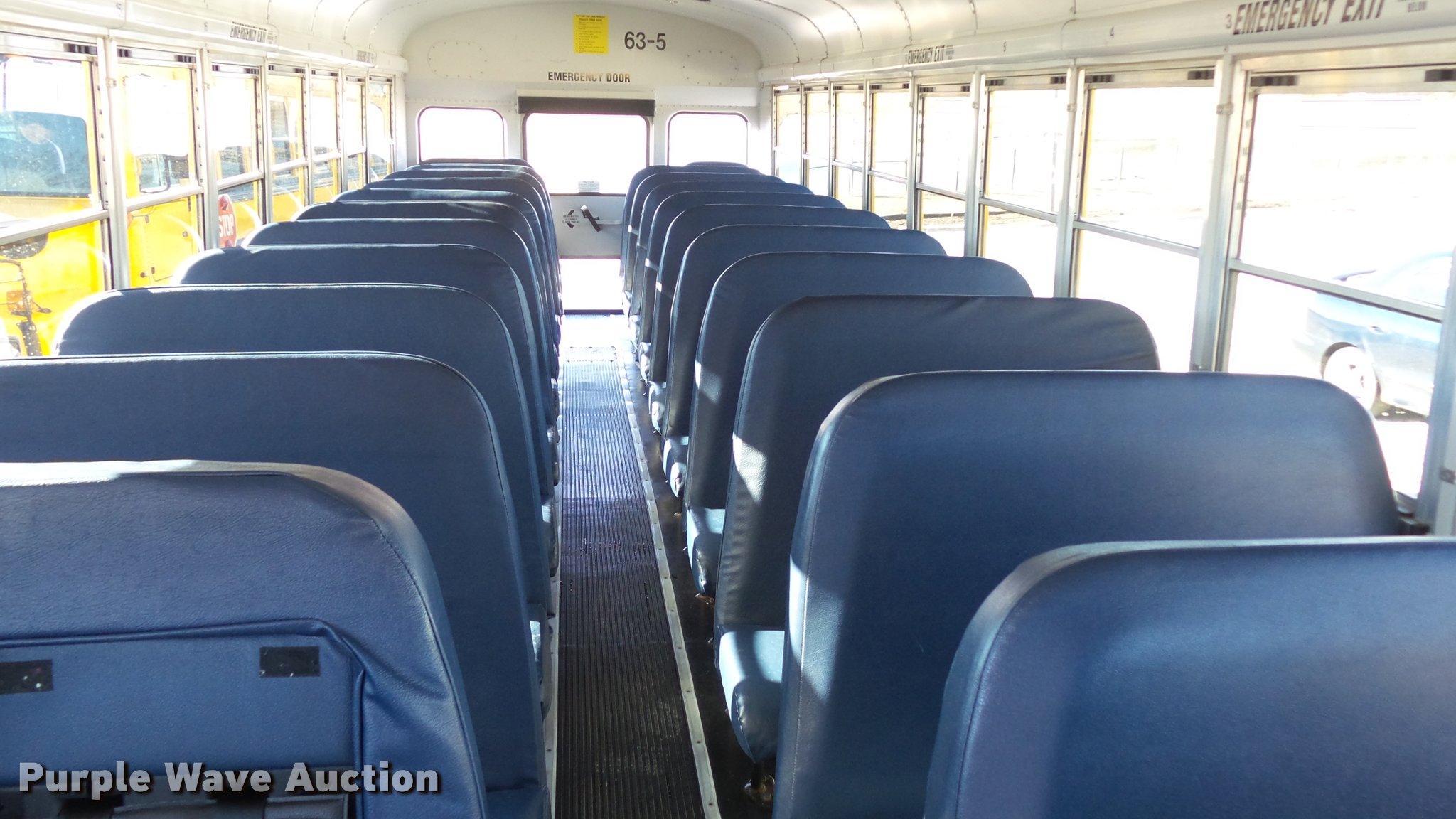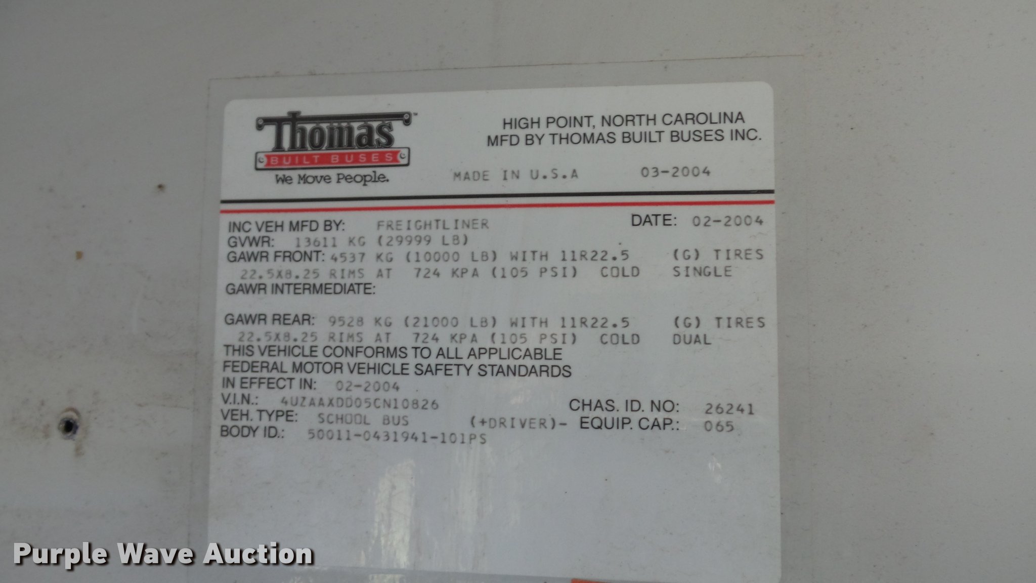 Purple Wave is selling a used Bus in Kansas. This item is a 2005 Freightliner FS65 Thomas school bus with the following: 150,547 miles on odometer, 7,866 hours on meter, Caterpillar C7 7.2L L6 turbo diesel engine, Allison 2000 automatic transmission, Single axle, Heat, Cruise, AM/FM/cassette, Heated mirrors, 65 passenger capacity, (2) child safety seats, 78" overhead space, Ceiling, rear, and side emergency egress, Lighted stop sign, Backup alarm, Block heater, Front and rear tow hooks, Hydraulic brakes, 254" wheelbase, 11R22.5 tires, GVWR 29,999 lbs, Leaks oil, Unit# 63-5