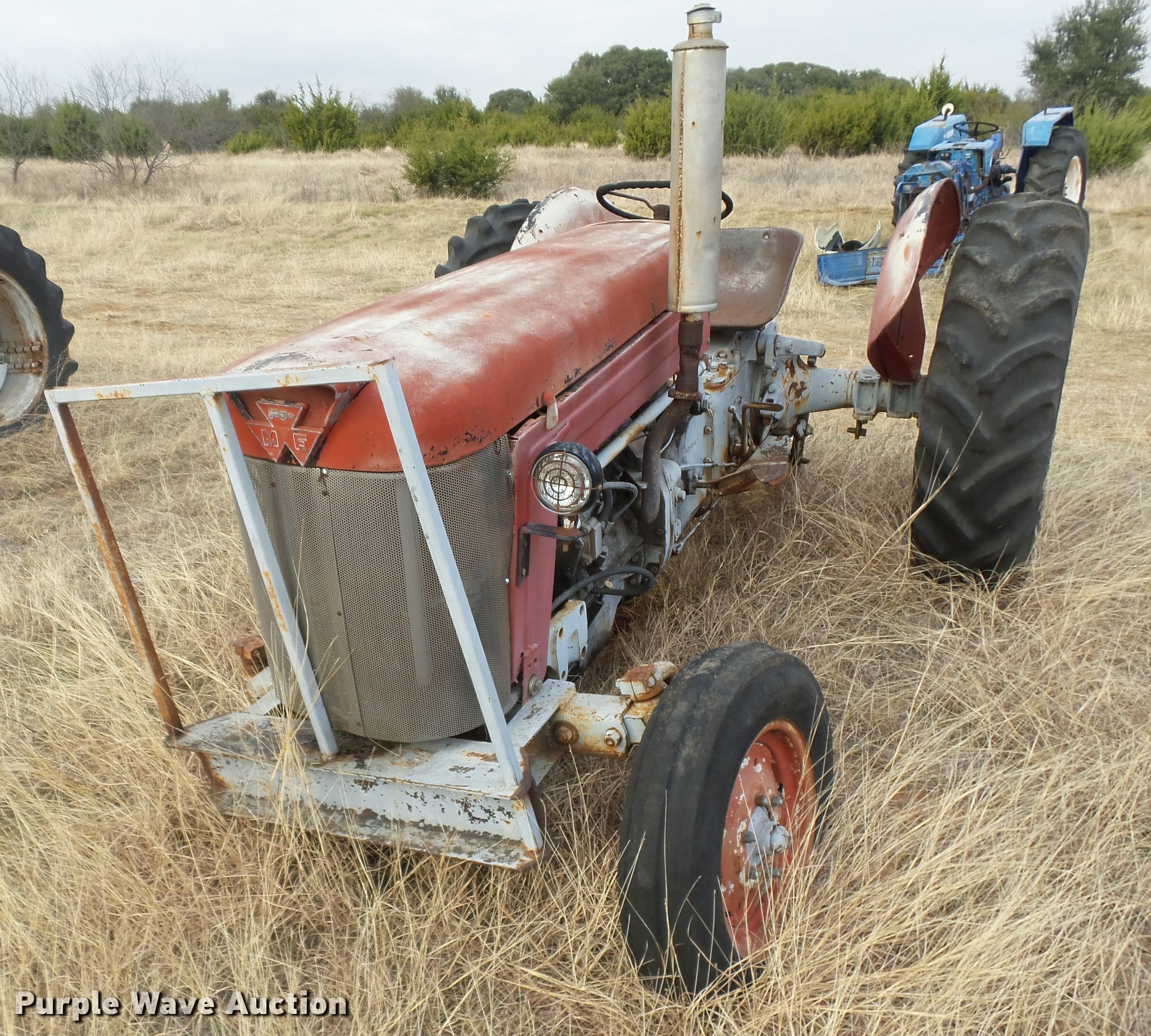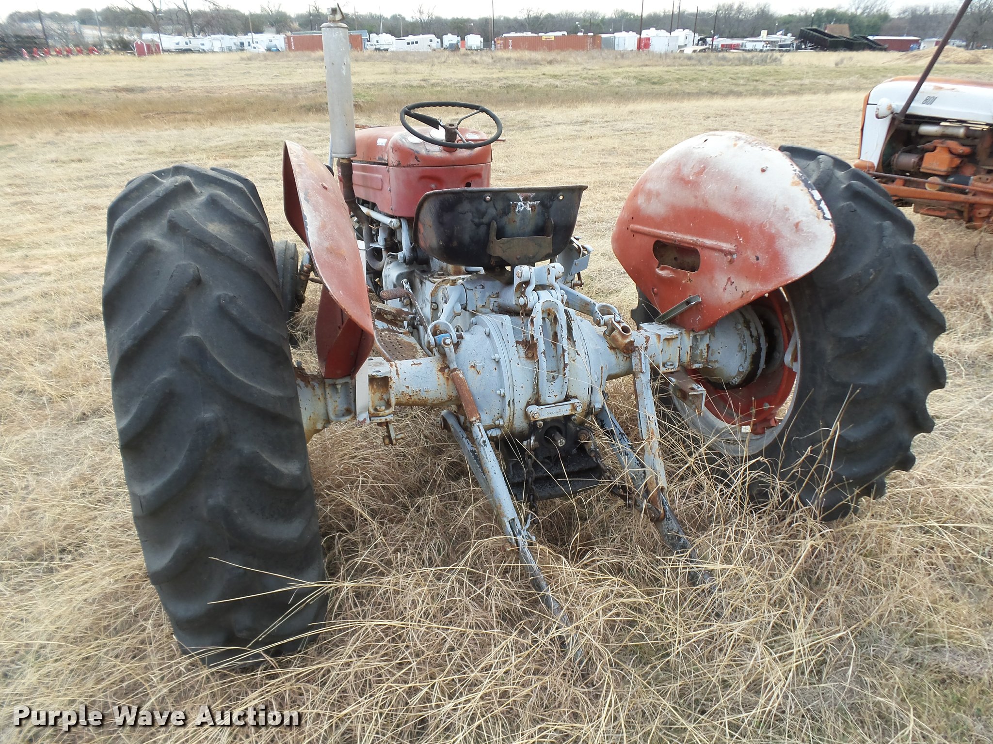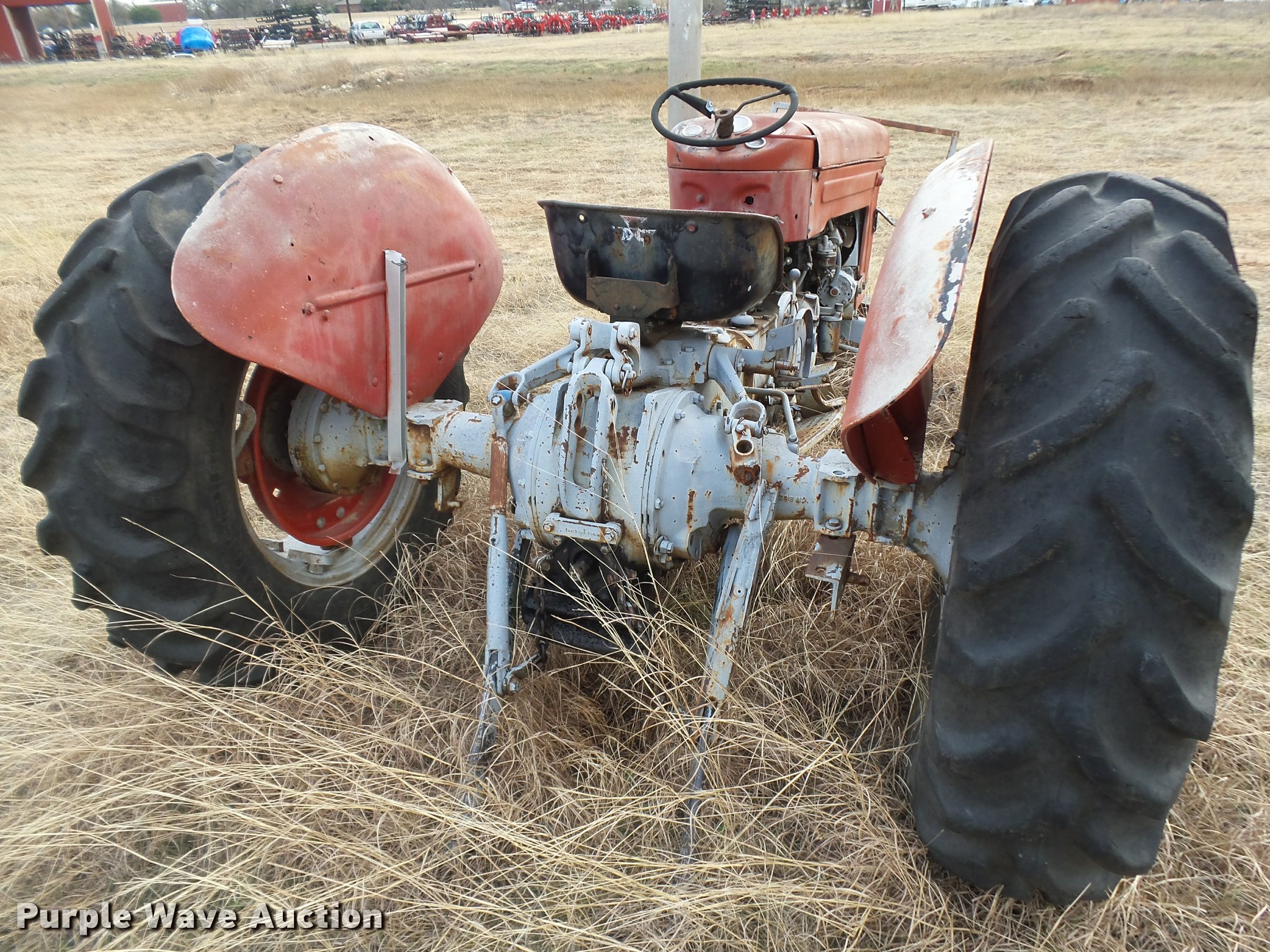 Purple Wave is selling a used Tractor in Texas. This item is a Massey-Ferguson tractor with the following: Three point, 7.50-16 front tire, 13.6-28 rear tires, One tire missing, Non-operational unit