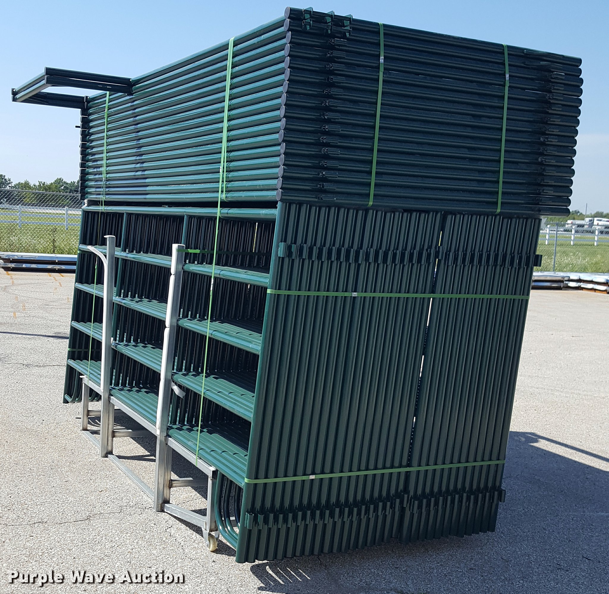 Purple Wave is selling a used Livestock Equip. in Kansas. This item is a (46) five bar corral panels with the following: (44) 12' x 5.5' panels, (2) 12' x 5.5' entrance panels, Powder coated, Unused
