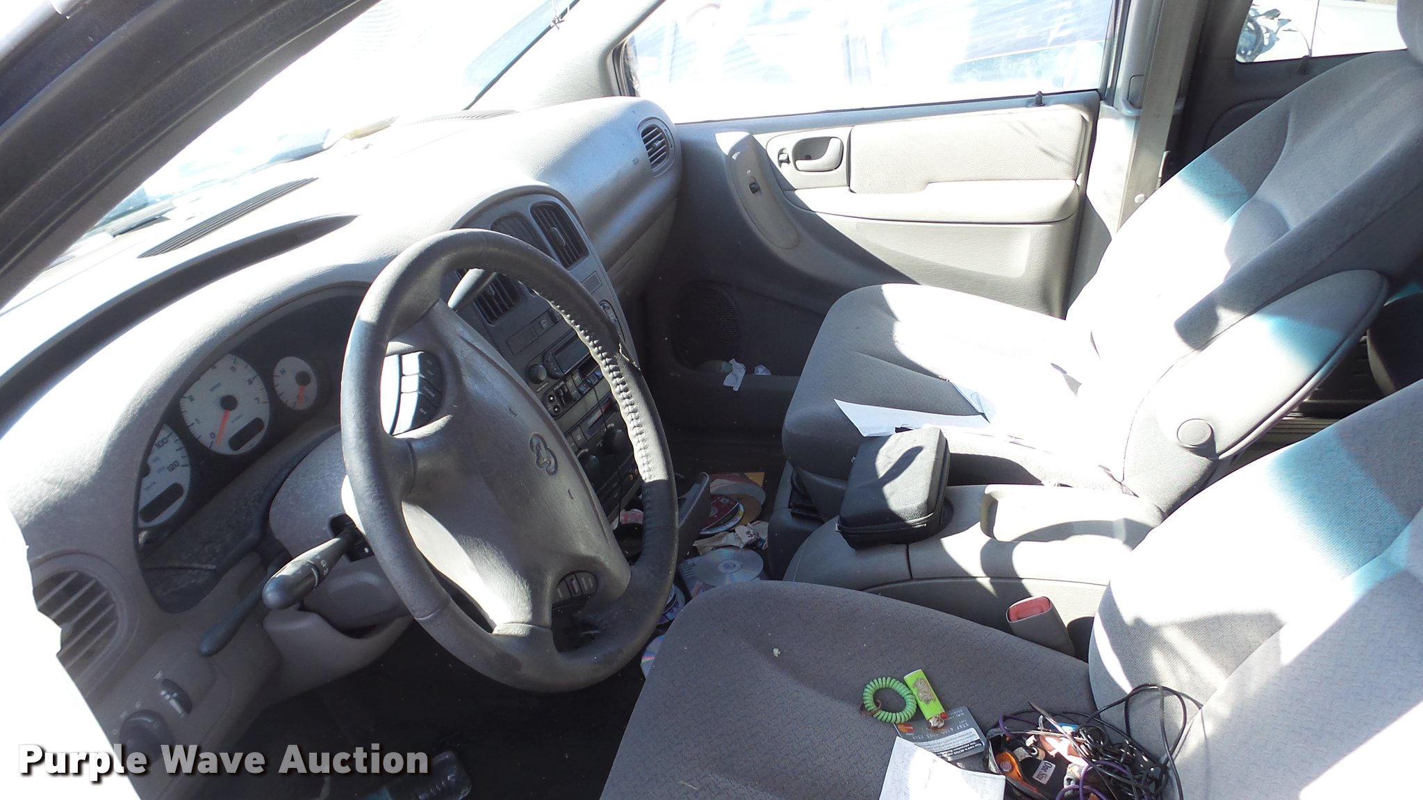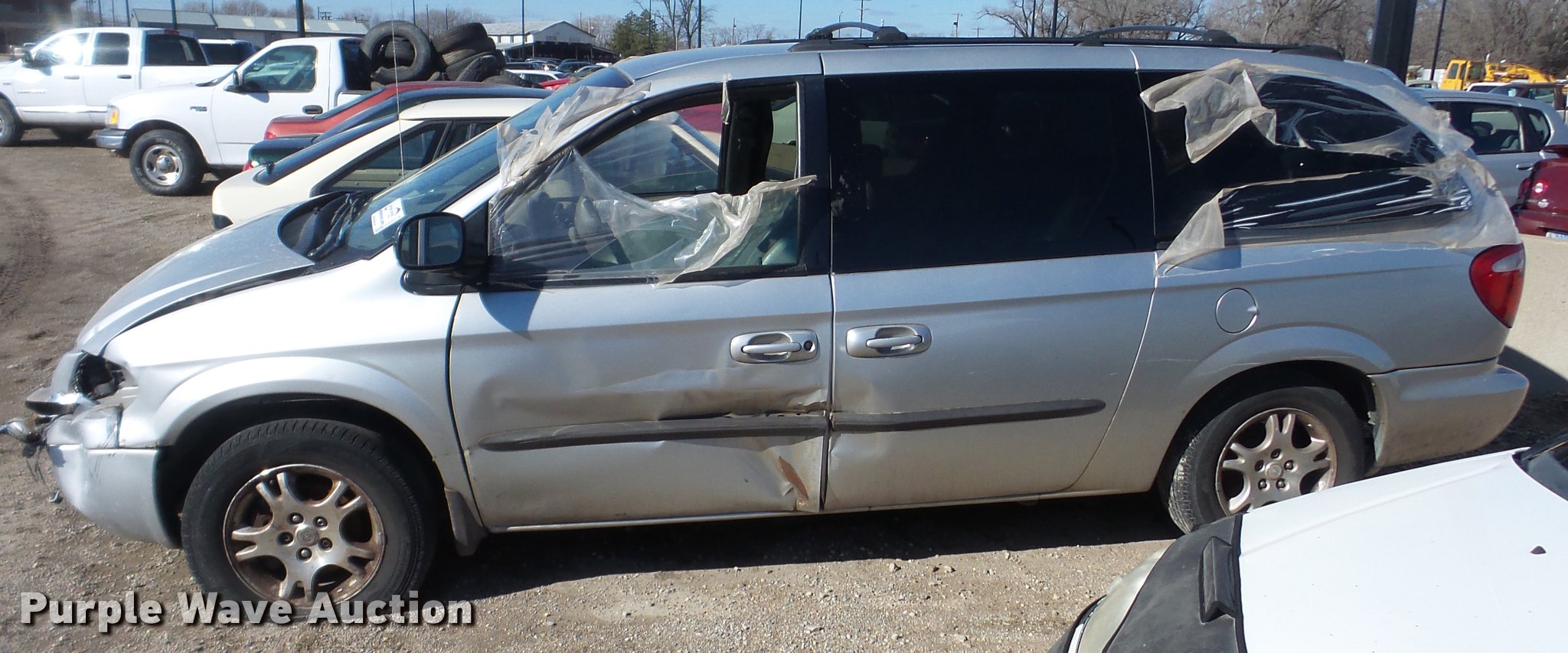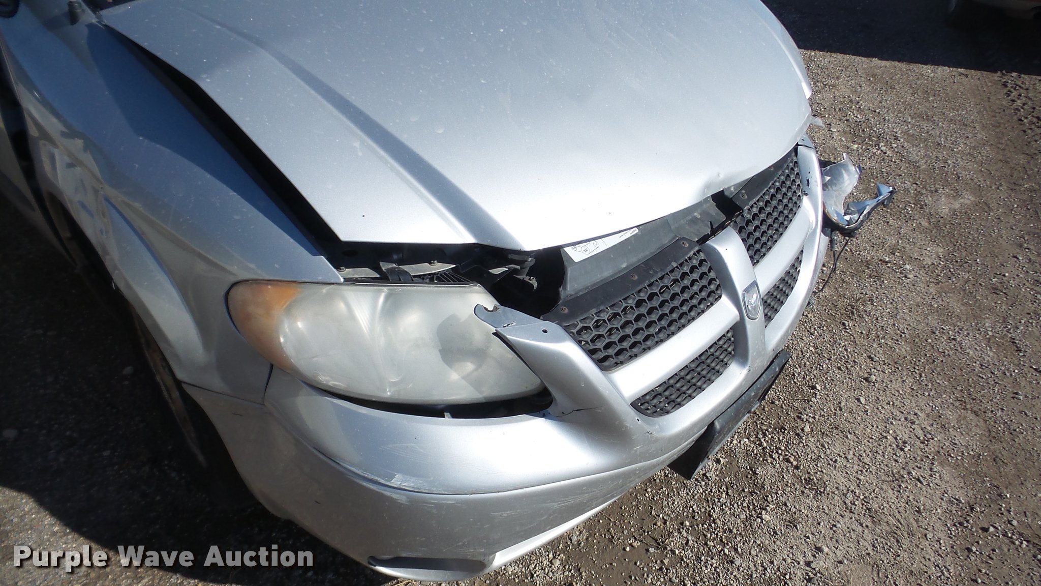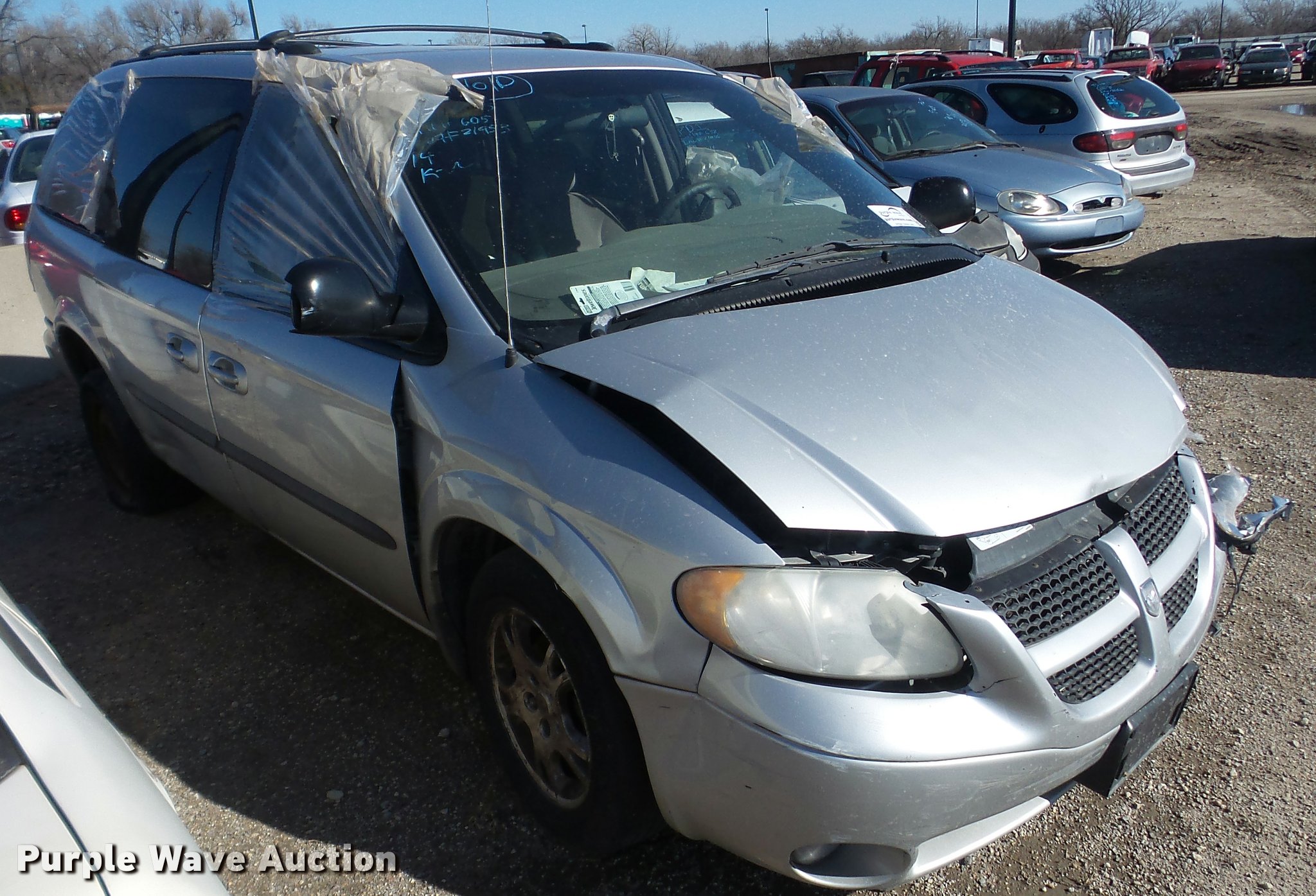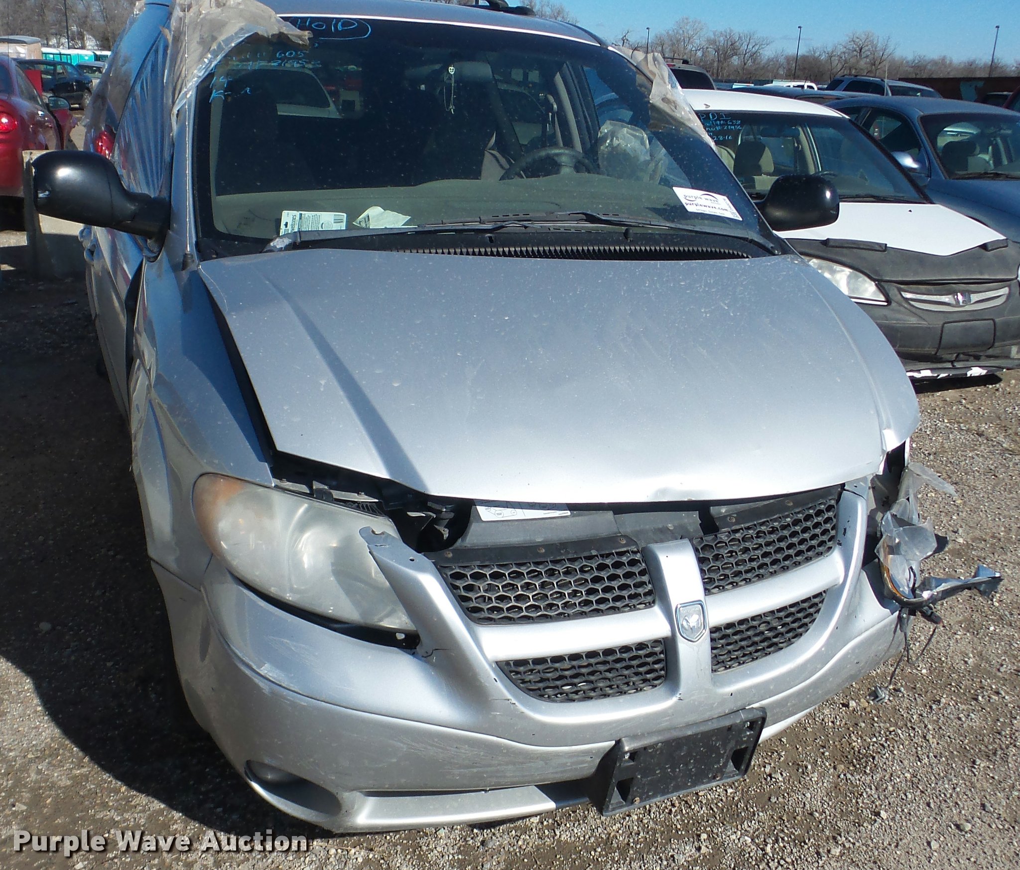 Purple Wave is selling a used Passenger Vehicle in Kansas. This item is a 2003 Dodge Grand Caravan SUV with the following: Unknown miles on odometer, 3.8L V6 OHV 12V gas engine, Automatic transmission, AC and heat, Tilt, Cruise, AM/FM/CD, Power windows, locks, and mirrors, Cloth interior, 215/65R16 tires, Front end damage, Hood will not open, Case# 16C067943