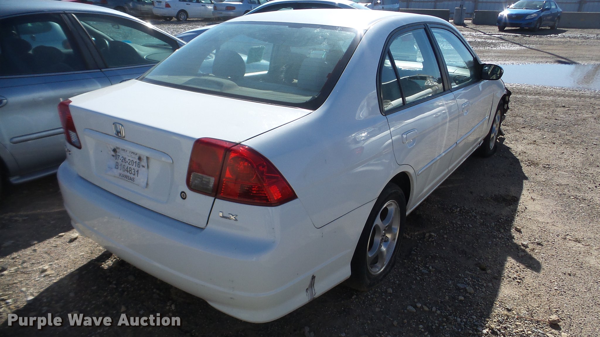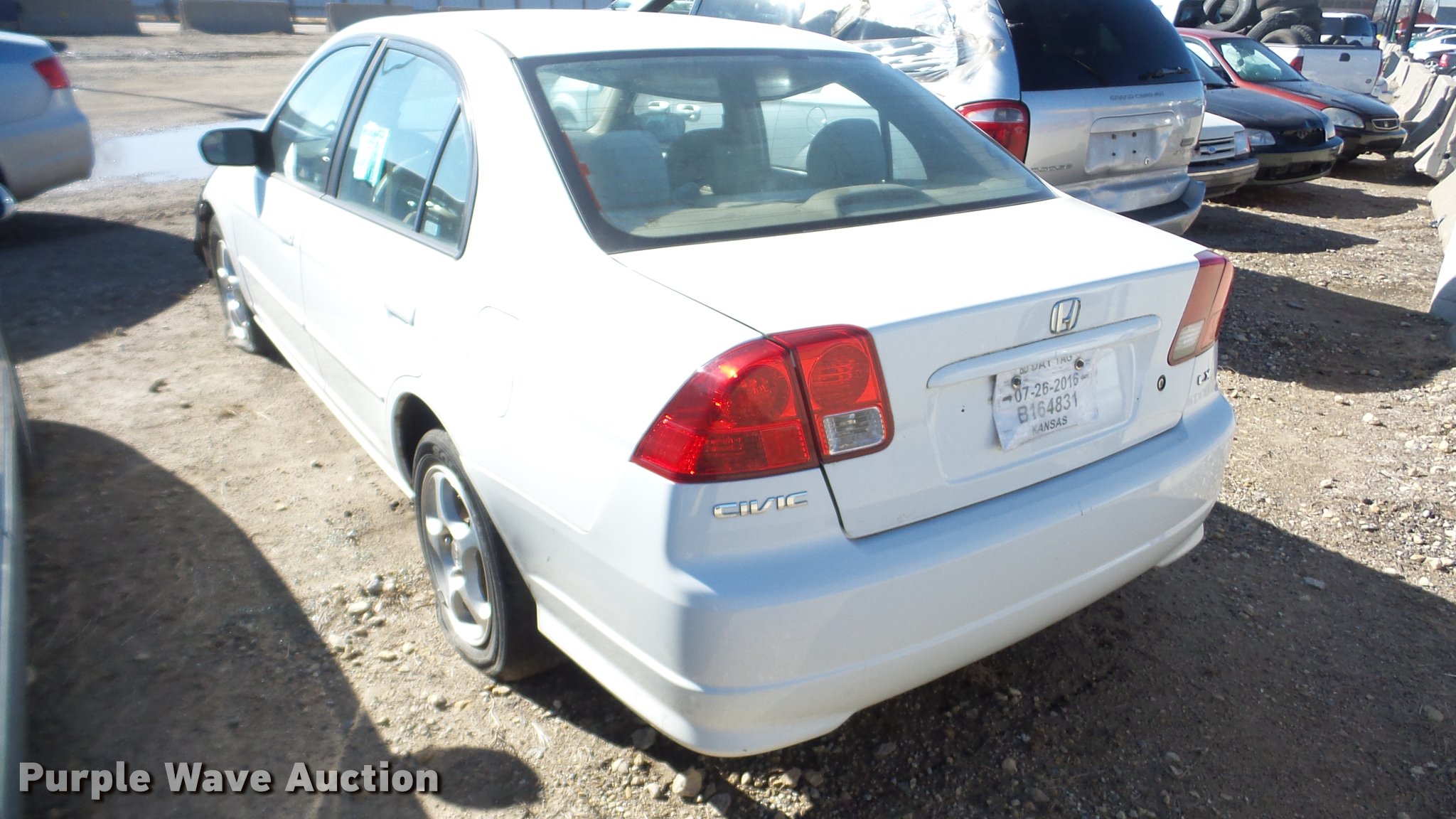 Purple Wave is selling a used Passenger Vehicle in Kansas. This item is a 2004 Honda Civic with the following: Unknown miles on odometer, 1.7L L4 SOHC 16V gas engine, Automatic transmission, AC and heat, Tilt, Cruise, AM/FM/CD, Power windows, locks, and mirrors, Cloth interior, 195/60R15 tires, Doors locked, Cracked windshield, Flat tires, Case# 16C068217