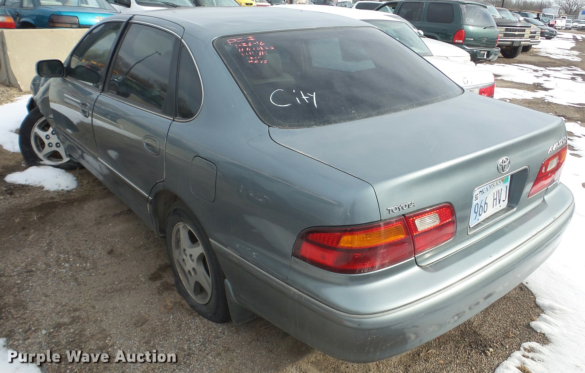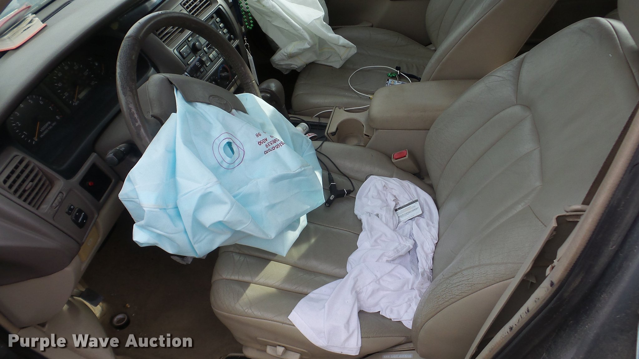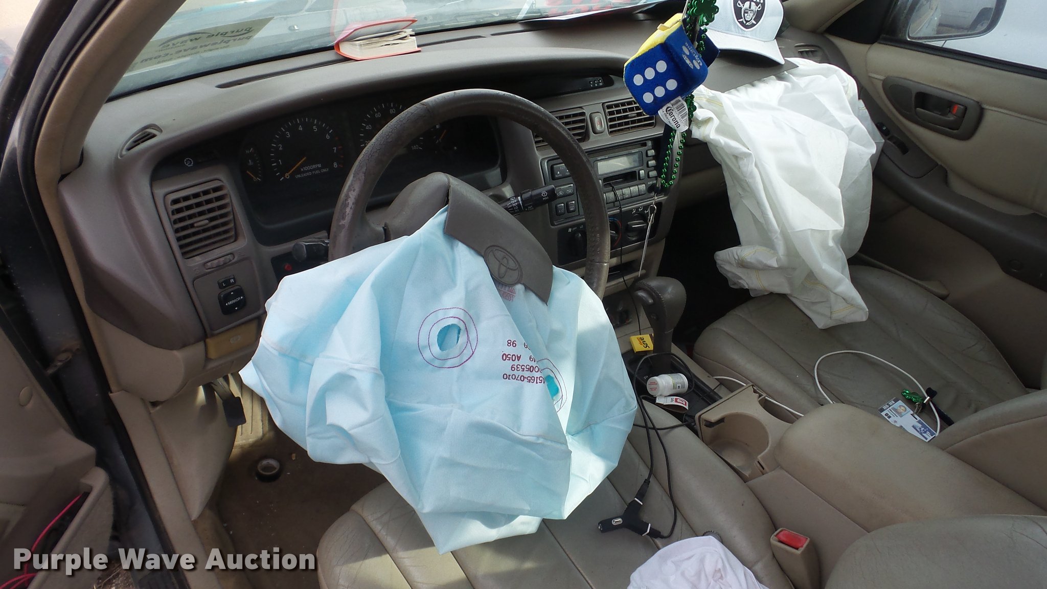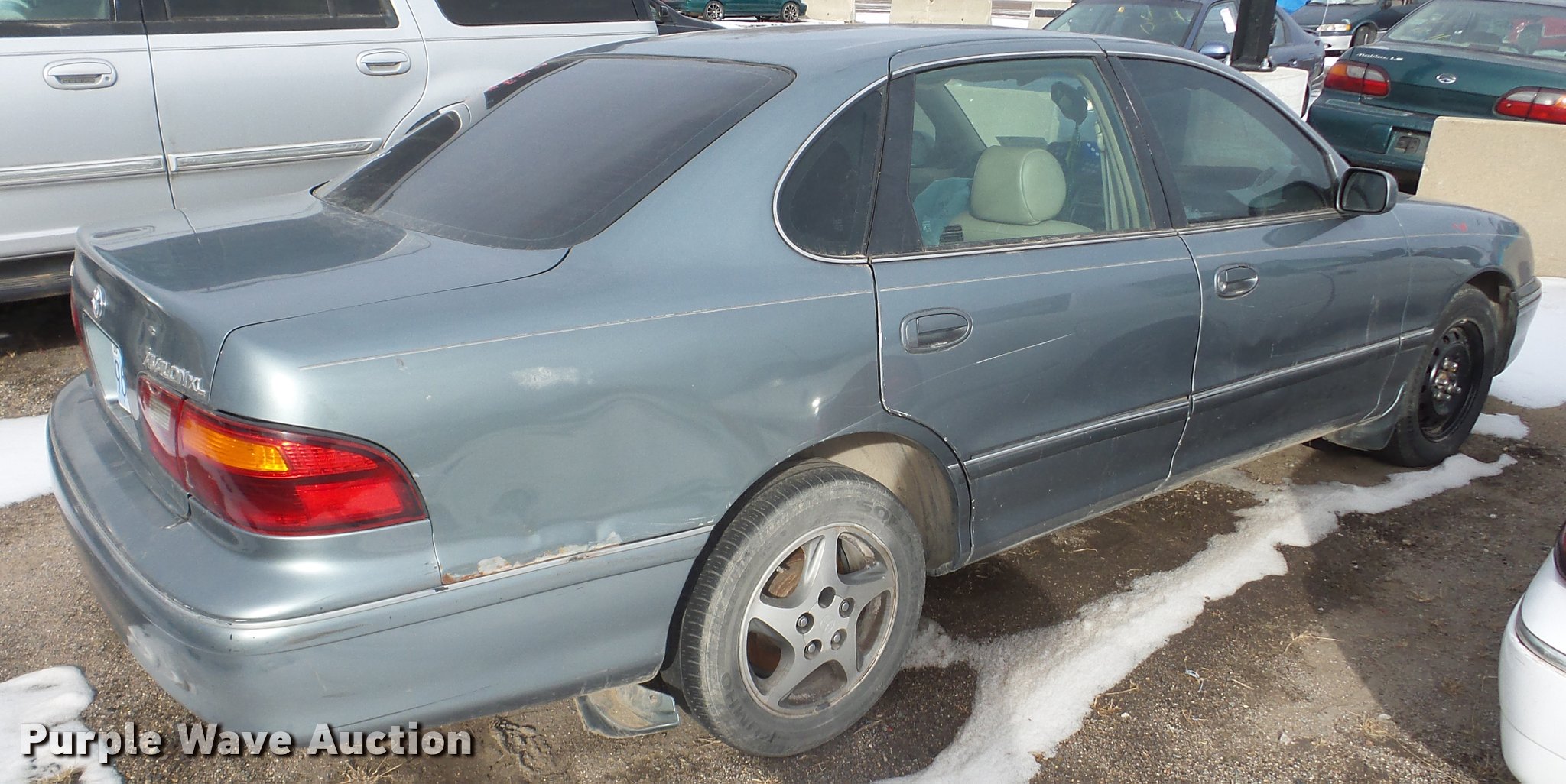 Purple Wave is selling a used Passenger Vehicle in Kansas. This item is a 1999 Toyota Avalon with the following: Unknown miles on odometer, 3.0L V6 SOHC 24V gas engine, Automatic transmission, AC and heat, Tilt, Cruise, AM/FM/cassette, Power windows, locks, and mirrors, Vinyl interior, Sunroof, 205/65R15 tires, Rust, Front end damage, Front driver's side wheel damaged, Air bag deployed, Cracked windshield, Case# 16C067587