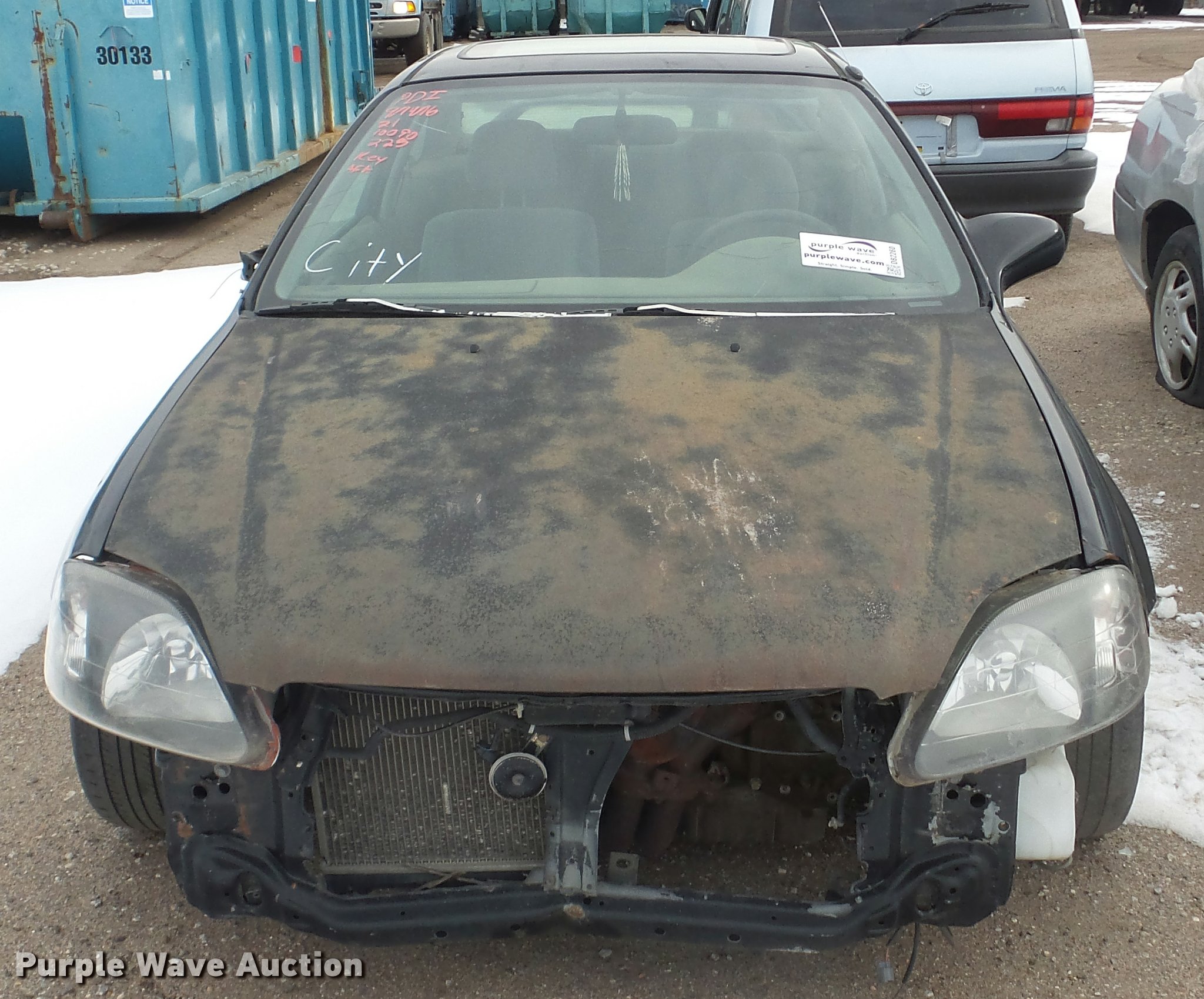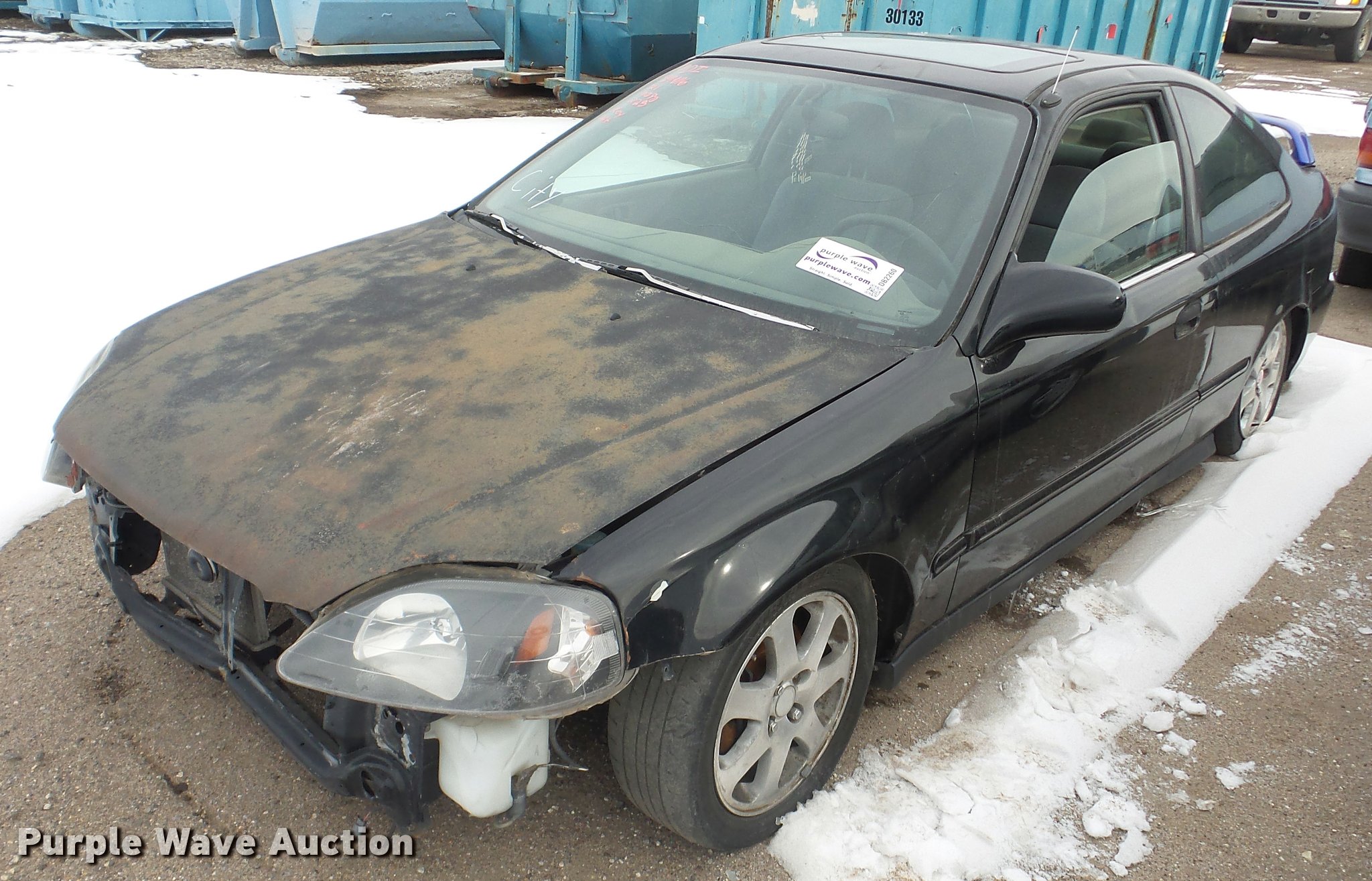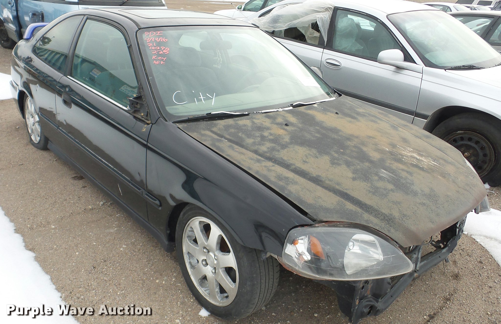 Purple Wave is selling a used Passenger Vehicle in Kansas. This item is a 2000 Honda Civic with the following: 188,668 miles on odometer, 1.6L L4 SOHC 16V gas engine, Five speed manual transmission, AC and heat, AM/FM/CD, Power windows, locks, and mirrors, Cloth interior, Sunroof, 185/55R15 tires, Cracked windshield, Rust, Front bumper missing, Mismatched paint, Hood will not open, Passenger side mirror missing, Case# 16C064535